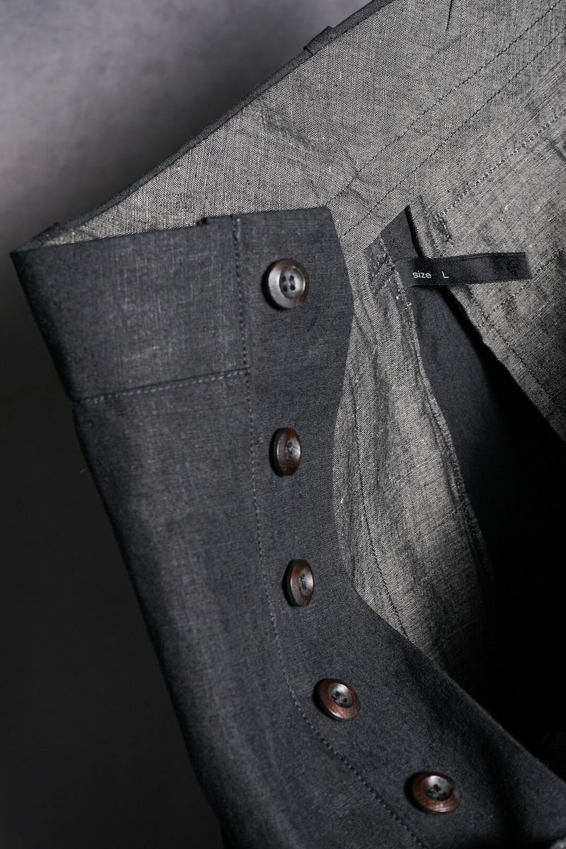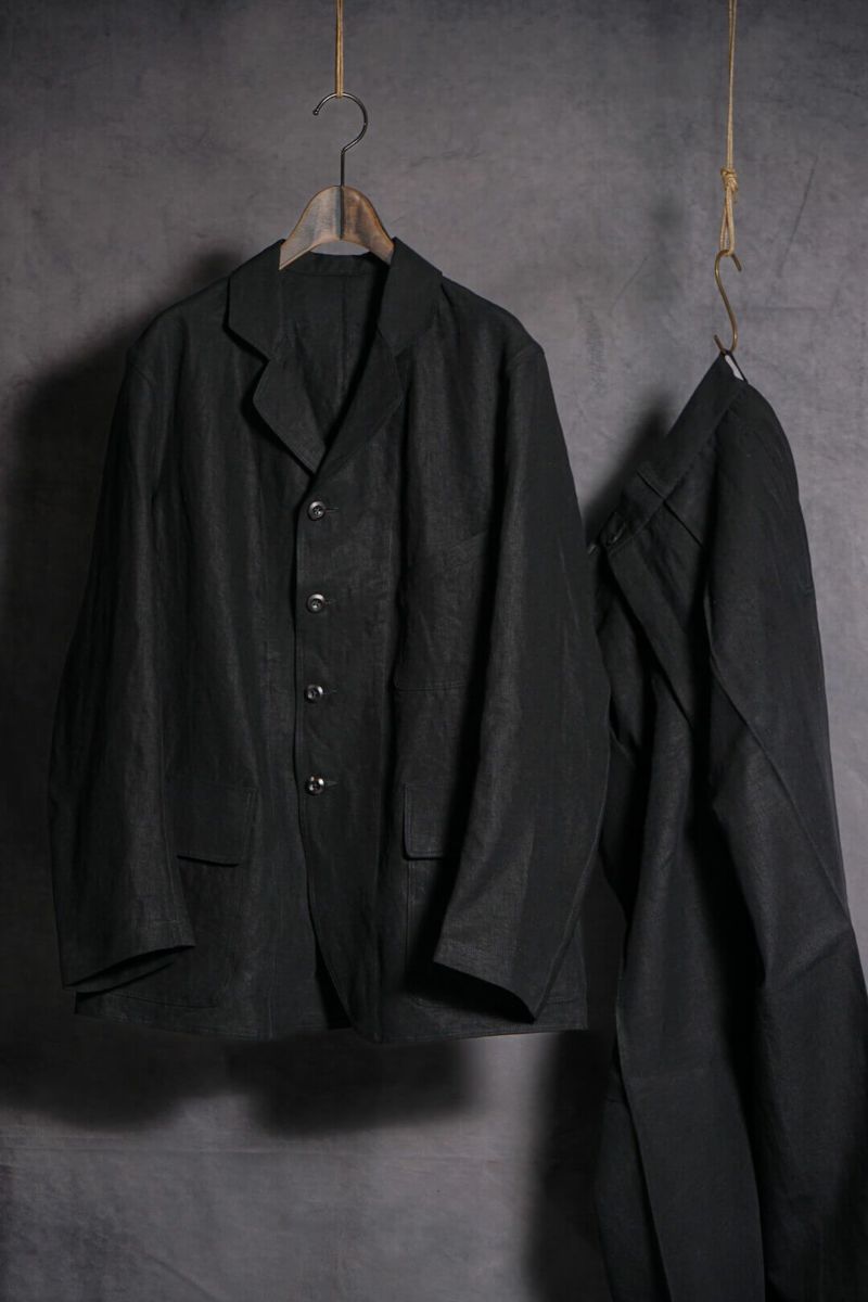素材は、強いハリ感を持つ高密度リネン生地を採用。リネン生地は生産数が激減しており、こちらも今後の再生産が無い貴重な生地です。ボタンは、パリの倉庫で発掘した1950年代のデッドストックウッドボタンを使用。