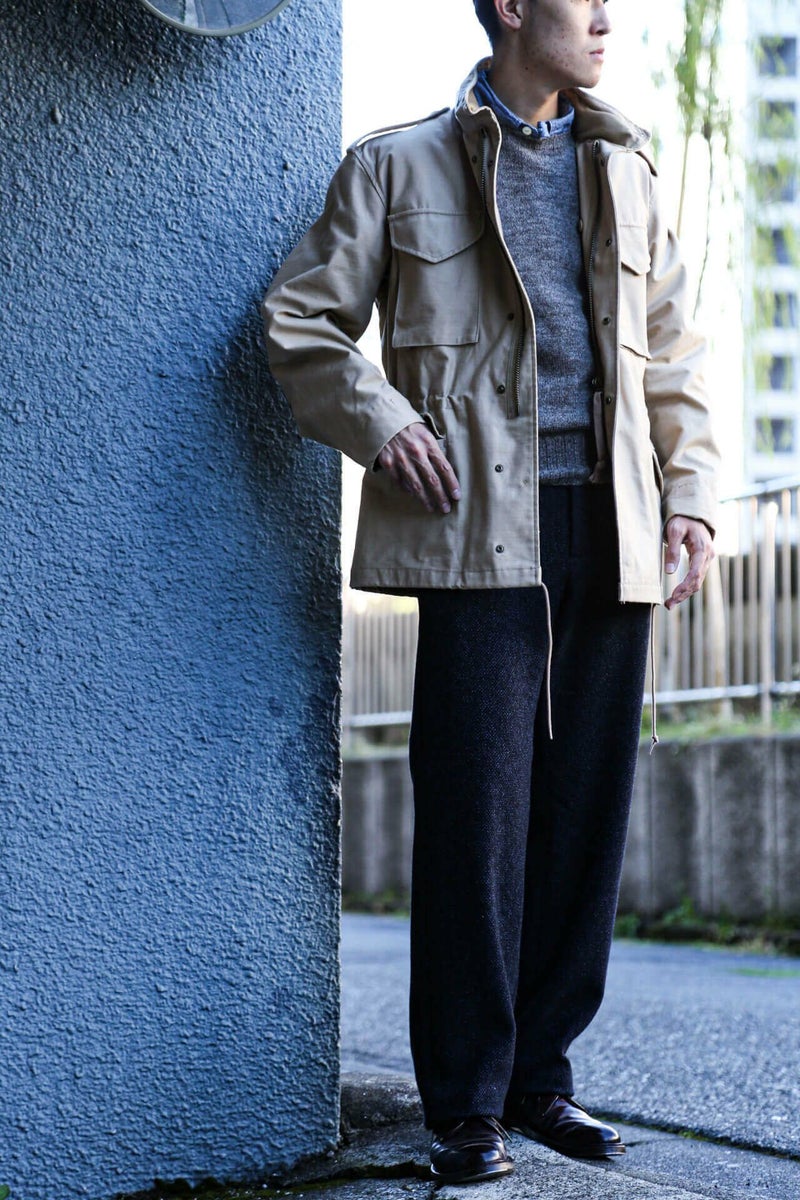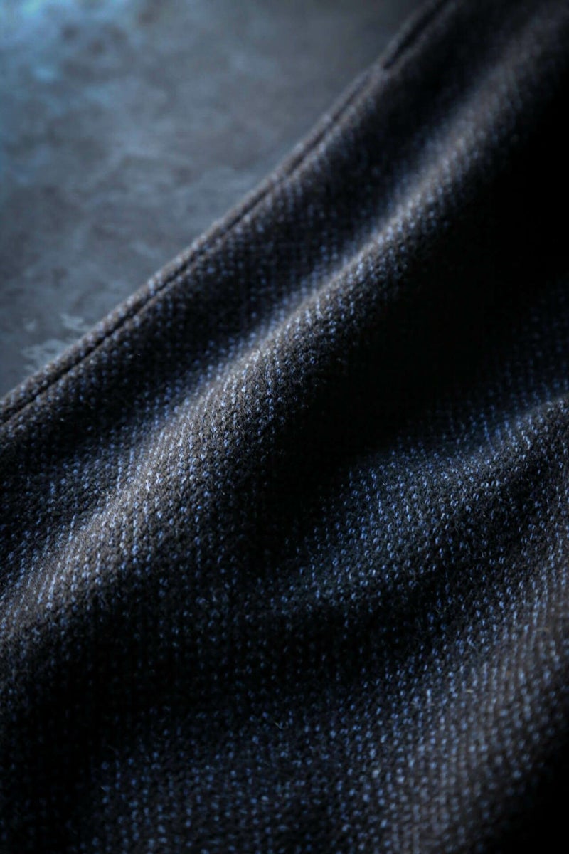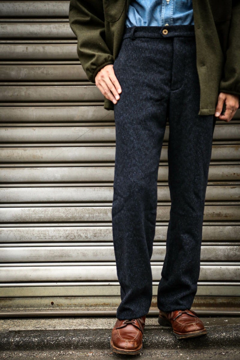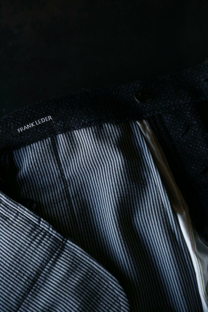 腰元から裾にかけて緩やかなテーパードがかかる非常に綺麗なシルエットで履けるトラウザーです。 生地はMOUNTAIN WOOLという肉厚な生地を使用。 刺子を彷彿させるようなこちらの生地は、肌との摩擦でチクチクするような感覚は一切なく、メルトン生地のような非常に保温性が高いかつ、肌あたりの良い生地です。 ポケットのスレキにはGRAY × CHARCOALのストライプを採用。 細部まで抜かりない拘りを感じる1着です。 表地 : WOOL 100% ※こちらの商品はブログでも詳しくご紹介しております。 https://archstyle.tv/tokyo/ FRANK LEDER / MOUNTAIN WOOL TROUSER Price ¥64,900-(税込)