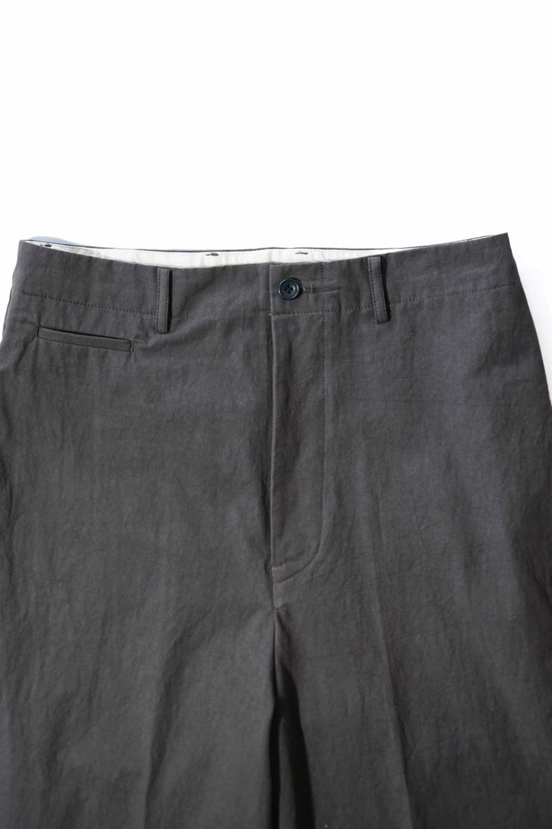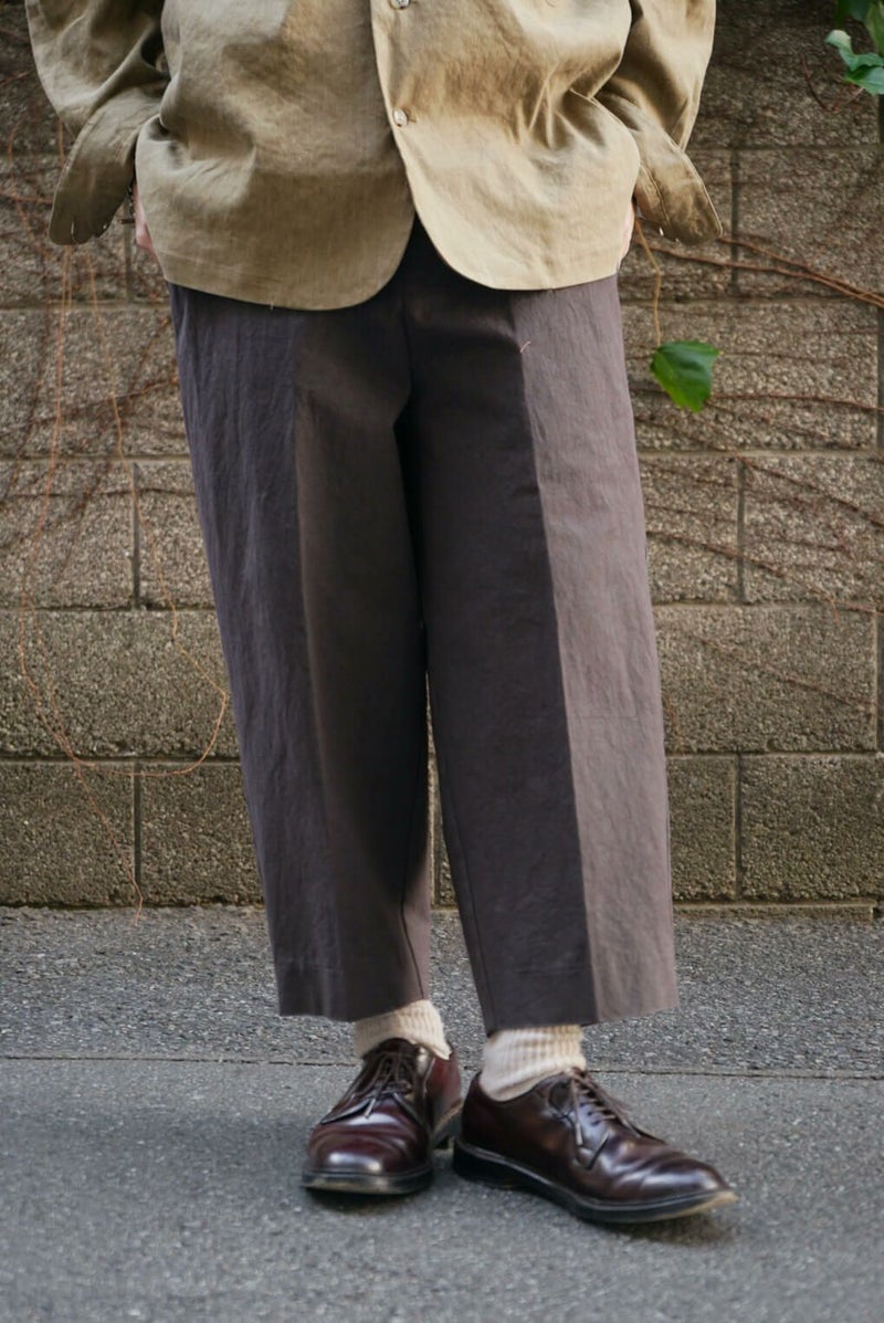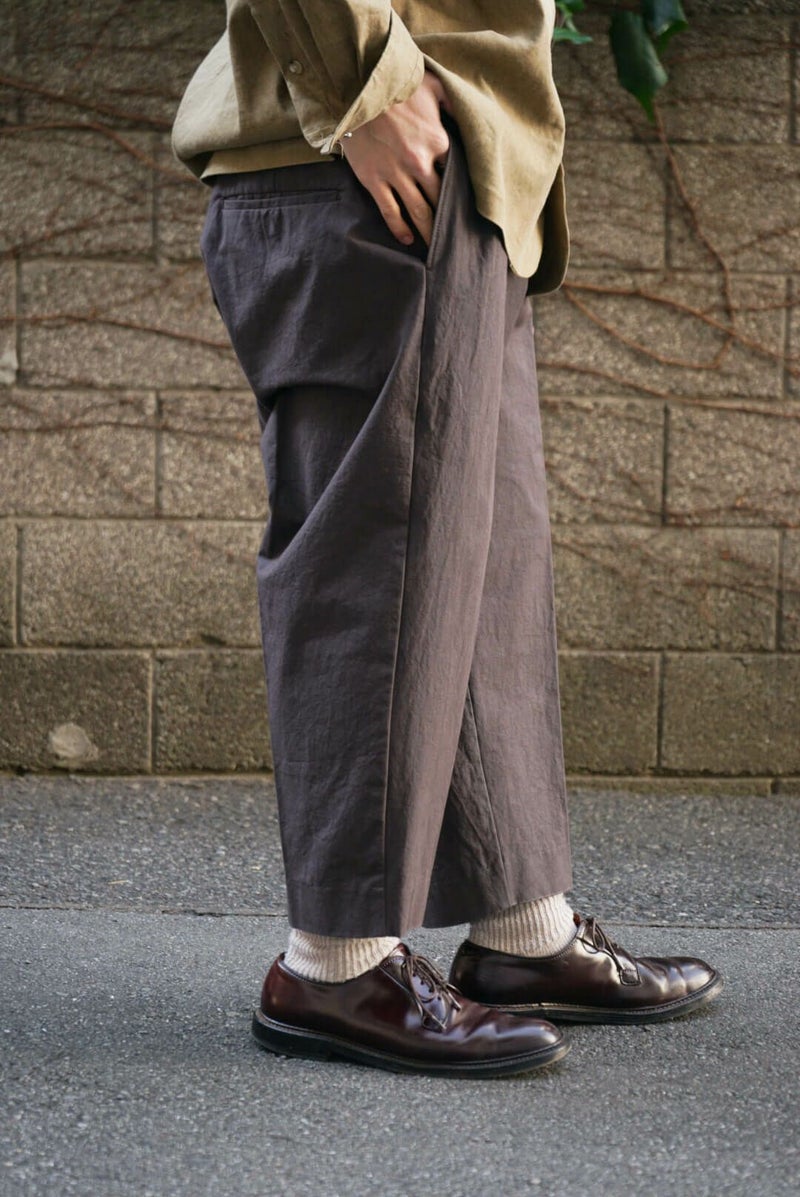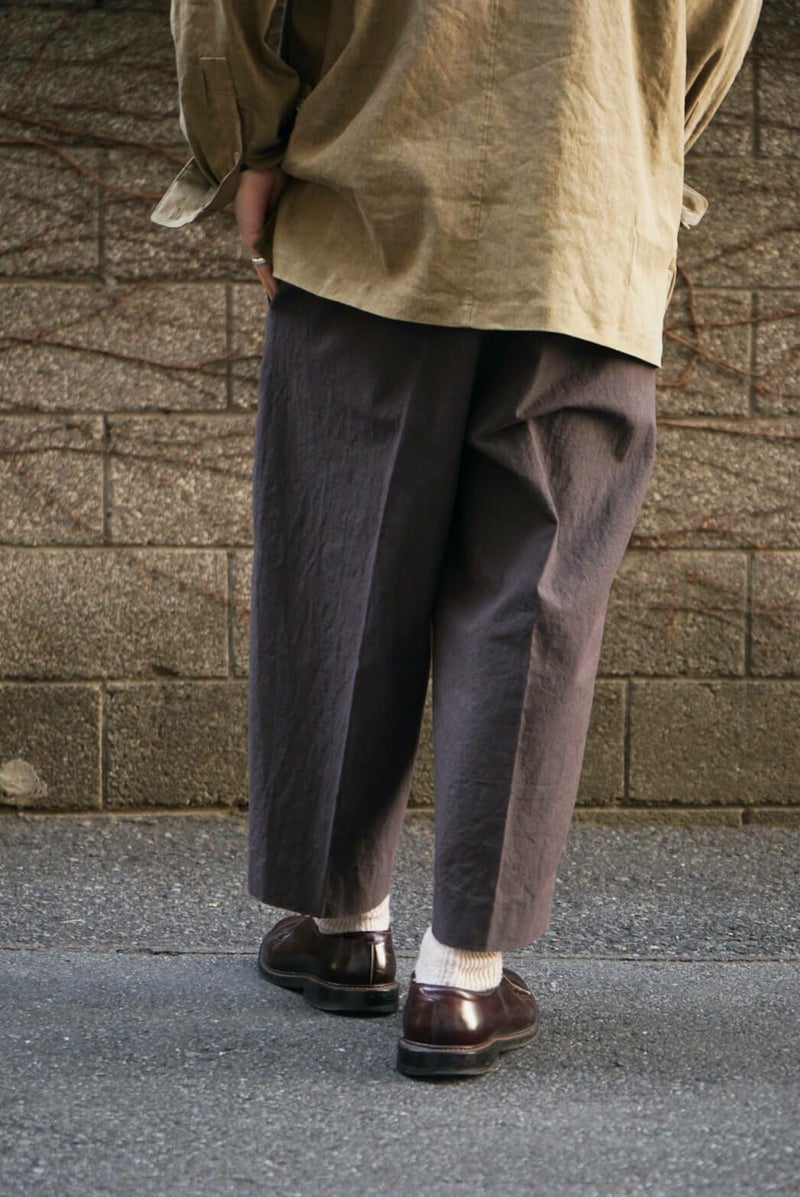rdv o globeからBRUCE PA.をリリース。素材には,コットンのドビークロスに後染めを施しております天日干しにより自然なシワ感となりドライな手触りが特徴です。 トラッドな印象ながらもロークロッチのデザインに加えヒップ周りにゆとりを持たせ動きやすくしています。太めのシルエットが特徴のトラウザーは、裾口にかけて緩やかにテーパードを利かせています。レングスは9分丈くらいに設定しており様々なシューズとも相性の良いデザインとなっておりますのでぜひお試しください。