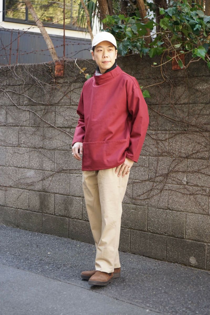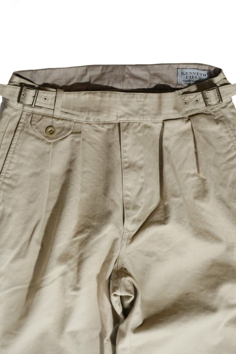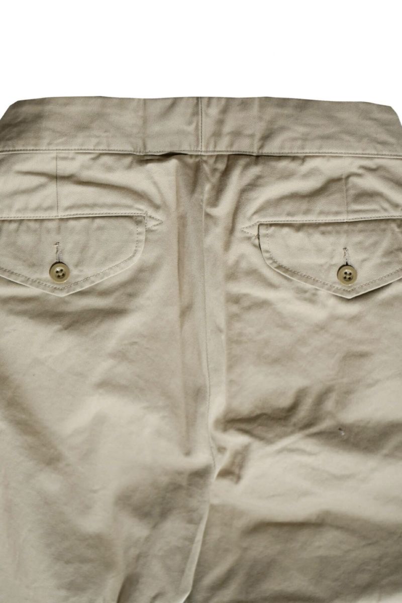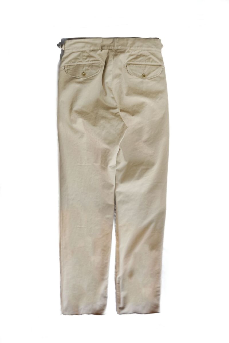 イギリスのミリタリーパンツがベースで、両サイドで留めるウエストバンドでミリタリーの匂いを残しなが、プリーツ、コインポケットでチノトラウザーズのデザインをミックスしています。