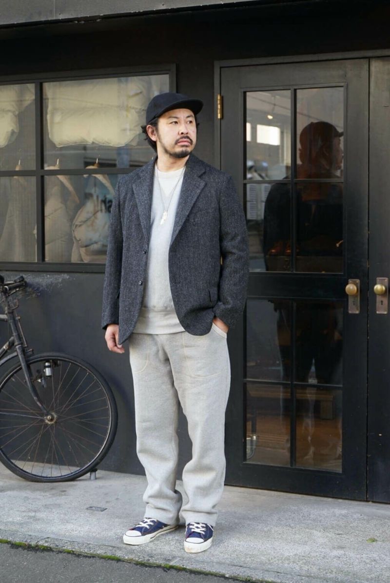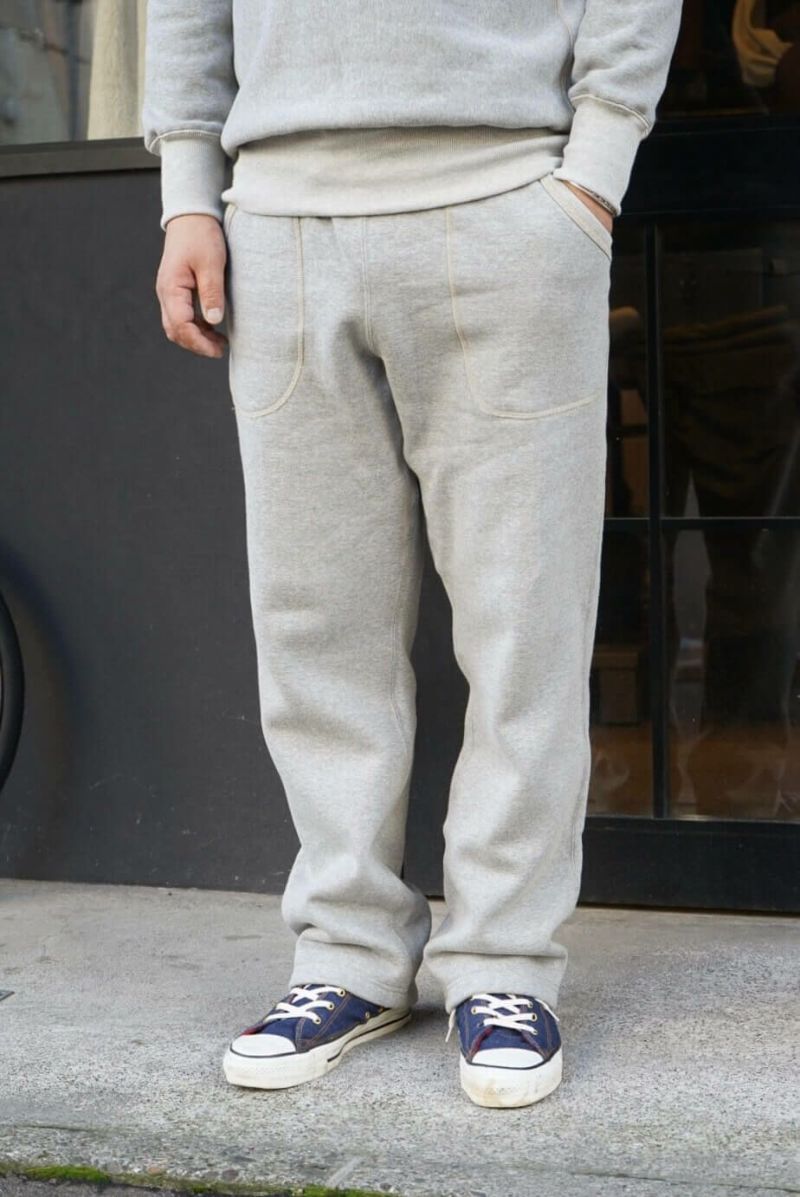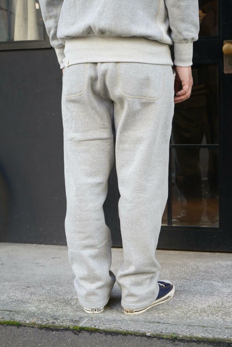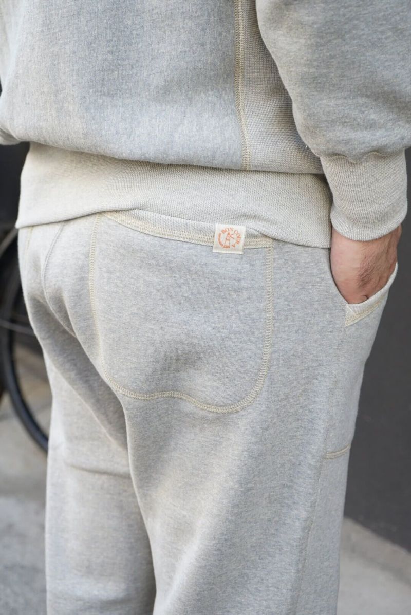 デニムと同じく原綿の配合から糸の捻までこだわった吊り裏毛スウェットパンツ。原綿の種類、産地によって質感や手触り、色など変わる中、デザイナー森島氏により組み合わせられ理想の生地に仕上っています。何度も原綿の配合率を変えてできた糸を編み立て、狙った色が出るまで試行錯誤を行い製作。生地の色に深みを持たせるために複数の色を混ぜて表現しています。