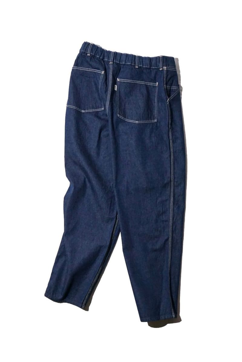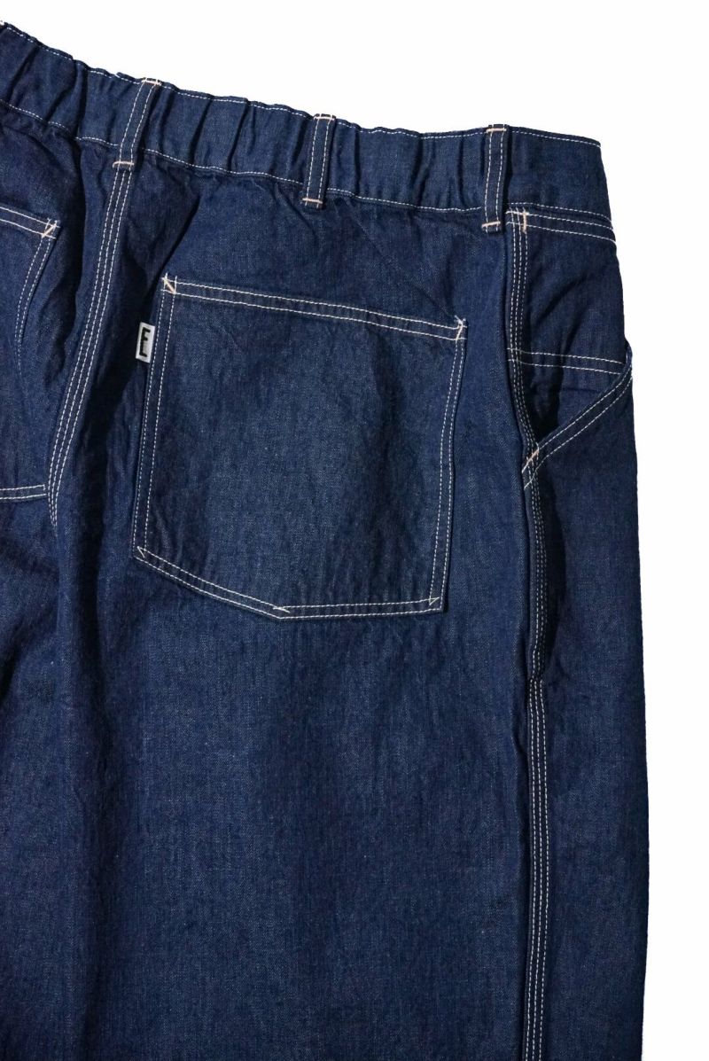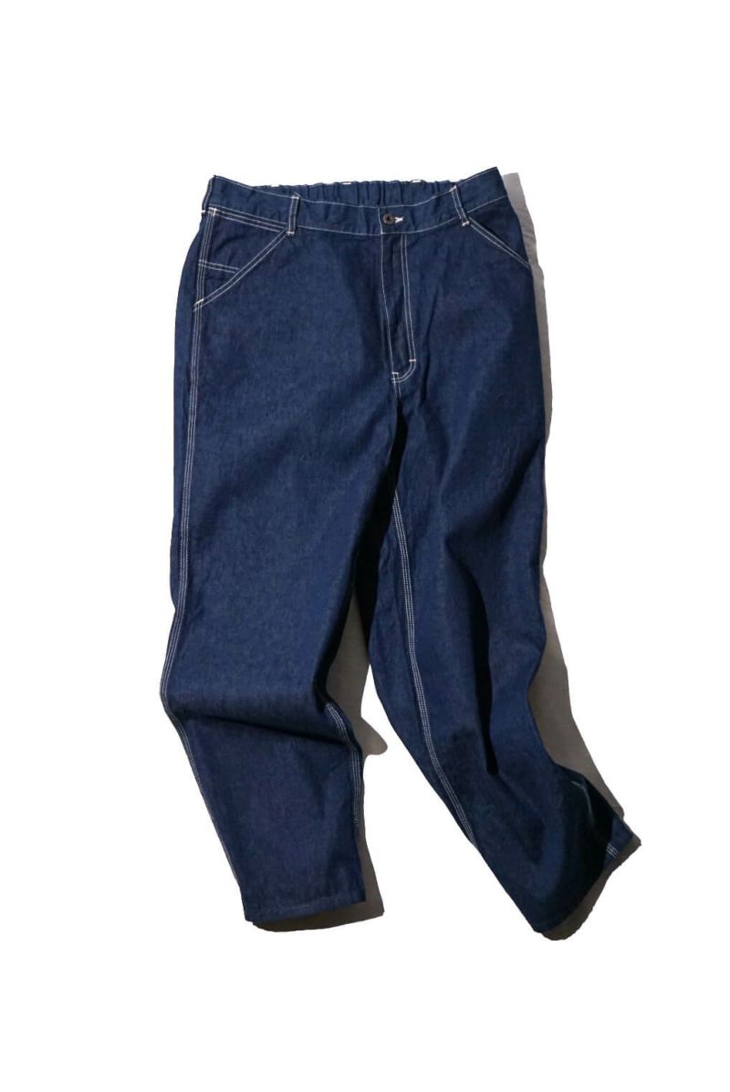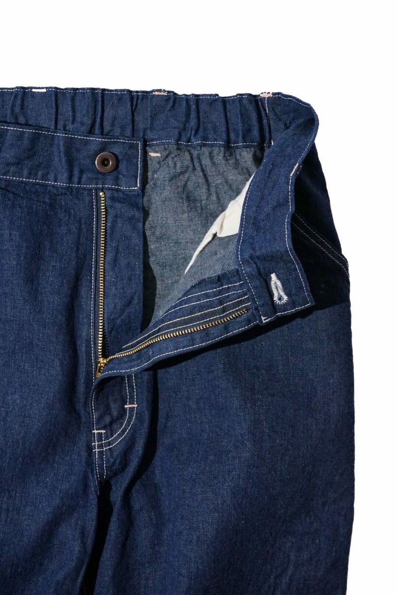 ウエストの素材は、落ち綿をリサイクルした綿と長綿とをブレンドし糸にした経糸を使用。生地はジェルトデニムをイメージしたワーキングを感じさせる10ozデニム。純度と鮮度のいい青さを表現するために、一度きりで生産するインディゴで染色しています。