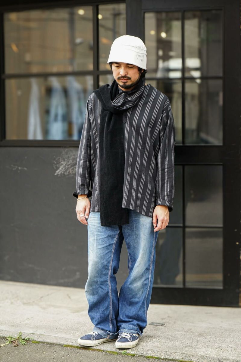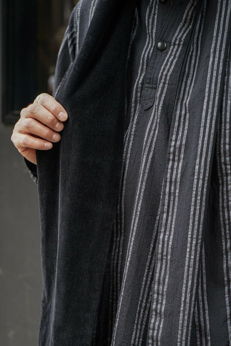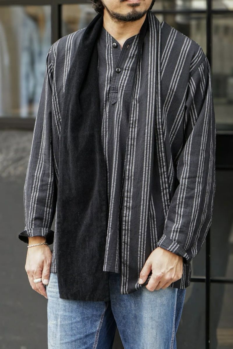落ち着いた色合いのコットンストライプ生地とブラックの細畝コーデュロイのリバーシブル仕様となっているスカーフ。細めの幅と程よい長さで巻きやすいスカーフです。