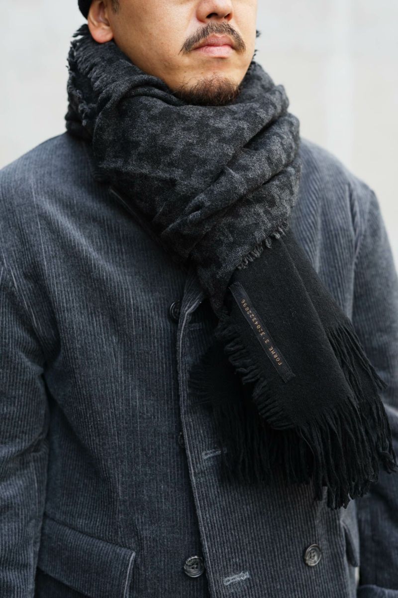 forme d'expressionのスカーフ。色柄の良さはもちろんのこと、様々な巻き方ができるサイズも魅力。ウールカシミヤの生地は保温性と肌触りも抜群です。