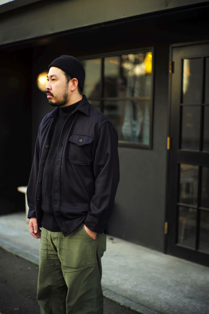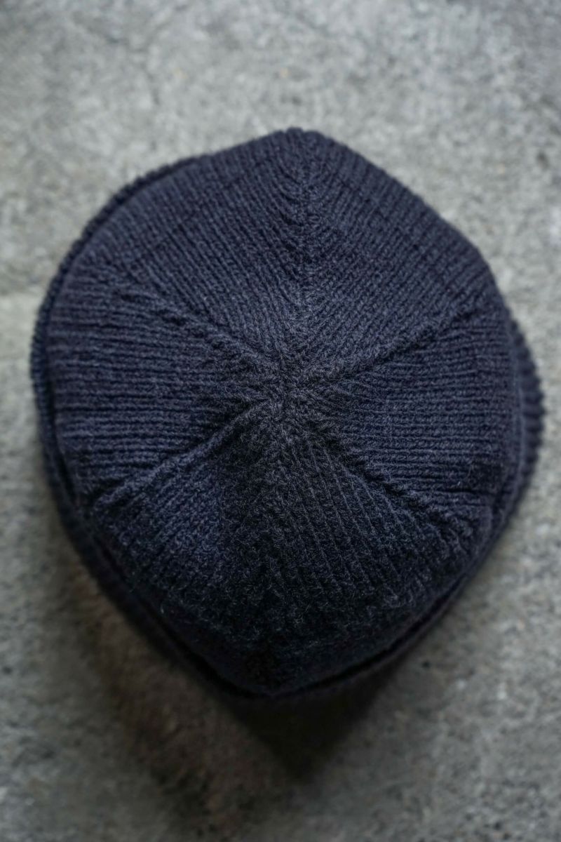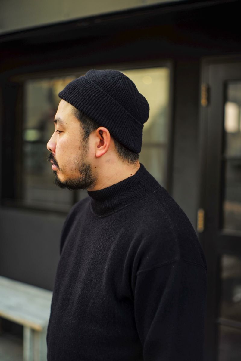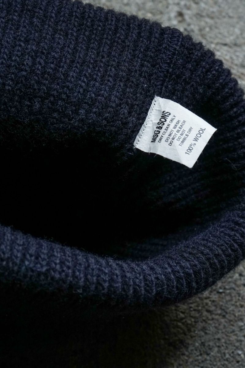 ハリ感とドライタッチな質感が特徴の紡毛紡績ウール糸と梳毛紡績ウール糸をあえて混紡して使用したオリジナル糸を完全別注で製作。さらに編地に仕立てた段階で縮絨加工を施すことで、編地の凹凸感や密度を上げ、ヴィンテージ特有の雰囲気を現代の技術で再現しました。MSG&SONSが理想とする、唯一無二の古き良きUS NAVY WATCH CAPが完成いたしました。