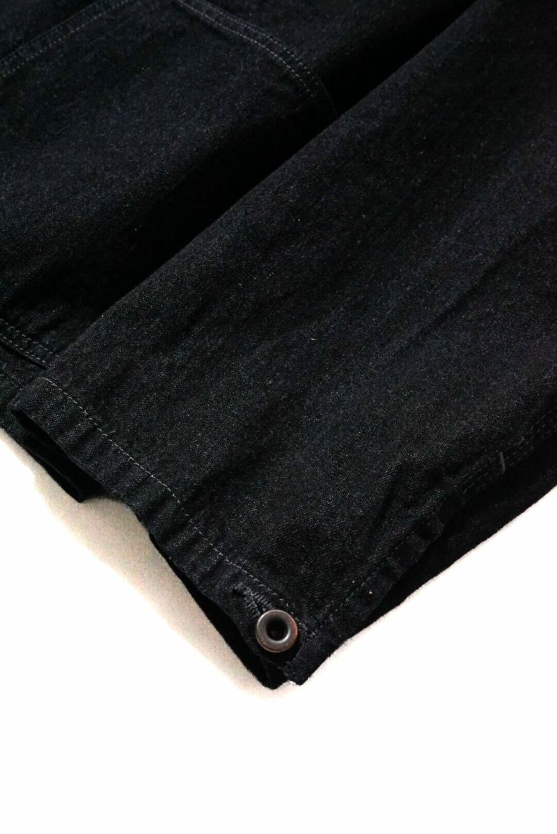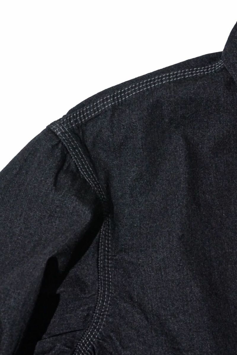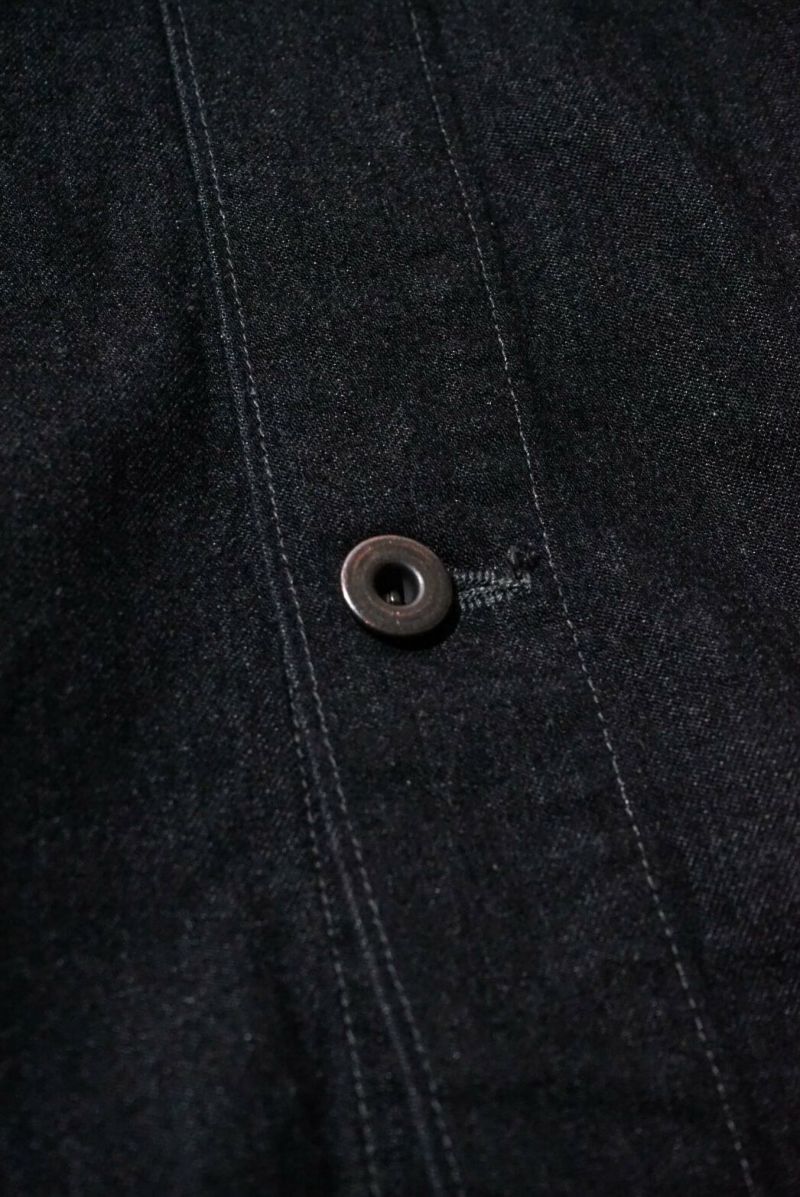生地はジェルトデニムをイメージしたワーキングを感じさせる10ozデニム。純度と鮮度のいい青さを表現するために、一度きりで生産するインディゴで染色しています。通常はインディゴを再利用することで濃く濁りが出てくることで深みや表情に重みがつくのですが、あえて鮮度にこだわった生地で浅めの色合いに。そのためロット毎の色調整が非常に難しくなっています。