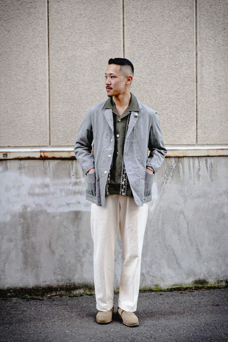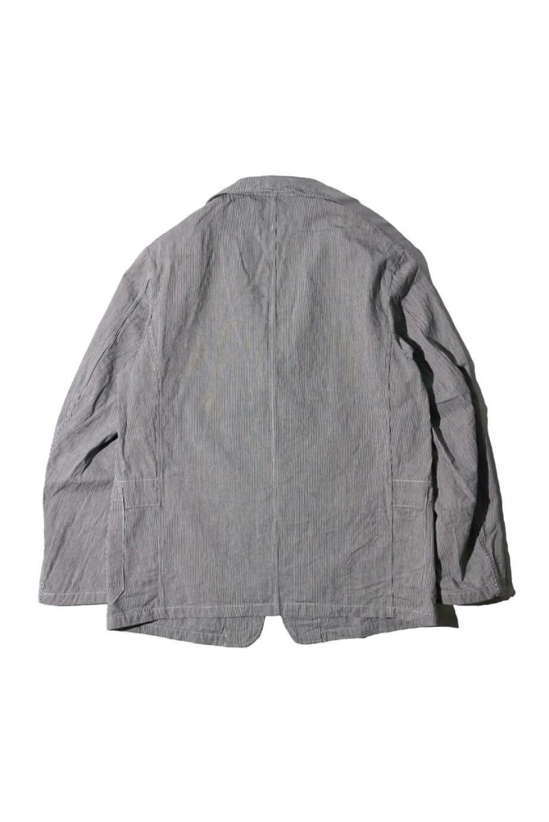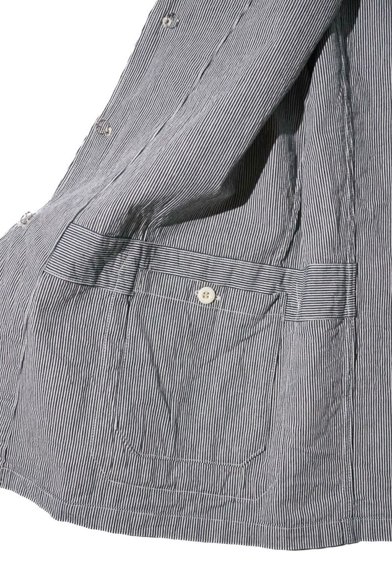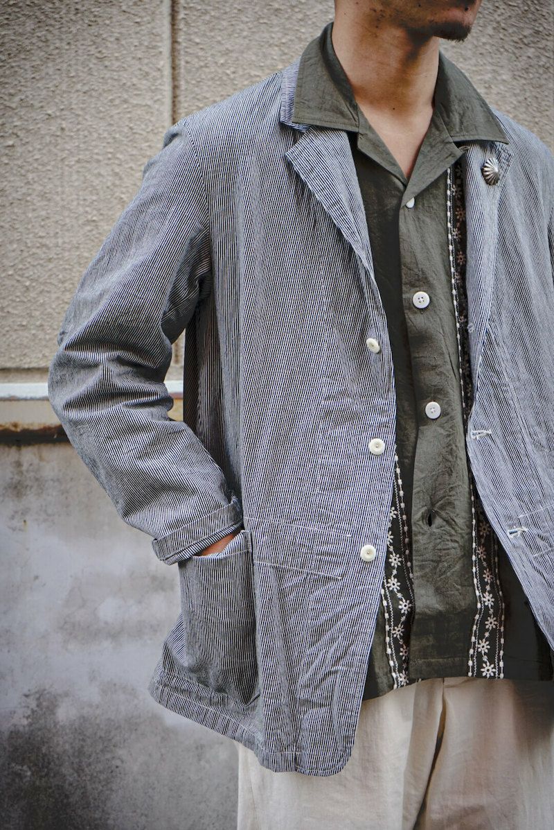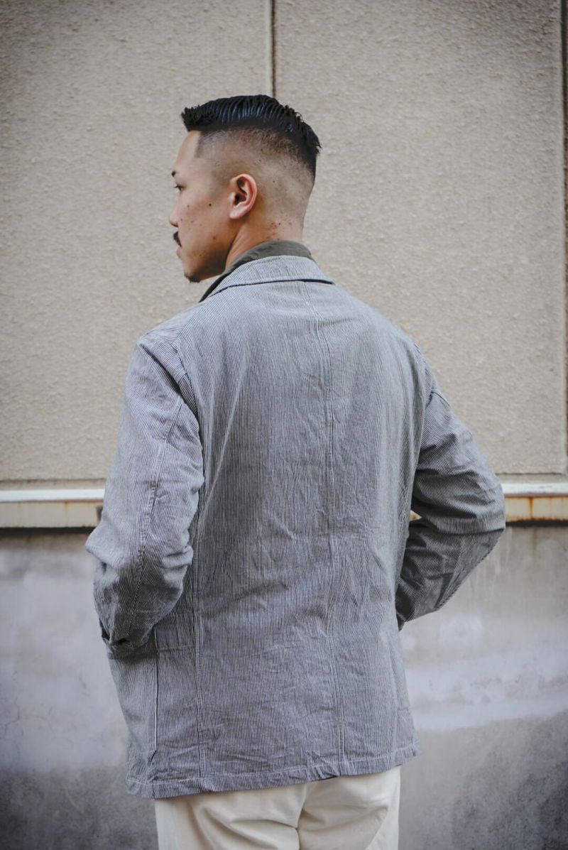 1940年代のイギリス軍のホスピタルジャケットをイメージソースに作成された、3Bジャケットです。素材は緯糸に綿麻の強撚糸を打ち込んで高密度に織り上げた、オリジナルのインディゴストライプ地。薄手ながらハリ感とシャリみのあるタッチが特徴です。