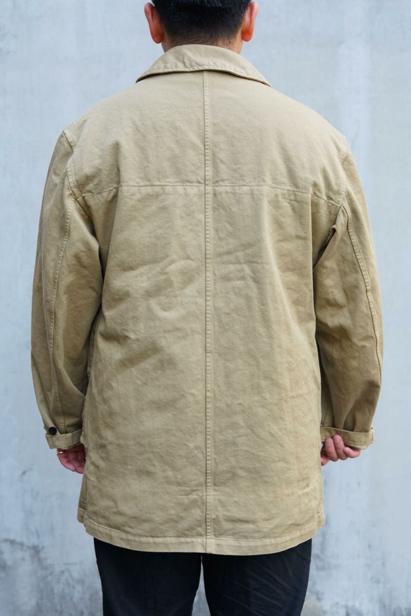 1930~40年代の腕付けなどが特徴的なハンティングジャケットをベースに作成された一着。フラップのポケットが印象的で、背面にも左右繋がるハンティグのディテールを取り入れています。風除けのためのチンストラップも付属し、襟を立てての着用も可能なデザインとなっています。素材は経糸にギリシャピマコットンの単糸、緯糸にインドスビンコットンの双糸を使用し作成した最高級オリジナルチノ。経糸に程よいムラ感があるため綾目が立体的になっています。