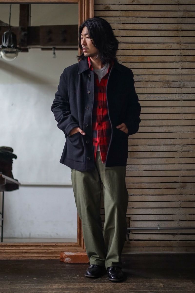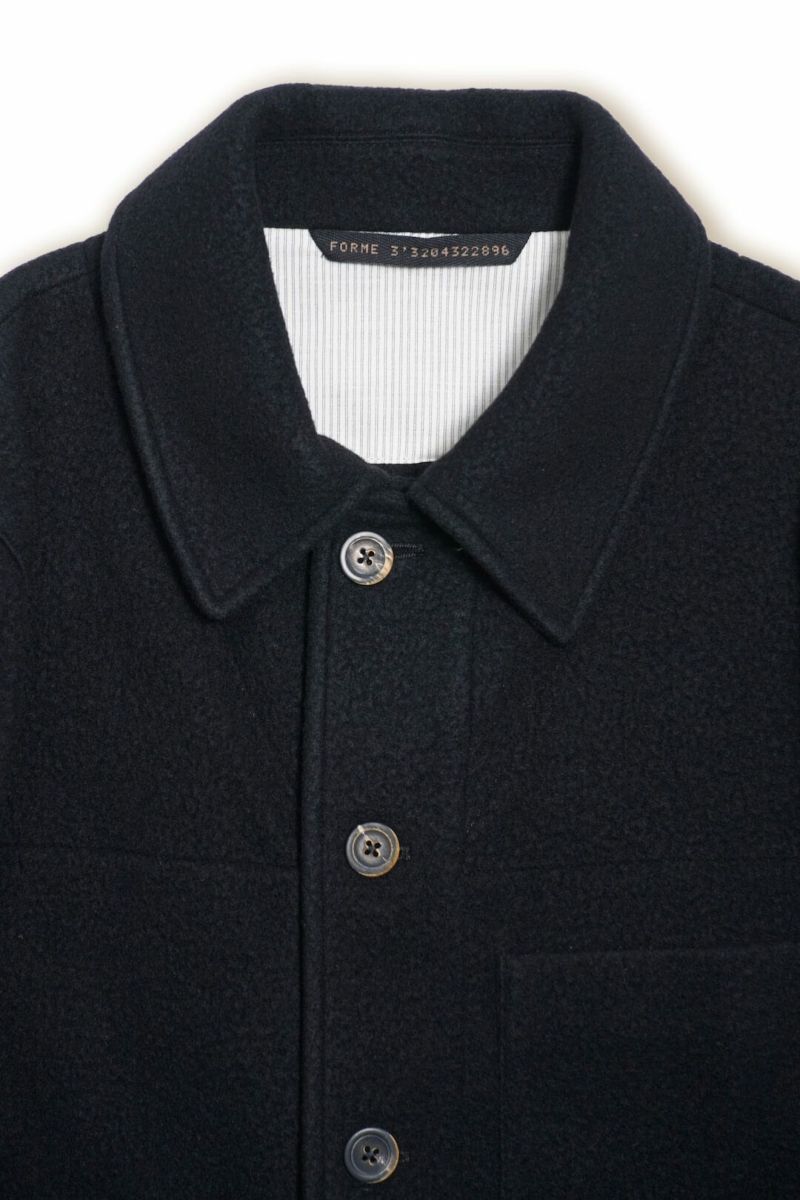ワークジャケットをベースとしたforme d'expressionの1着。デザイナーの得意とするドレーピングのテクニック、洗練された素材使いによって、クラシックな洋服がベースにありながらも、スタイリッシュかつモダンな印象に仕上げられています。