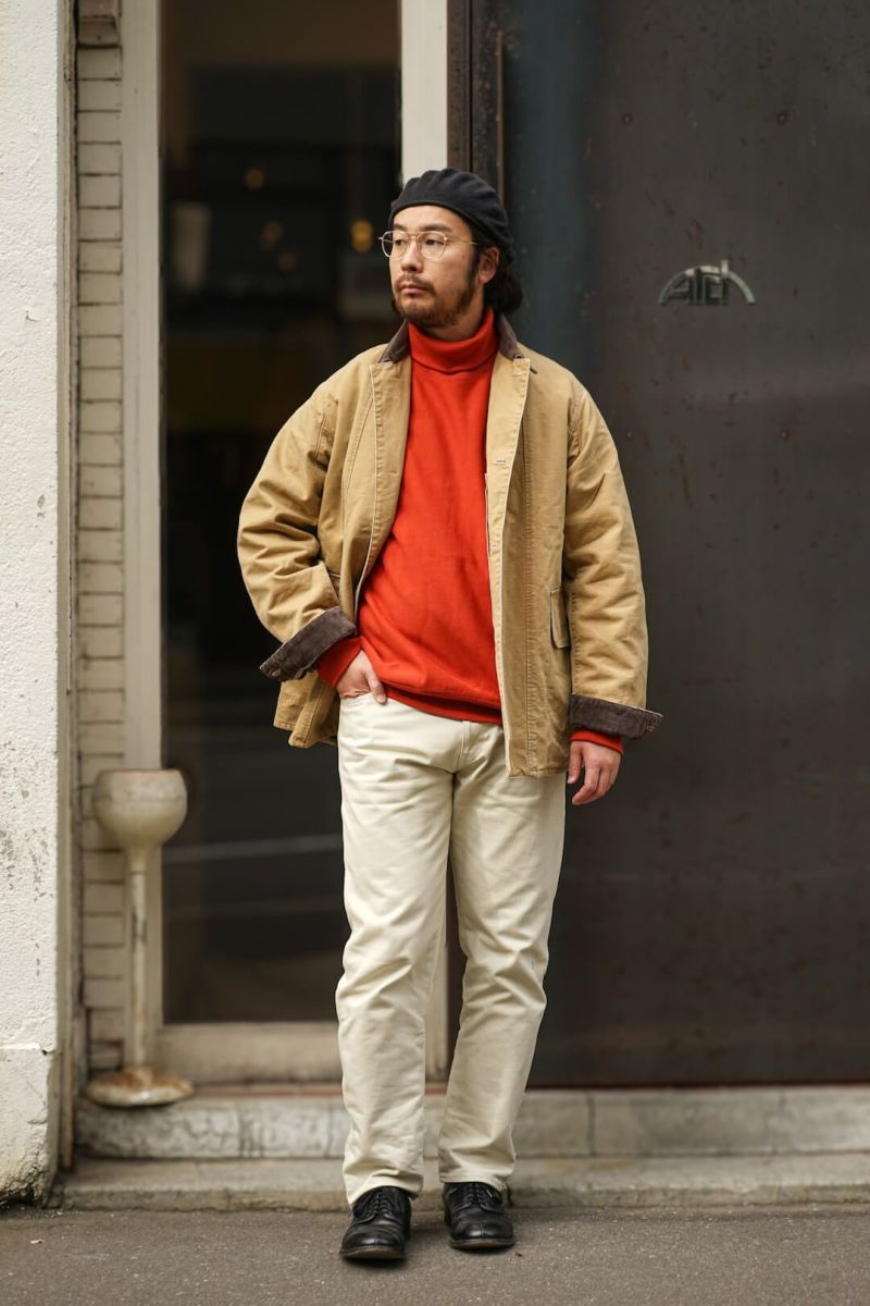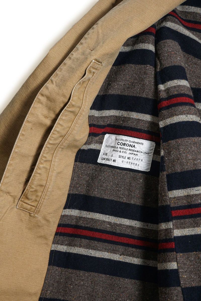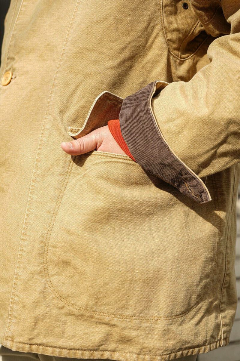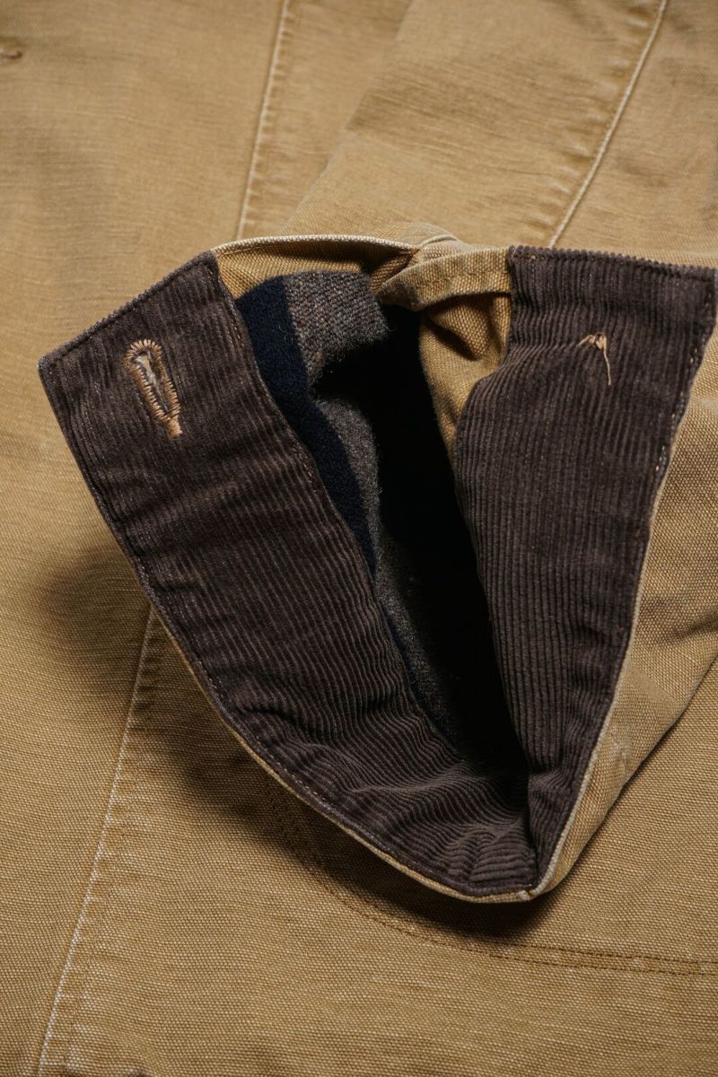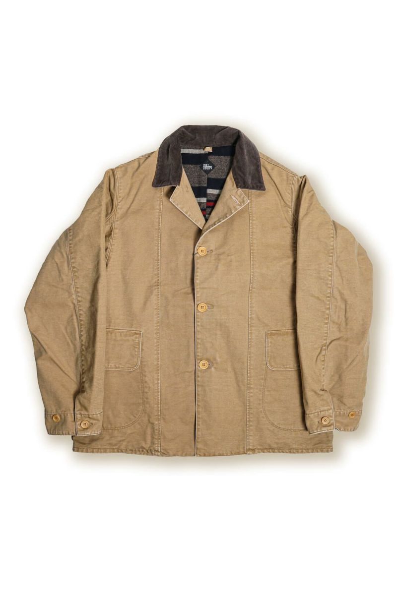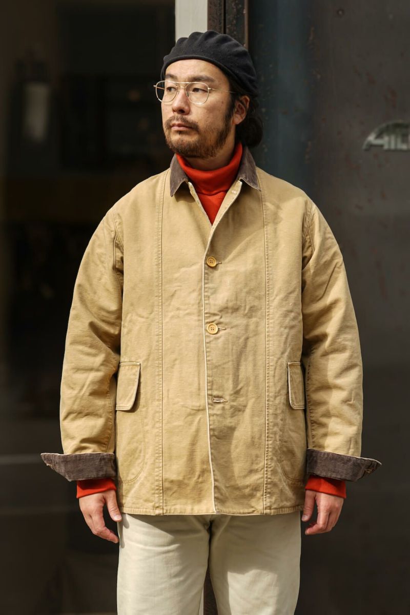 ビンテージのハンティング・フィールドコートをリプロダクションしたジャケットです。シンプルながら特徴的なデザインで、前身頃の独特な切り替えや、手が入れ易い真横に配置されたフラップ付きポケットがポイントです。初登場となる25FWコレクションでは、丈夫なワークウエア素材のコットンダックを使用し、裏地には暖かみのあるボーダーブランケットを採用。ビンテージコットンダックのリプロダクション生地は、ビンテージ特有のヨコムラの出方にこだわりっています。芯まで染まりきらない特殊染色により、味わい深い表情となります。