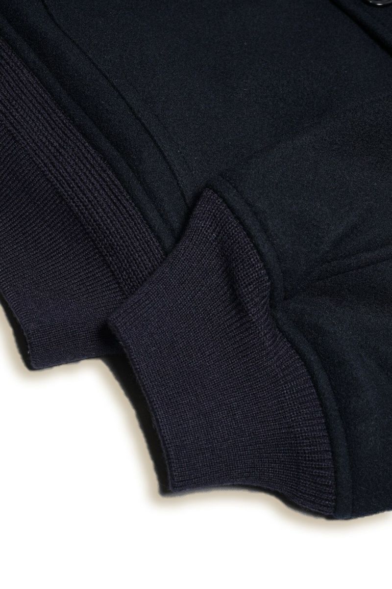プラップ付のポケットはサイドからも手が入る2層構造にアレンジを加えています。それぞれパターンの異なる編地で編み立てたウール混のリブが衿、袖口、裾につきます。