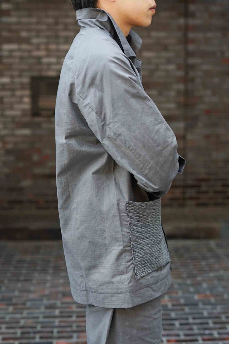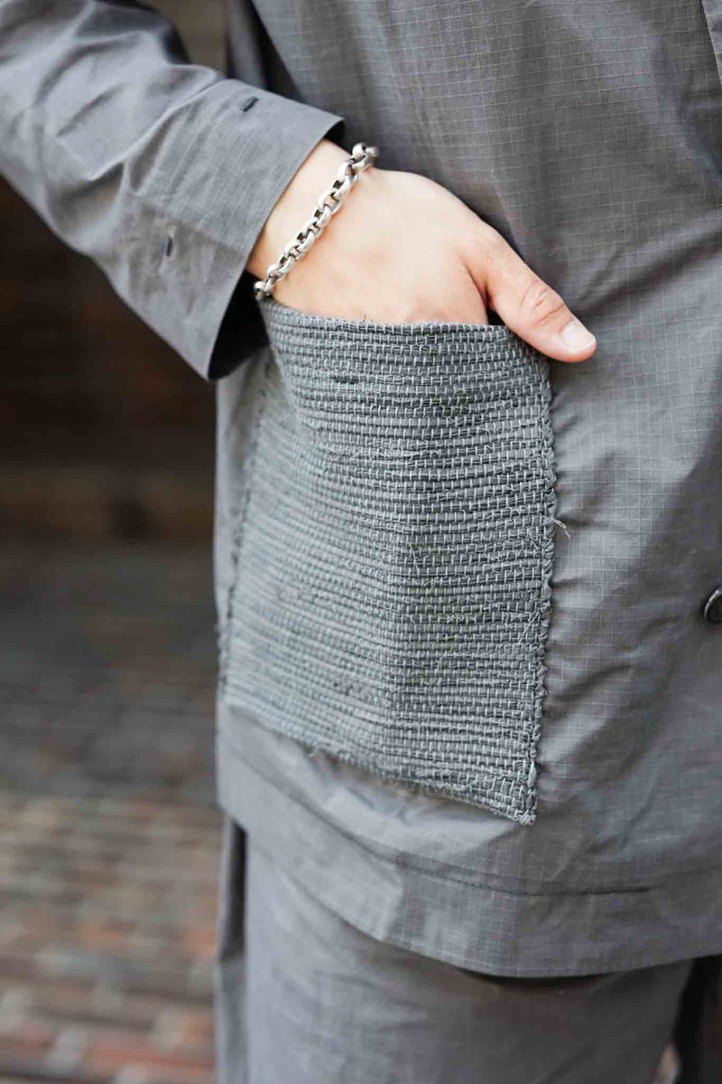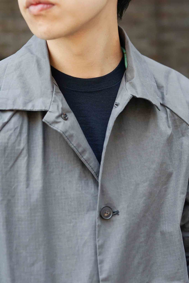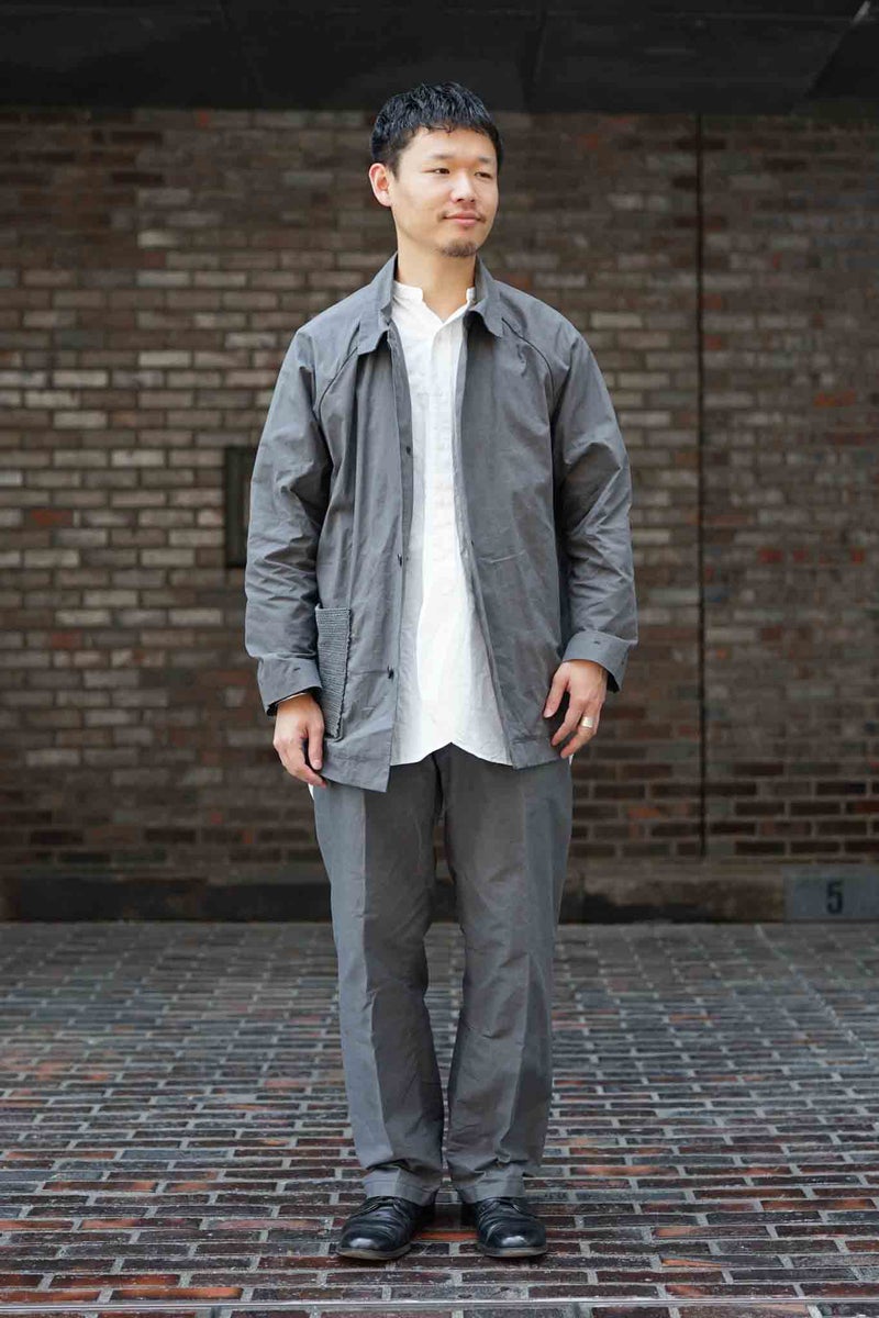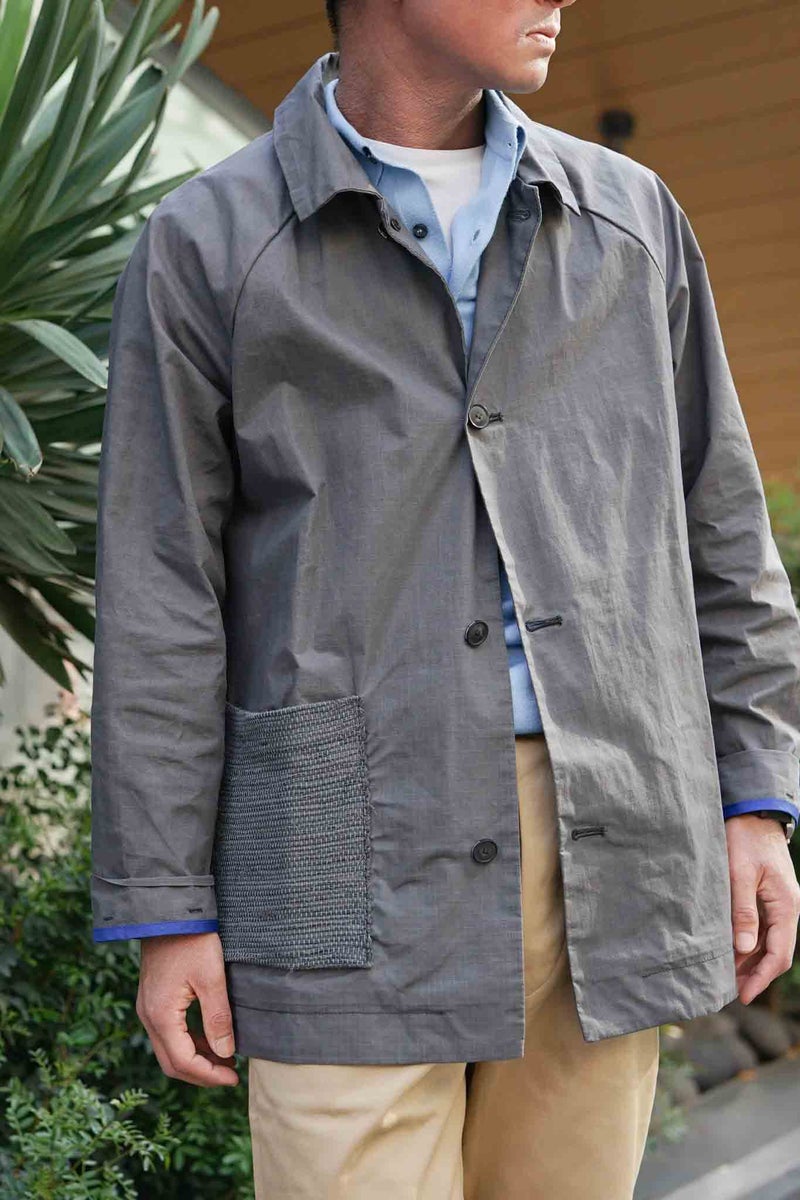シックながら清涼感を感じさせるグレーと、細かなリップストップのドライワックスコットン生地が醸し出す独特の雰囲気があるジャケット。パッチポケットには奄美大島に古くから伝わる手織りのコットン生地"大島紬"を用いています。生地は、今なお世界最高峰のワックスコットンを生産し続けるイギリスの"HALLEY STEVENSONS社"製。製作は、かつてワックスジャケットの代名詞として知られる英国のブランドの洋服を手がけていたファクトリーが担っています。