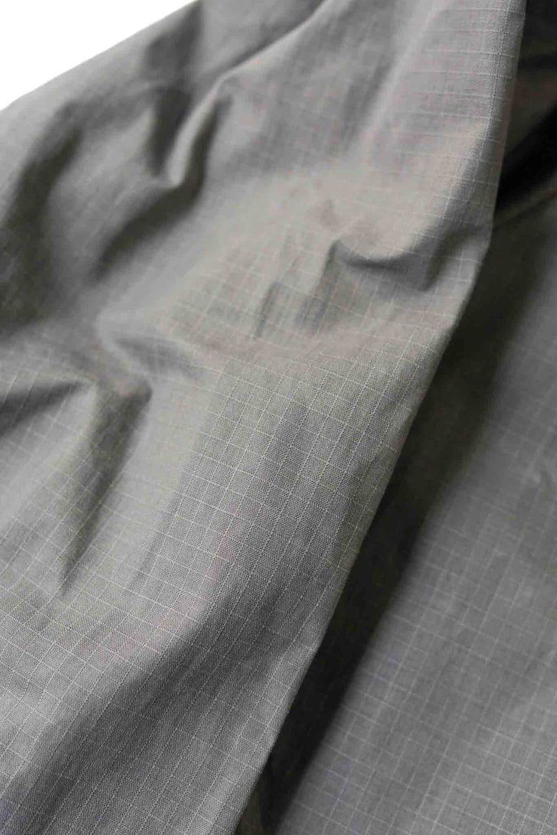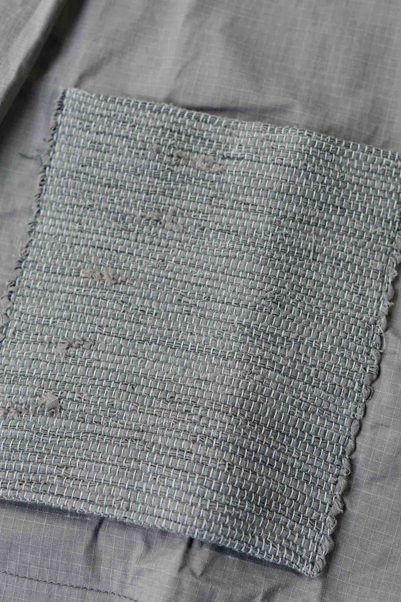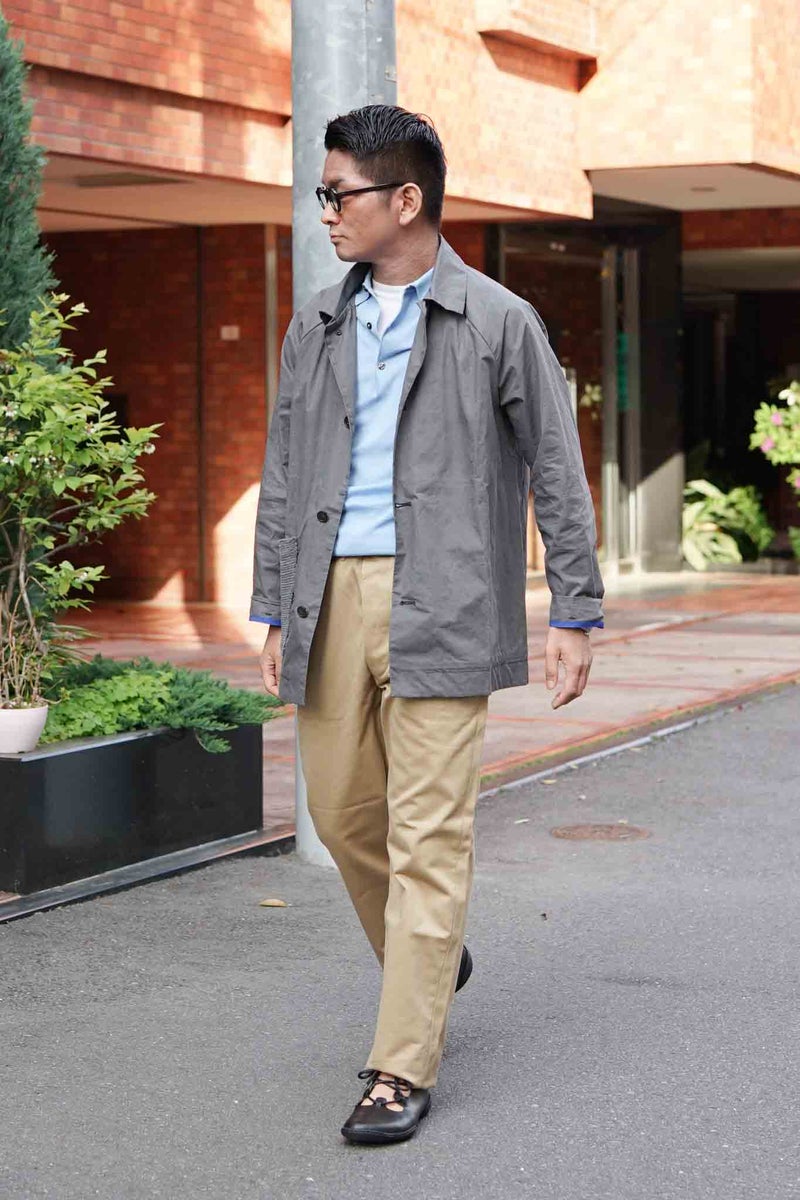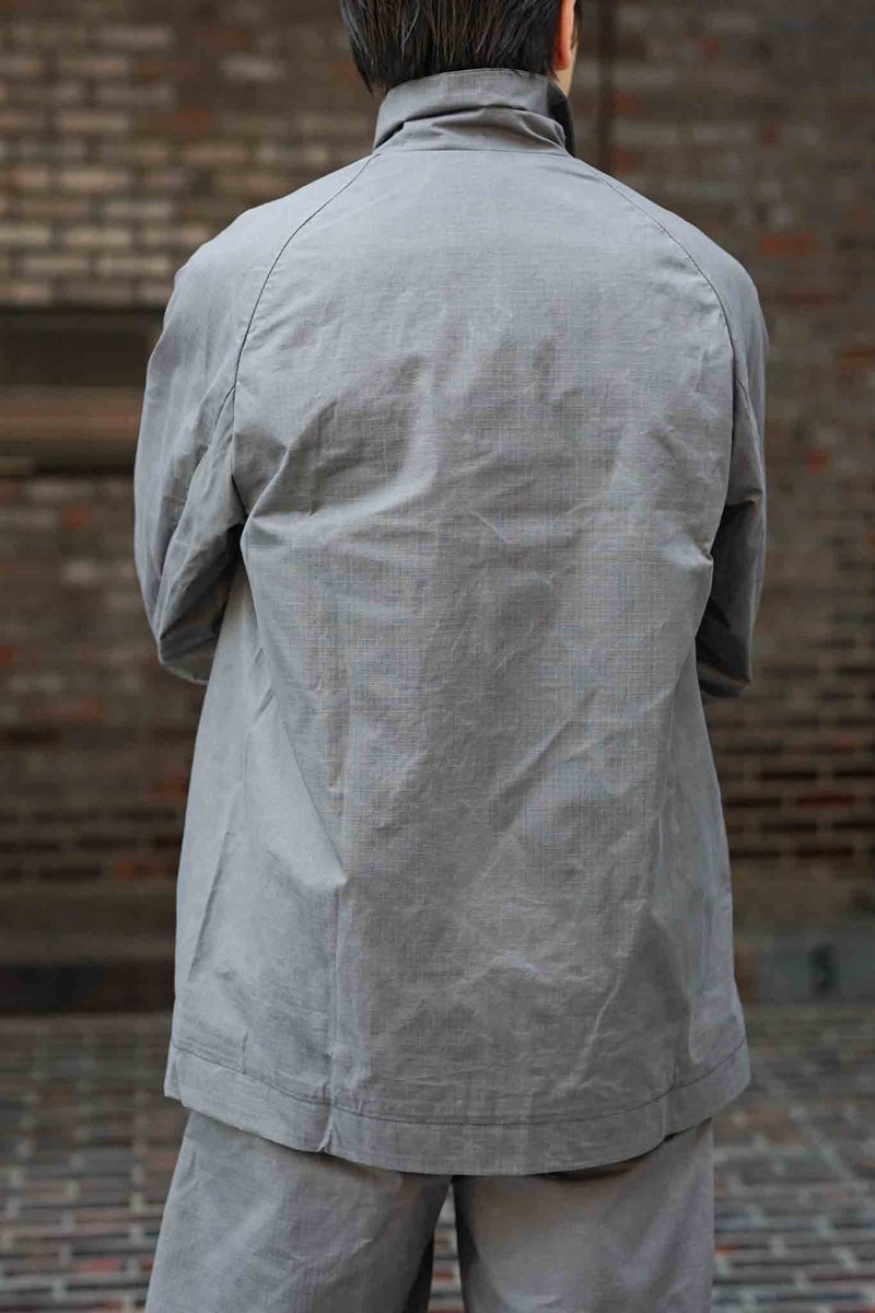 シックながら清涼感を感じさせるグレーと、細かなリップストップのドライワックスコットン生地が醸し出す独特の雰囲気があるジャケット。パッチポケットには奄美大島に古くから伝わる手織りのコットン生地"大島紬"を用いています。生地は、今なお世界最高峰のワックスコットンを生産し続けるイギリスの"HALLEY STEVENSONS社"製。製作は、かつてワックスジャケットの代名詞として知られる英国のブランドの洋服を手がけていたファクトリーが担っています。