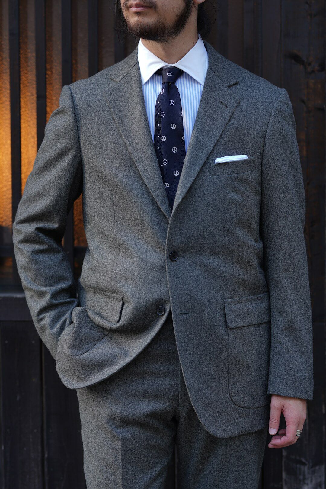 1960年代のアメリカントラディッショナルなスタイルを踏襲したグレーフランネルのスポーツコート。 表にステッチの無いラペルに、フロントダーツでやや絞られたウエスト、胸ポケットは箱の仕様で、50’S Sports Coatと比べシャープで洗練された印象の1着となっています。 素材にはイギリスの老舗生地メーカー、FOX BROTHERSのフランネル生地を採用。 ウィンザー公やウィンストン・チャーチル、ケーリー・グラントらの著名人からも愛され、1950年頃までは同社が商標も保持していたという「フランネル」は、いま現在も創業当時からほとんど変わらぬレシピを用いて織られ続けており、サヴィル・ロウを始めとした世界中の名門テーラーで扱われている歴史と信頼のある生地です。 素材や仕立てはもちろんのこと、サイズ感やシルエット含め細部までこだわり抜かれた、ブランドを代表するアイテムです。 表地 : 100% WOOL 裏地 : 100% CUPRO KENNETH FIELD / 60'S SPORTS COAT(FOX BROTHERS FLANNEL) Price ¥121,000(税込)