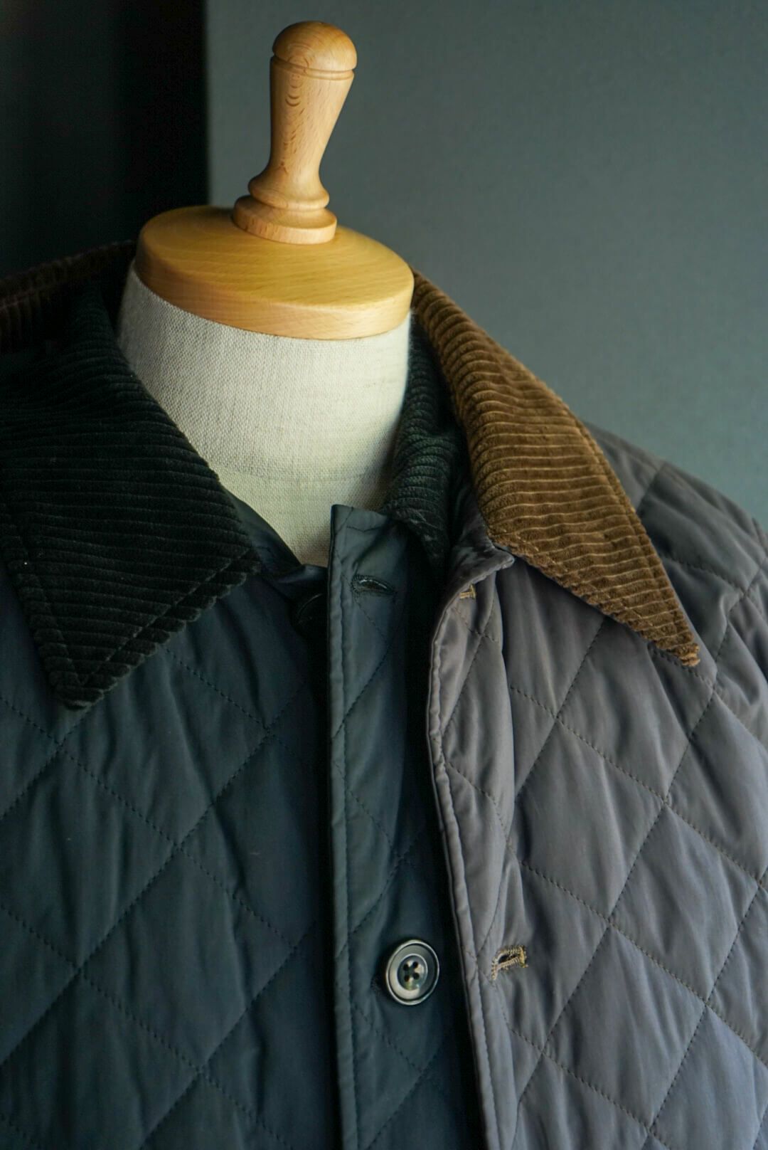 その当時の割繊技術を使ってフランス伝統のスクエアキルト素材に加工し、当時パリを席巻していたH社のキルティングJK風に仕上げました。襟には英国ブリベンモスのコーデュロイ、さらにサイドスリットも施されています。
