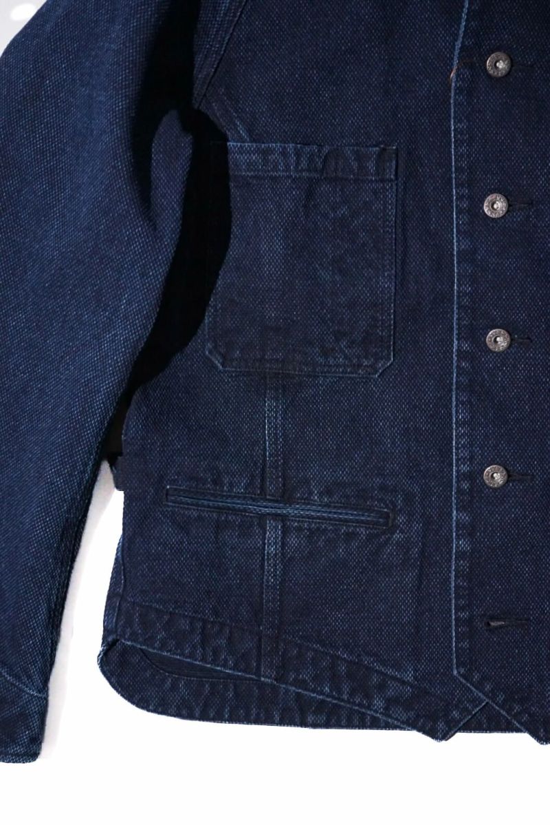 60'sイギリスのエンジニアジャケットをイメージしてリデザインした立ち襟・ラグランスリーブのショート丈ジャケット。月桂樹ネオバーボタン使用、後身左右のアジャスターによりフィット感も調整可能。素材としての当ブランド定番のインディゴ染めの刺し子生地を使用し、ボールバイオ加工を施している。