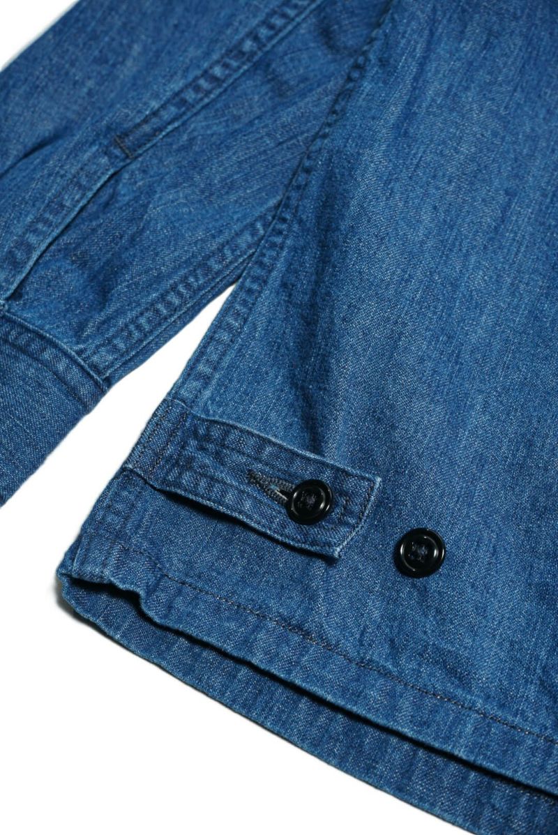60~70'sのベトナム戦争時に米軍で採用されたモデルをベースにデザインされた、定番のシャツジャケット、シーズンファブリックです。素材は8ozデニム。仕上げにフェード加工を施し、ある程度着込んだ風合いに仕上げています。オリジナルにない仕様として筒袖をカフス付きに変更。シルエットに変化をつけれるように裾脇にはアジャストタブを、脇下には菊穴を開けて通気性を確保しています。