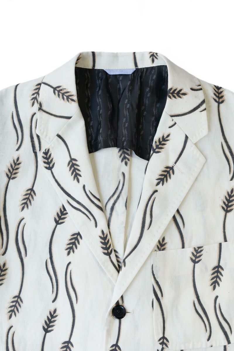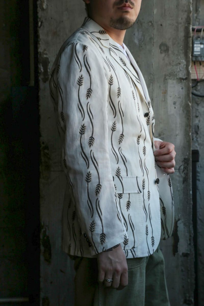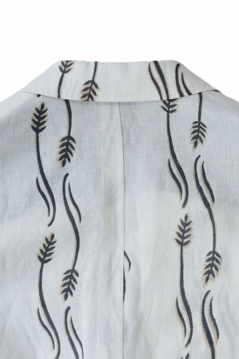 生地はインド・ラジャスタンにてハンドブロックプリントされたオリジナルファブリックを使用。スラブ感のあるコットンリネン生地にKENNETH FIELDブランドのモチーフがプリントされた清涼感のある生地です。