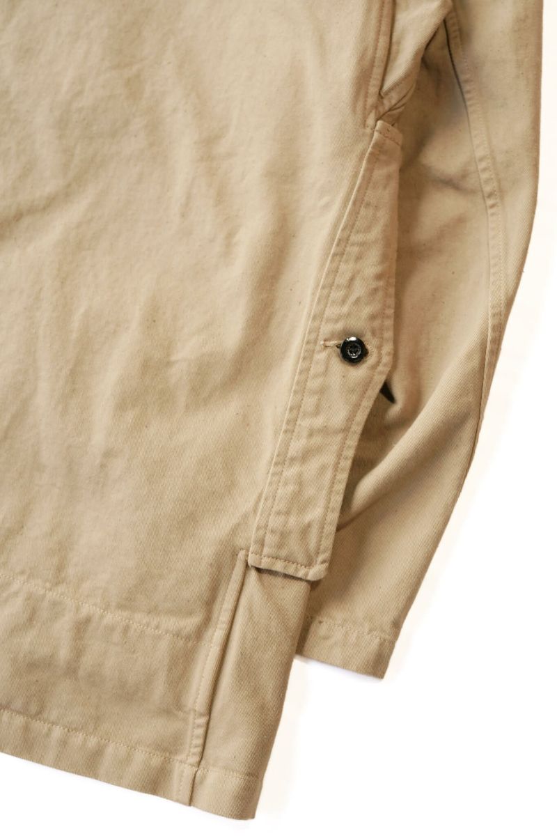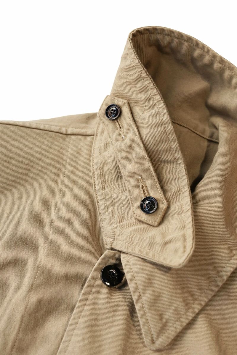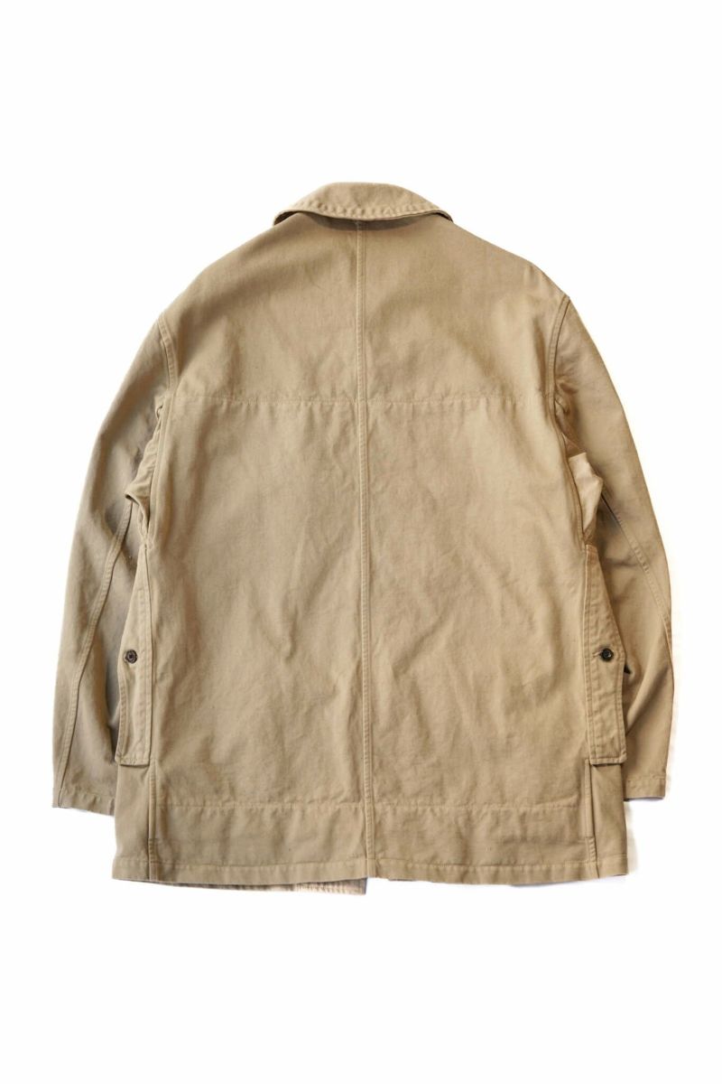 1930~40年代の腕付けなどが特徴的なハンティングジャケットをベースに作成された一着。フラップのポケットが印象的で、背面にも左右繋がるハンティグのディテールを取り入れています。風除けのためのチンストラップも付属し、襟を立てての着用も可能なデザインとなっています。素材は経糸にギリシャピマコットンの単糸、緯糸にインドスビンコットンの双糸を使用し作成した最高級オリジナルチノ。経糸に程よいムラ感があるため綾目が立体的になっています。