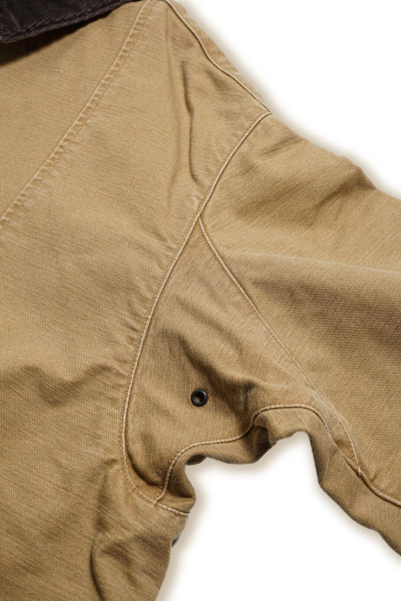 ビンテージのハンティング・フィールドコートをリプロダクションしたジャケットです。シンプルながら特徴的なデザインで、前身頃の独特な切り替えや、手が入れ易い真横に配置されたフラップ付きポケットがポイントです。初登場となる25FWコレクションでは、丈夫なワークウエア素材のコットンダックを使用し、裏地には暖かみのあるボーダーブランケットを採用。ビンテージコットンダックのリプロダクション生地は、ビンテージ特有のヨコムラの出方にこだわりっています。芯まで染まりきらない特殊染色により、味わい深い表情となります。