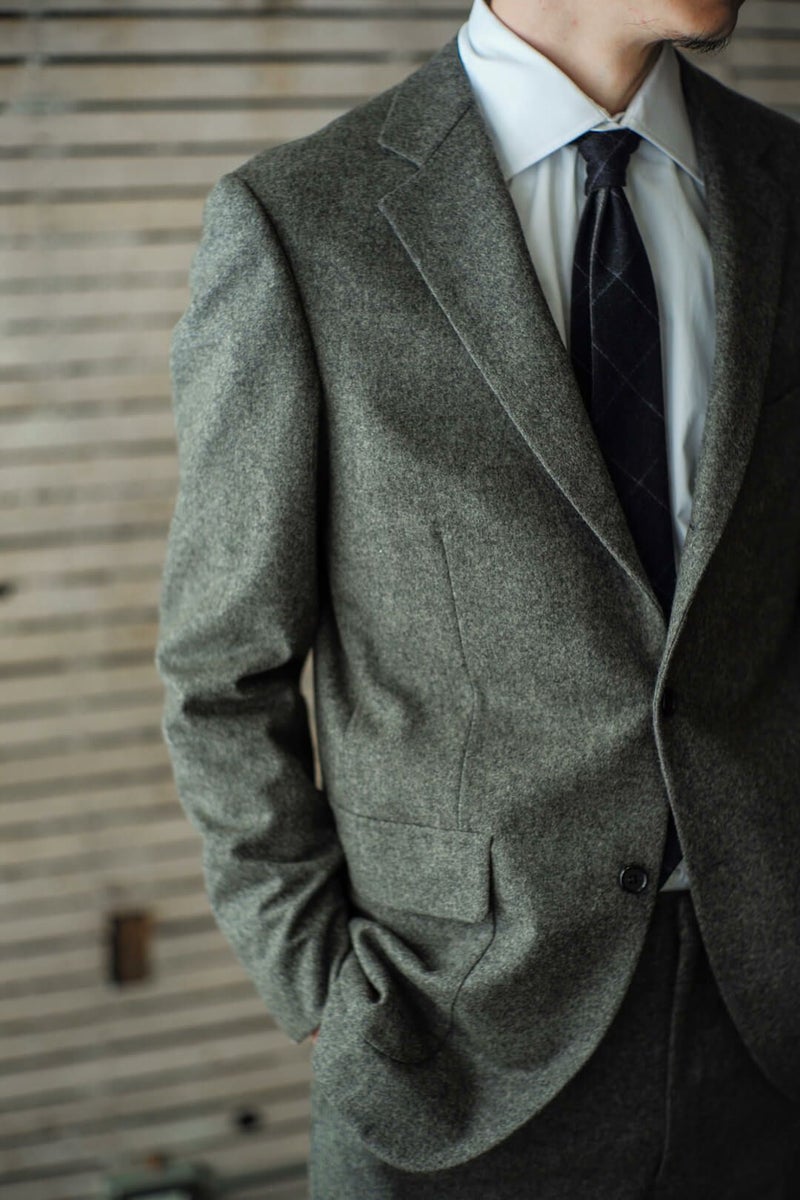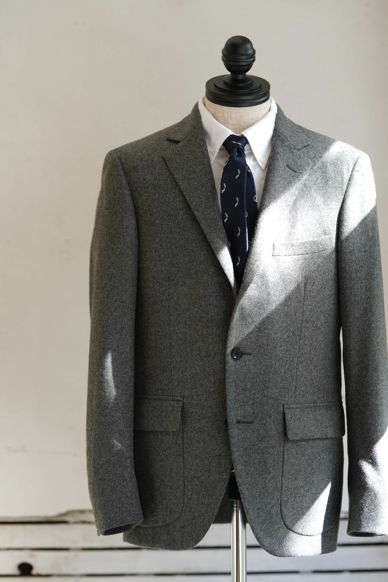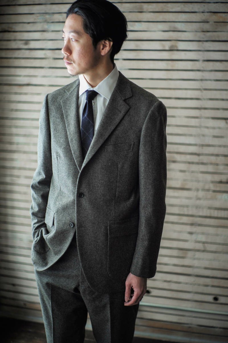 1960年代のアメリカントラディッショナルなスタイルを踏襲したグレーフランネルのスポーツコート。 表にステッチの無いラペルに、フロントダーツでやや絞られたウエスト、胸ポケットは箱の仕様で、50’S Sports Coatと比べシャープで洗練された印象の1着となっています。 素材にはイギリスの老舗生地メーカー、FOX BROTHERSのフランネル生地を採用。 ウィンザー公やウィンストン・チャーチル、ケーリー・グラントらの著名人からも愛され、1950年頃までは同社が商標も保持していたという「フランネル」は、いま現在も創業当時からほとんど変わらぬレシピを用いて織られ続けており、サヴィル・ロウを始めとした世界中の名門テーラーで扱われている歴史と信頼のある生地です。 素材や仕立てはもちろんのこと、サイズ感やシルエット含め細部までこだわり抜かれた、ブランドを代表するアイテムです。 表地 : 100% WOOL 裏地 : 100% CUPRO KENNETH FIELD / 60'S SPORTS COAT(FOX BROTHERS FLANNEL) Price ¥121,000(税込)