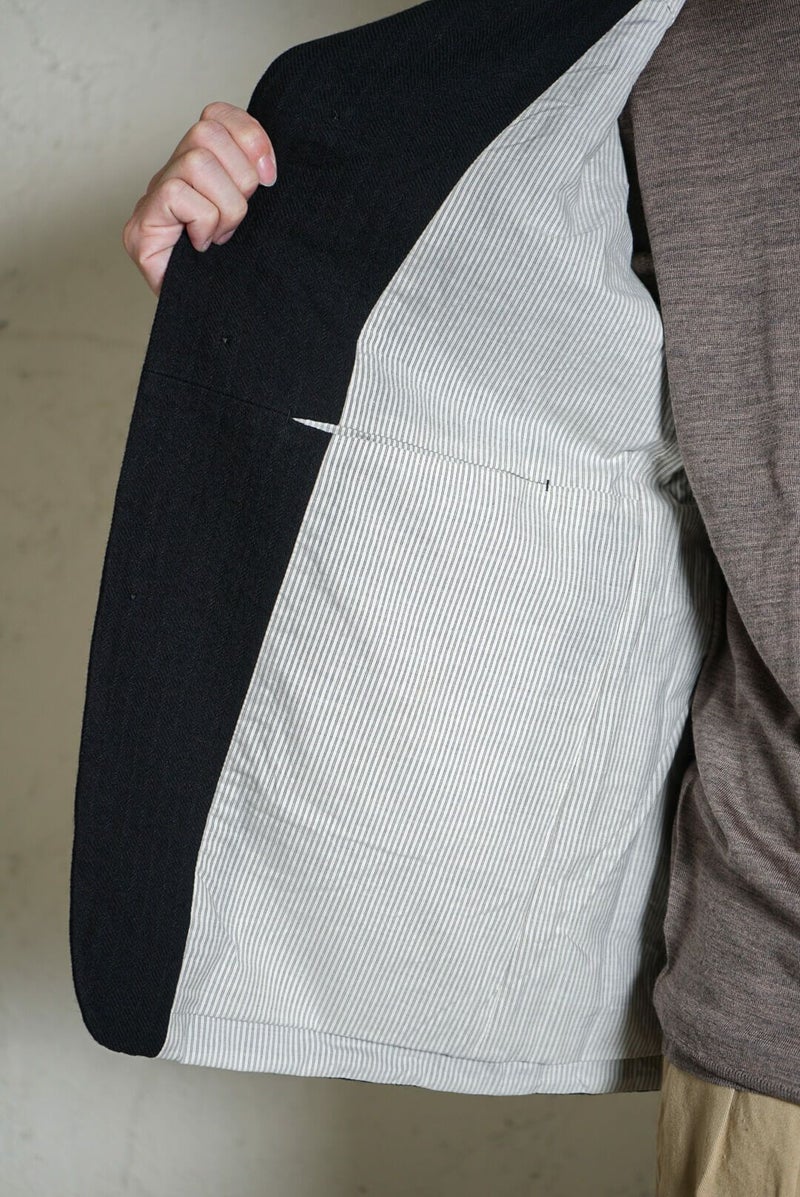 デザイナーの得意とするドレーピングのテクニック、洗練された素材使いによって、クラシックな洋服がベースにありながらも、スタイリッシュかつモダンな印象に仕上げられた一着。スタンドカラーでもラペルカラーでも着用できます。素材にはストライプ状に織柄が入るコットンウールのツイル生地を使用。同素材のトラウザーズとセットアップでの着用もおすすめです。