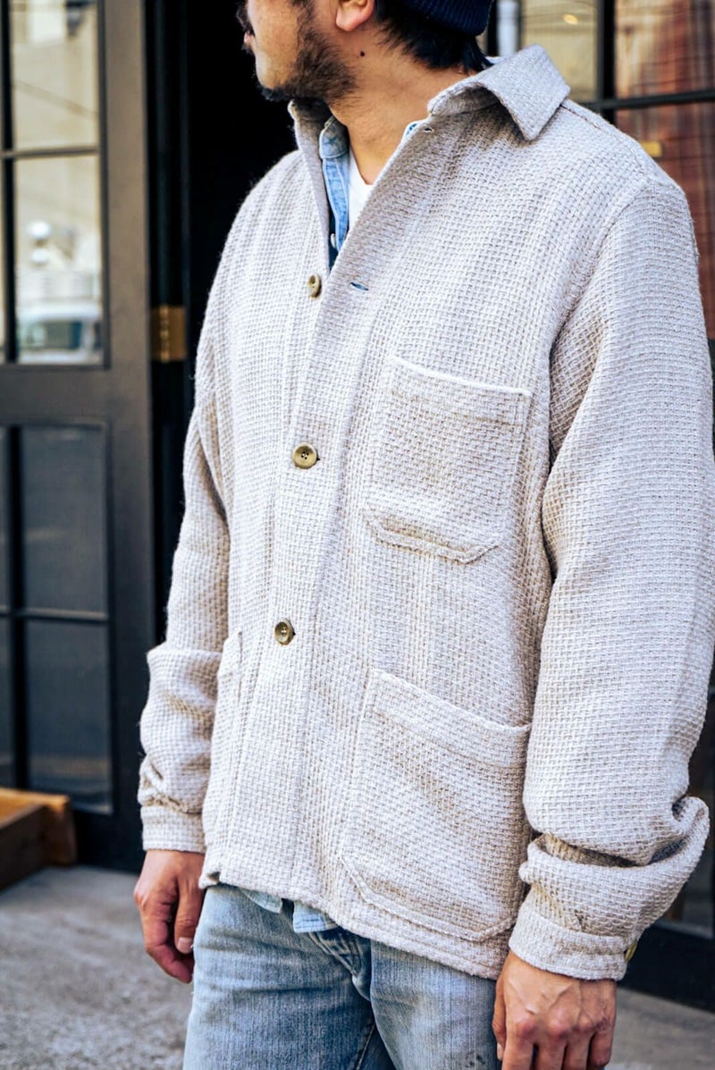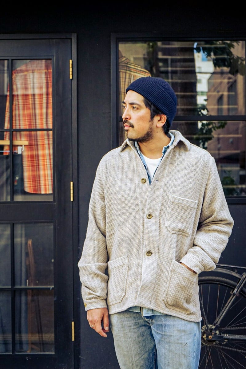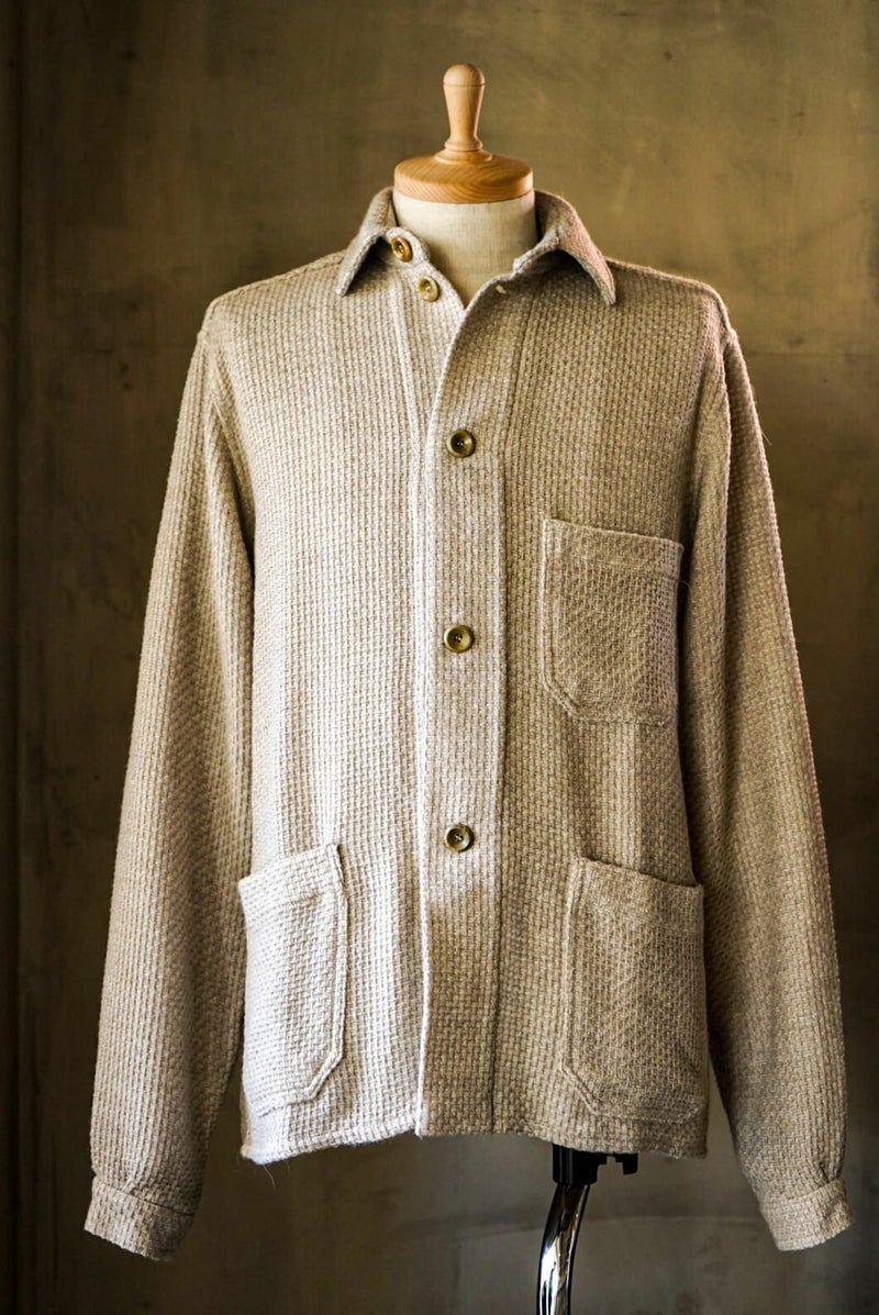 FRANK LEDER AUTUMN/WINTER CollectionSammlung "(ザムルング:収集、精神の集中) カバーオールジャケットより丈が短め、素材の軽さからシャツとしても、ジャケットとしても使い勝手のよいアイテムです。クリームワッフルドウールで仕上げた もの。名のとおり、ふわふわとワッフルのように凹凸がある生地は軽くてさわやか。軽く羽織れるア ウターとして、生地の印象からユニセックスでもお勧めできるアイテムです。 WOOL 100% FRANK LEDER / CREAM WAFFLED WOOL SHIRT JACKET Price ¥75,900(税込)