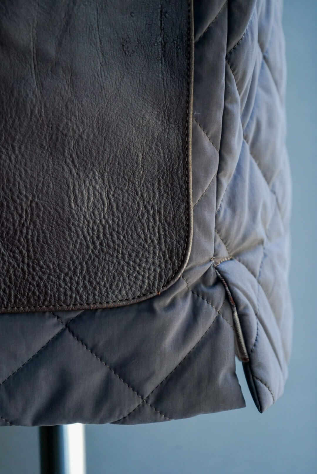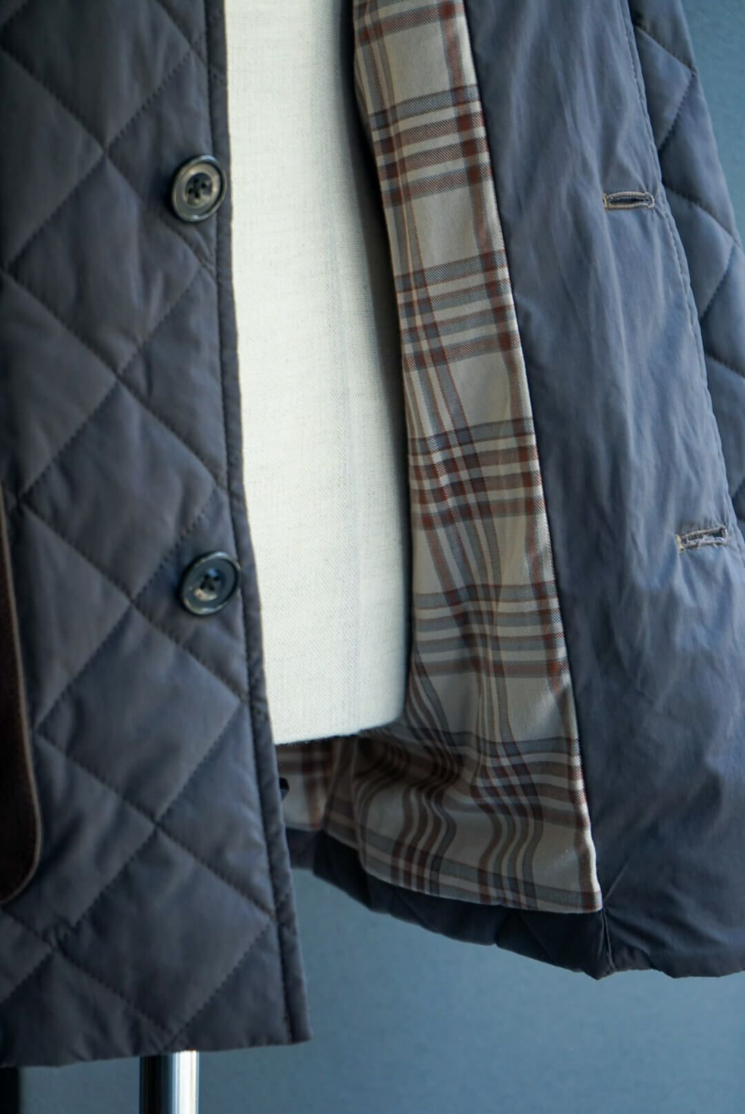 その当時の割繊技術を使ってフランス伝統のスクエアキルト素材に加工し、当時パリを席巻していたH社のキルティングJK風に仕上げました。襟には英国ブリベンモスのコーデュロイ、さらにサイドスリットも施されています。