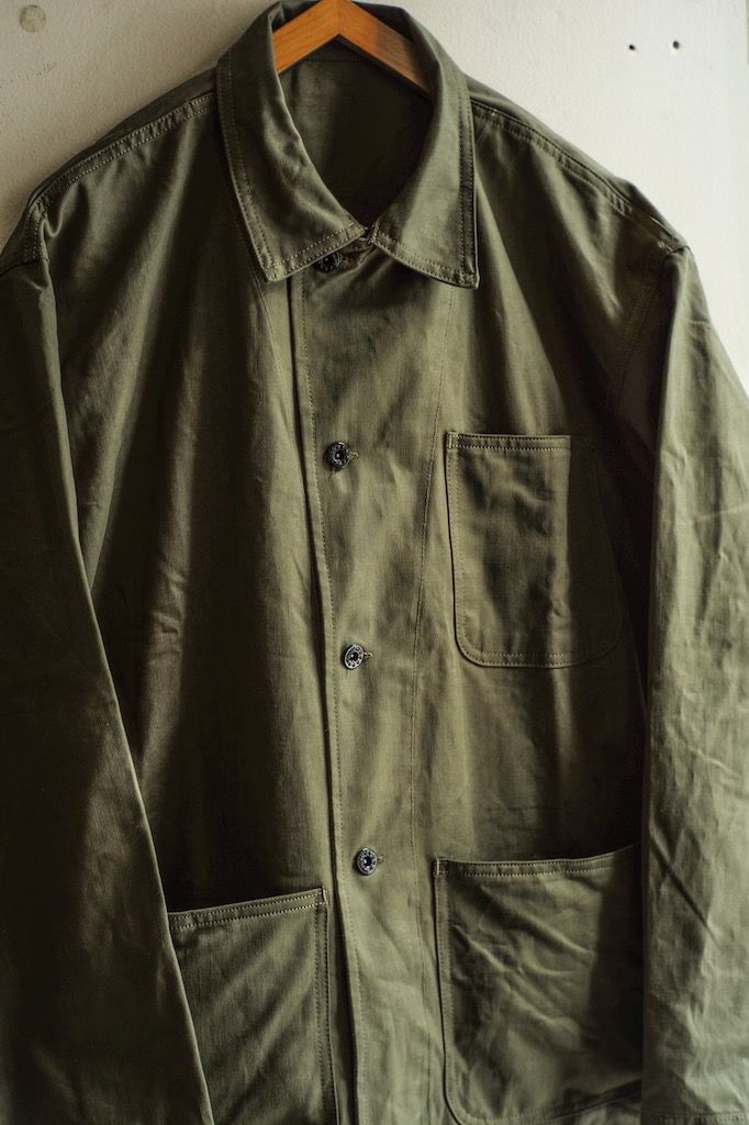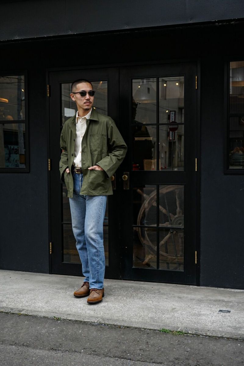 MSG & SONS(エムエスジーアンドサンズ) 1940年代、第二次世界大戦期にUS NAVYへ支給されていたN-3 UTILITY JACKETをデザインソースに製作された1着。 このジャケット最大の特徴は、あらゆるミリタリーアイテムの中で最もパターン数が少なく、とにかく無駄のないアイテムであるということ。パターン数が6枚で形成され、なによりも量産の効率性を考えられています。背中のはぎが無く、袖は一枚袖。現代で考えると、贅沢に製作された仕様です。 生地については、この年代のミリタリーアイテムを代表するヘリンボーンツイルで当時のオリジナルに合わせた染色工程を見い出し、生地カラー(デットストック品)を忠実に再現。黒塗装されたドーナツ型の月桂樹が刻印されたタック釦は、当時と同じように型取りを行い、鉄製と同じ素材で製作しています。 アメリカらしい、当時のクラシックなユニフォームを、これからの時代にむけて再構築されたアイテム。時代背景の意味や意義を大切に考え、文化や歴史を紐解いて製作されています。 <素材> COTTON 100% <生産国> MADE IN USA 商品についてのブログはこちら MSG & SONS / N-3 JACKET - MADE IN USA PRICE : ¥69,300(税込み) 品番 : 921201