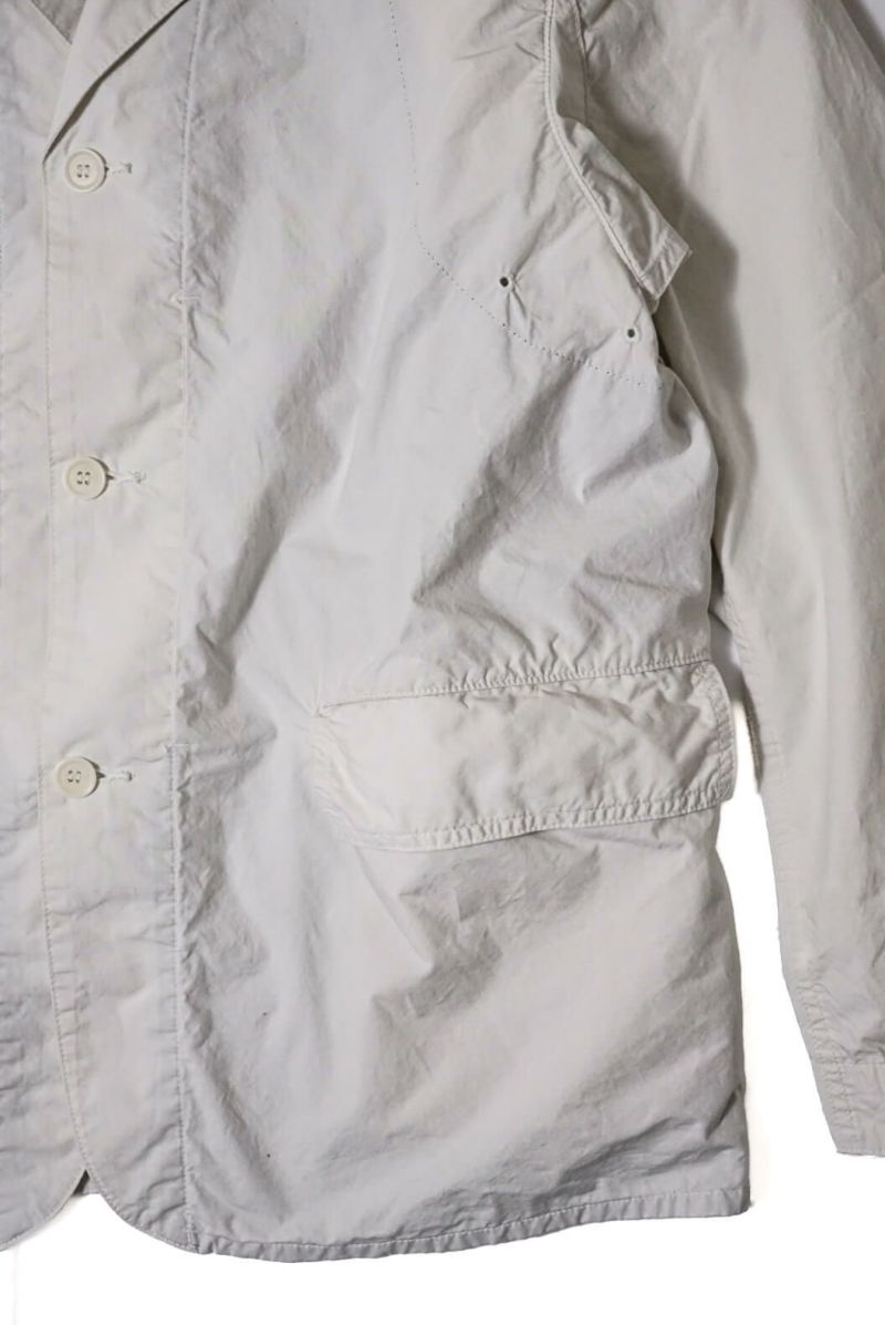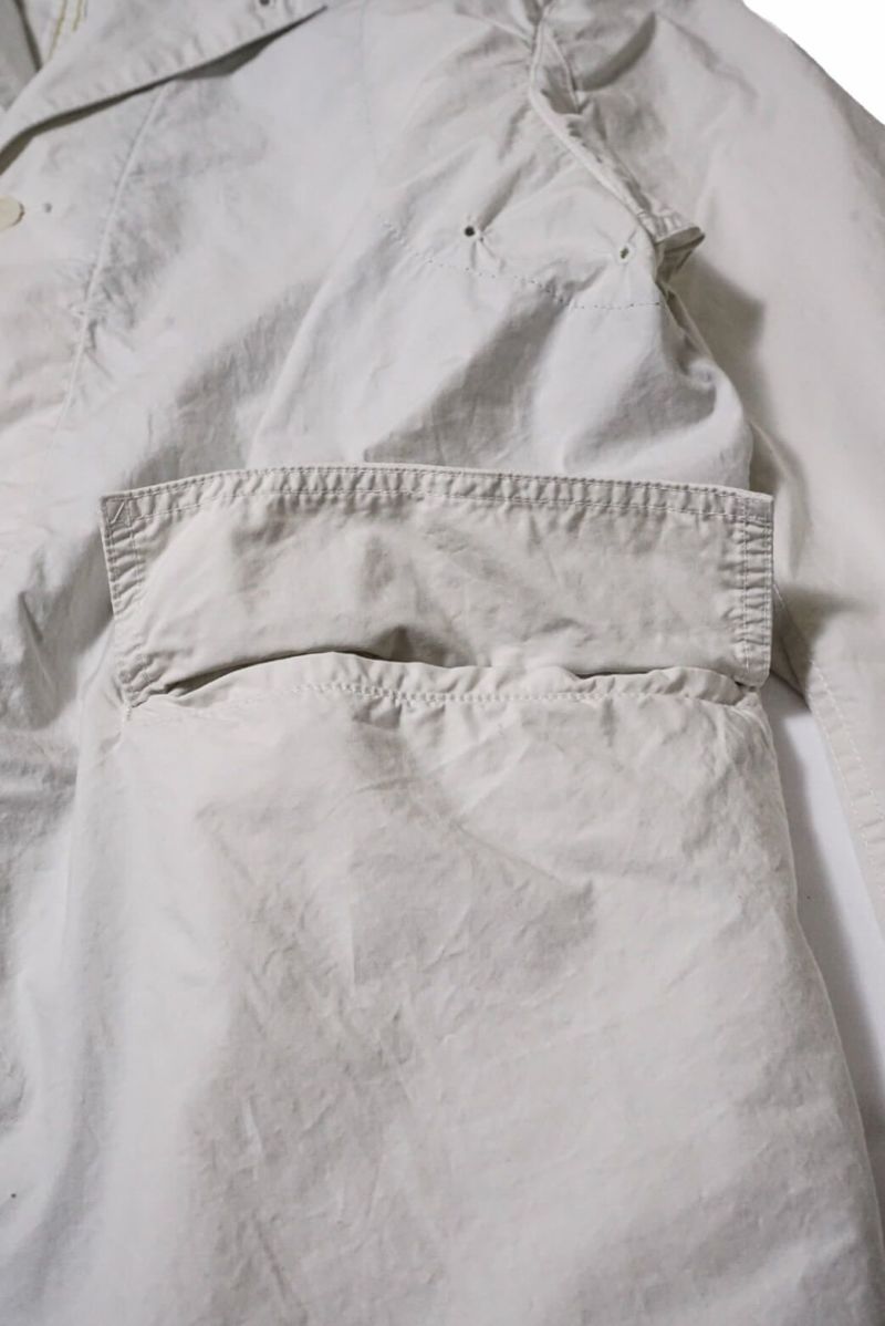 前中心の内側からアクセスできる独特な内ポケットは裏地も兼ね、ジャケット全体に立体感を持たせています。さらに、袖のシルエットや脇下の仕様など、全体にミリタリーフィールドジャケットの要素がさり気なく散りばめられている点も特徴です。このジャケットは、CORONAの中でカジュアルテーラードジャケットのような立ち位置のアイテムです。