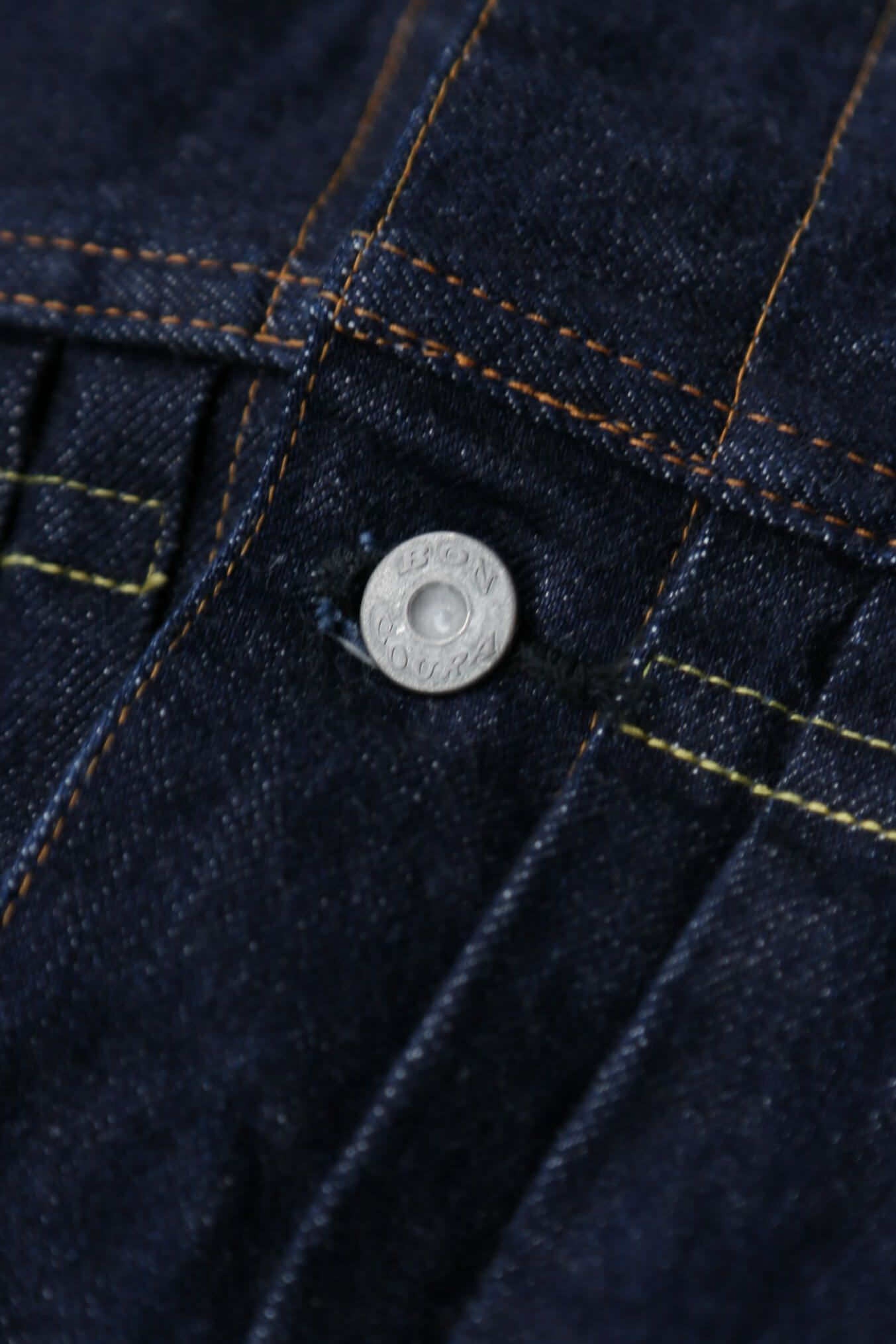パーツも勿論妥協無くBONCOURA謹製オリジナルパーツを使用。着込んで行くことでパーツもデニムと同じようにエイジングしていきます。縫製はジーパン同様綿糸縫製にこだわることでデニム生地と共に縫製糸もエイジングしていきます。BONCOURAのこだわりと熱量が詰まったGジャンを是非育てて頂きたいです。