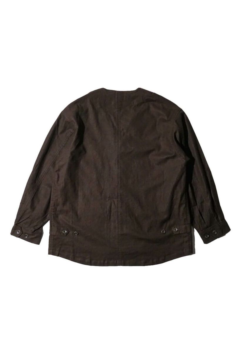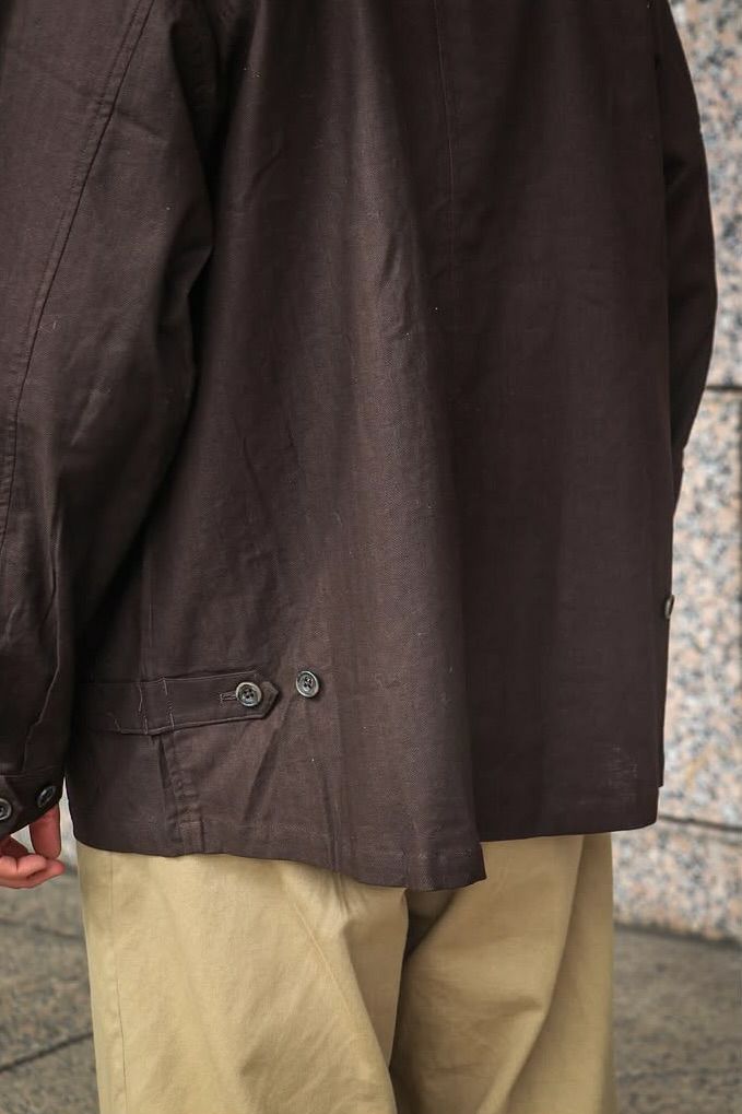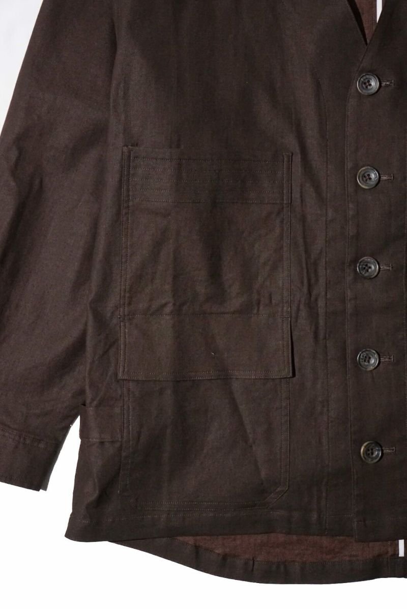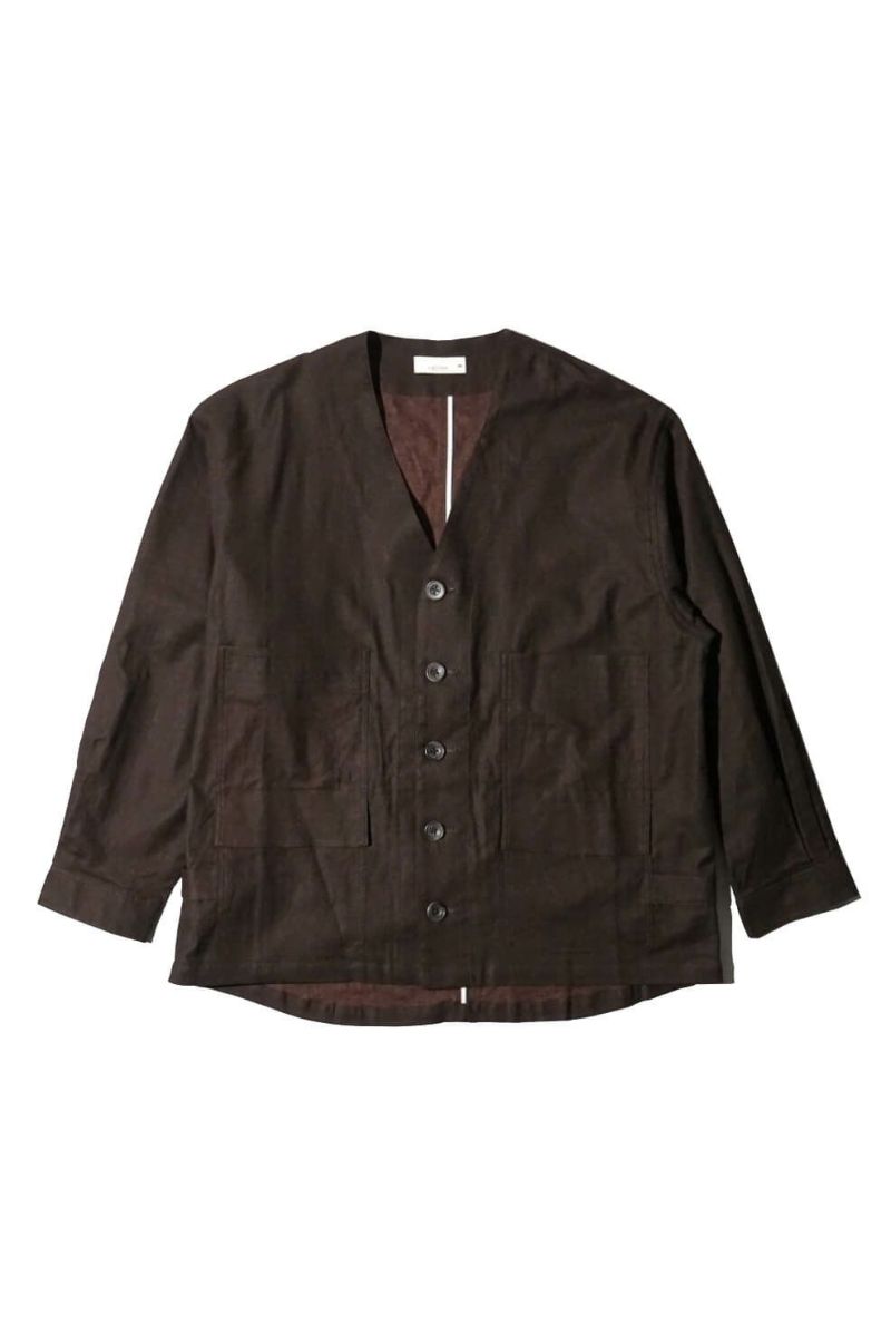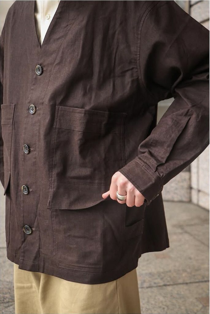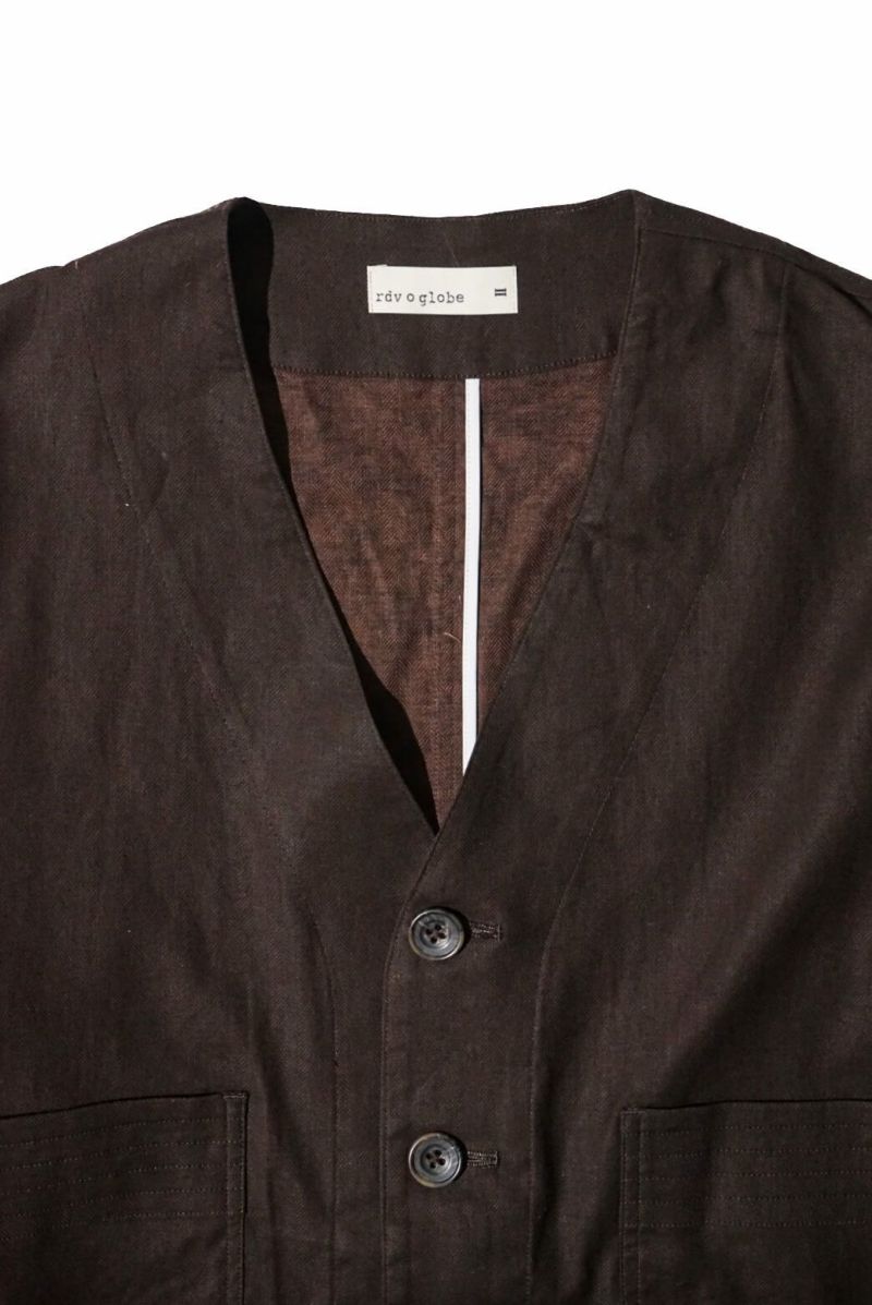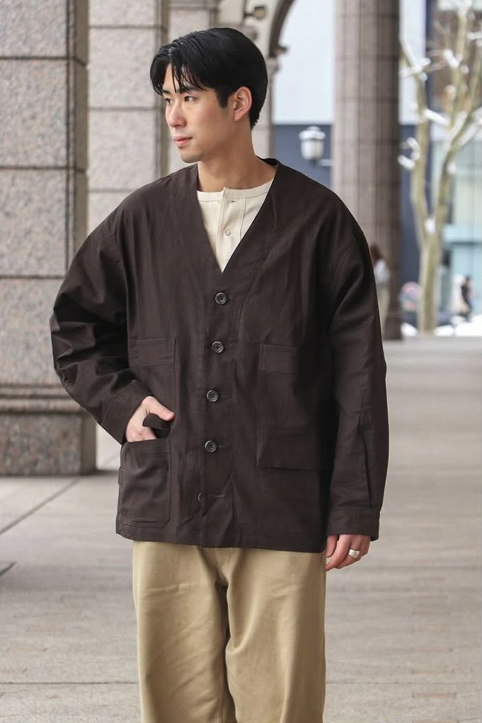 rdv o globeからNOAH VE.をリリース。素材にはベンガラ墨コーティングを施したリネン・コットンヘリンボーン素材を使用しております。地染め後、ベンガラと墨でコーティングを原反ワッシャーを行い手作業で染めたようなランダムなシワ感、自然なムラ感が現れます経年変化したような雰囲気と和テイストが特徴です。ノーカラーのデザインでカーディガンのようにインナーとしても活躍できるデザインです。フロントには4つのポケットがデザインされておりハンティングジャケットに用いられるクラシカルなフラップ付きの腰ポケットもあり機能性も完備しております。サイドにはアジャスターが施されており立体的なシルエットもお楽しみいただけますのでぜひお試しください。