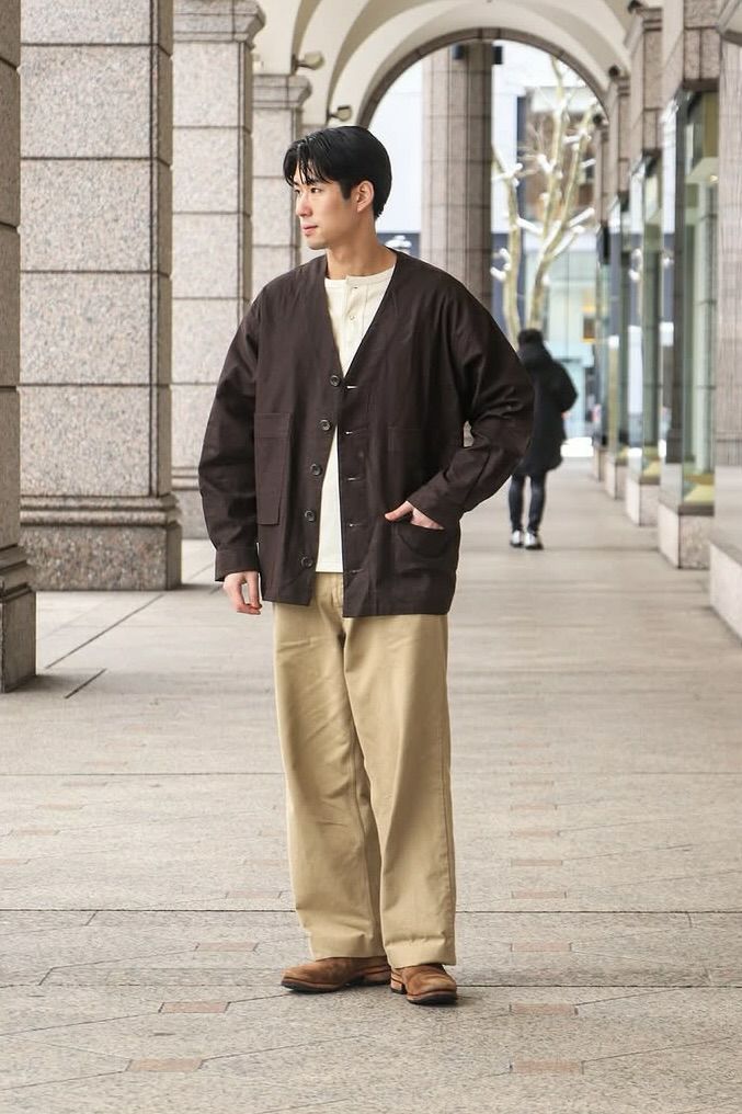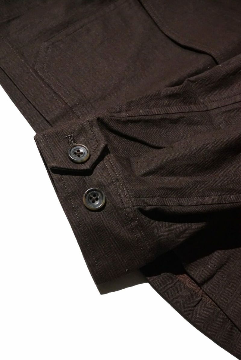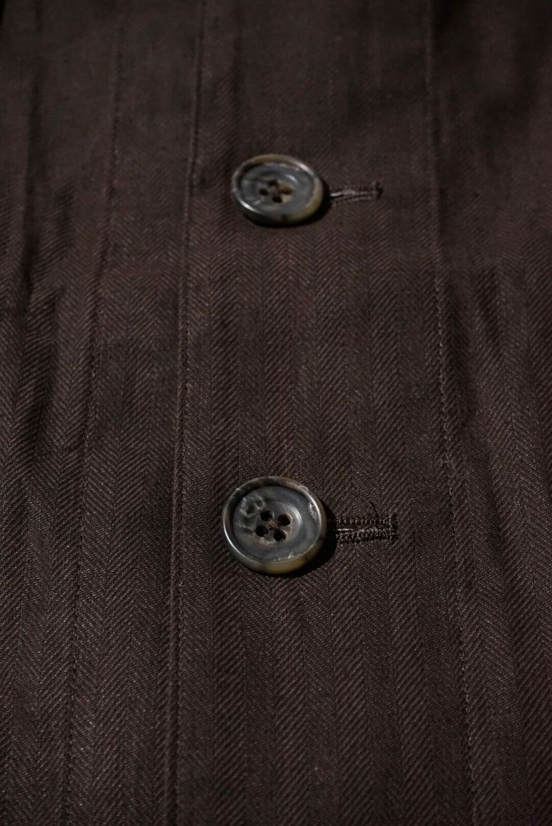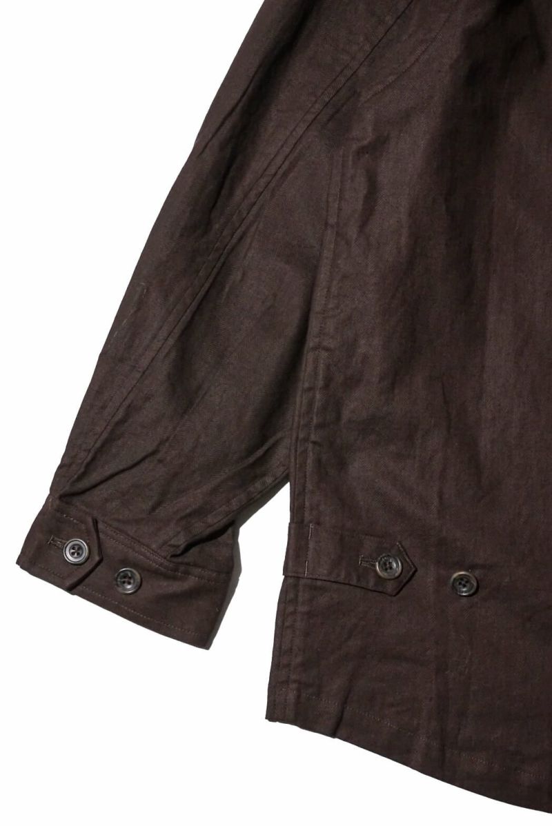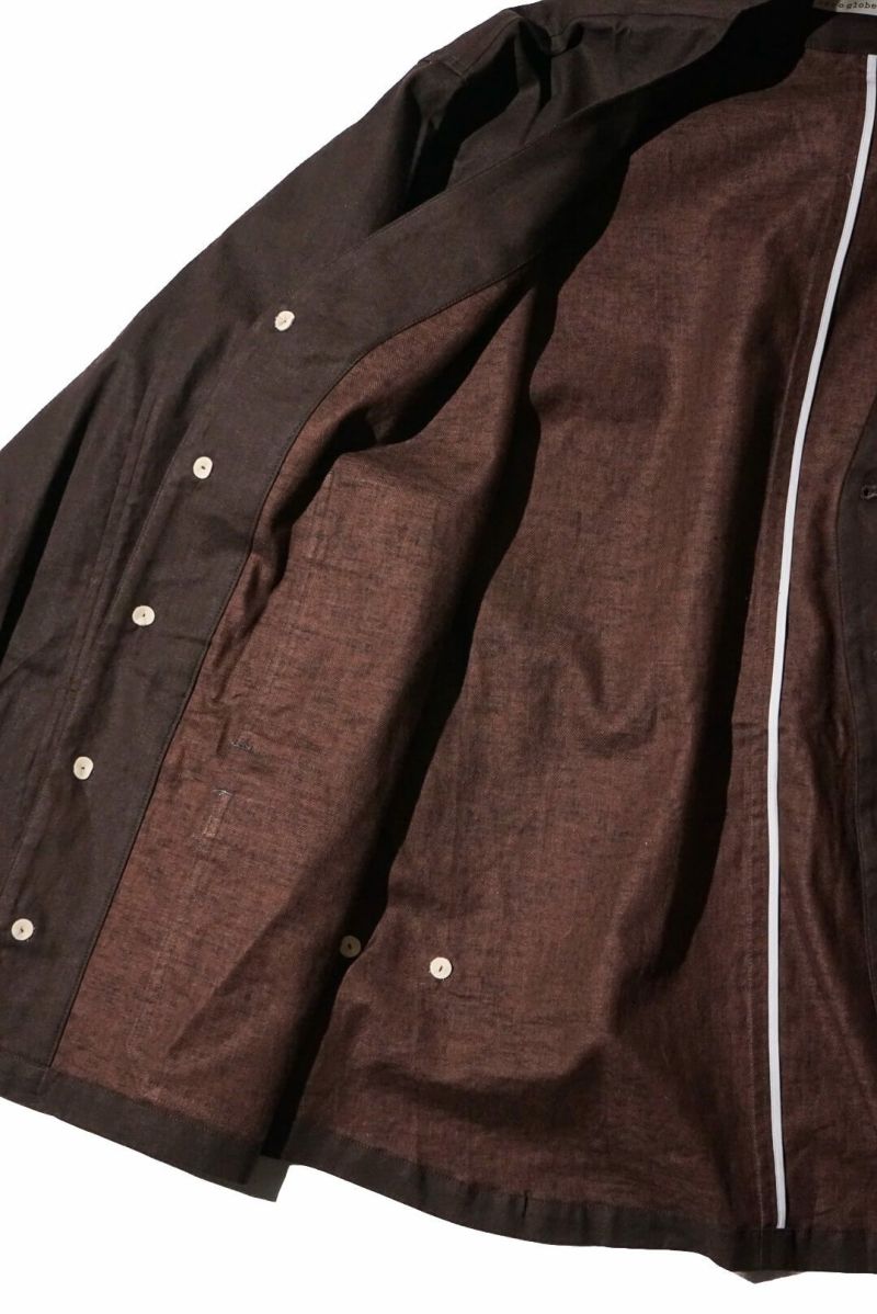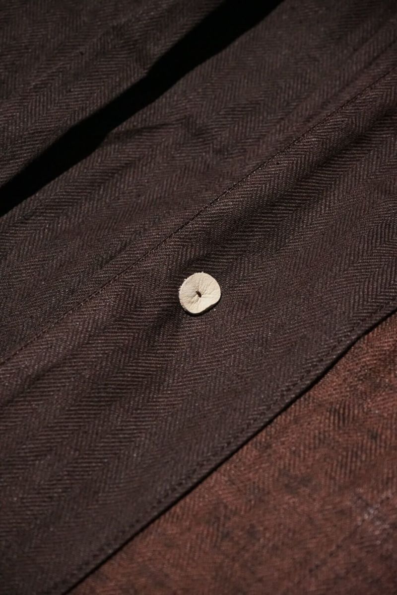 rdv o globeからNOAH VE.をリリース。素材にはベンガラ墨コーティングを施したリネン・コットンヘリンボーン素材を使用しております。地染め後、ベンガラと墨でコーティングを原反ワッシャーを行い手作業で染めたようなランダムなシワ感、自然なムラ感が現れます経年変化したような雰囲気と和テイストが特徴です。ノーカラーのデザインでカーディガンのようにインナーとしても活躍できるデザインです。フロントには4つのポケットがデザインされておりハンティングジャケットに用いられるクラシカルなフラップ付きの腰ポケットもあり機能性も完備しております。サイドにはアジャスターが施されており立体的なシルエットもお楽しみいただけますのでぜひお試しください。