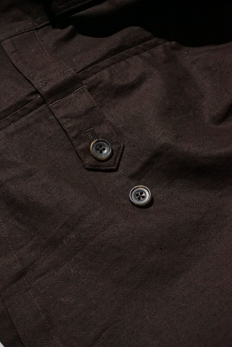 ヴィクトリアンスタイルにミリタリー、ワークといったディテールを加え、いまの時代に合ったシルエットをつくり上げ、素材、縫製から全てジャパンメイドに仕上げている。