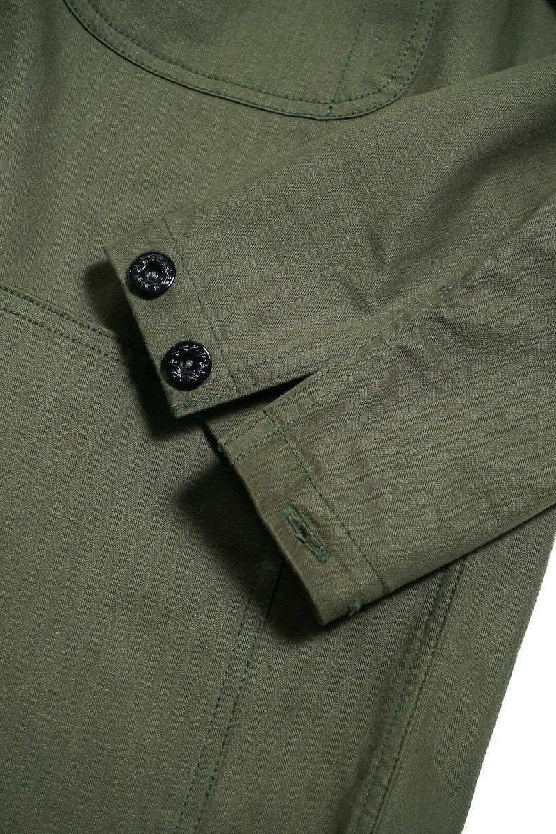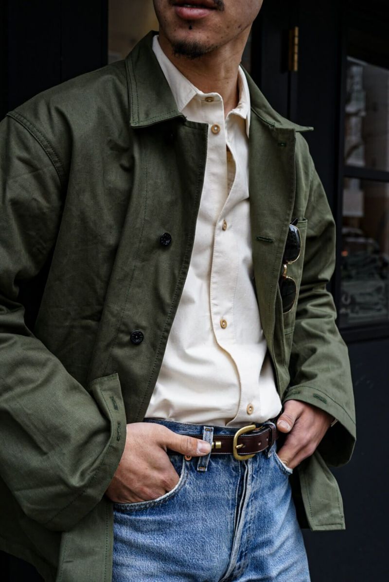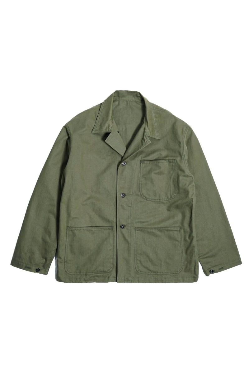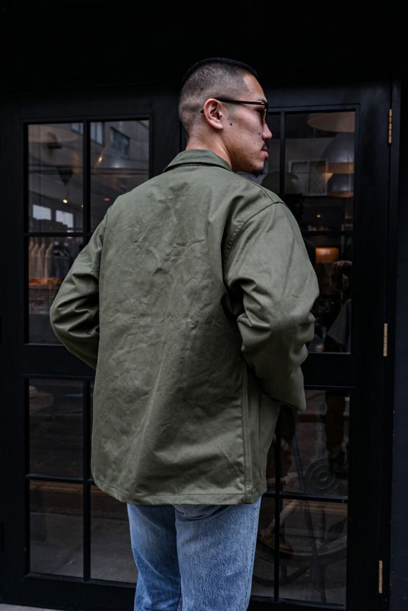 MSG & SONS(エムエスジーアンドサンズ) 1940年代、第二次世界大戦期にUS NAVYへ支給されていたN-3 UTILITY JACKETをデザインソースに製作された1着。 このジャケット最大の特徴は、あらゆるミリタリーアイテムの中で最もパターン数が少なく、とにかく無駄のないアイテムであるということ。パターン数が6枚で形成され、なによりも量産の効率性を考えられています。背中のはぎが無く、袖は一枚袖。現代で考えると、贅沢に製作された仕様です。 生地については、この年代のミリタリーアイテムを代表するヘリンボーンツイルで当時のオリジナルに合わせた染色工程を見い出し、生地カラー(デットストック品)を忠実に再現。黒塗装されたドーナツ型の月桂樹が刻印されたタック釦は、当時と同じように型取りを行い、鉄製と同じ素材で製作しています。 アメリカらしい、当時のクラシックなユニフォームを、これからの時代にむけて再構築されたアイテム。時代背景の意味や意義を大切に考え、文化や歴史を紐解いて製作されています。 <素材> COTTON 100% <生産国> MADE IN USA 商品についてのブログはこちら MSG & SONS / N-3 JACKET - MADE IN USA PRICE : ¥69,300(税込み) 品番 : 921201