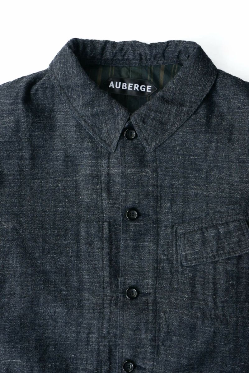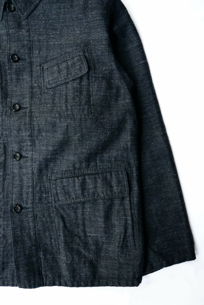 経糸にインディゴリネン、緯糸にウールを使用した独特な生地は他に見ない独特なスラブ感や着心地が特徴的です。インディゴの色移りを防ぐために取り付けられる裏地には、ヴィンテージのPASCAL JACKETと呼ばれるワークジャケットをオマージュして限定カラーの裏地が取り付けられております。