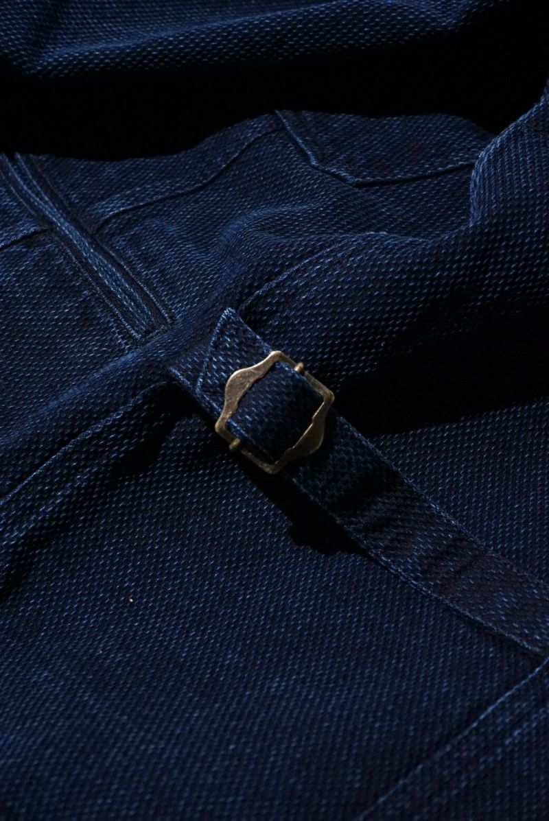60'sイギリスのエンジニアジャケットをイメージしてリデザインした立ち襟・ラグランスリーブのショート丈ジャケット。月桂樹ネオバーボタン使用、後身左右のアジャスターによりフィット感も調整可能。素材としての当ブランド定番のインディゴ染めの刺し子生地を使用し、ボールバイオ加工を施している。