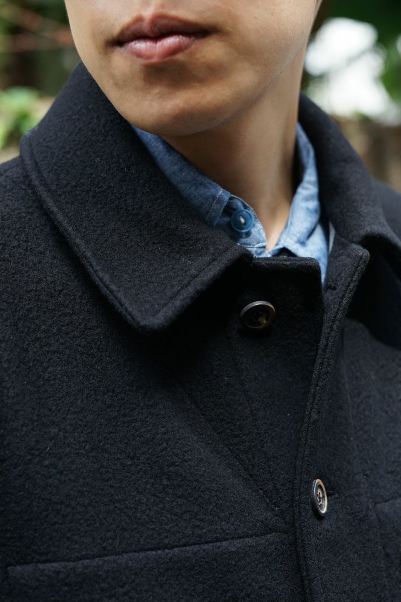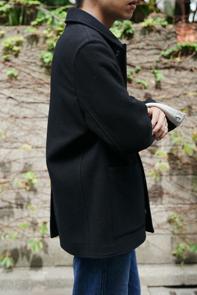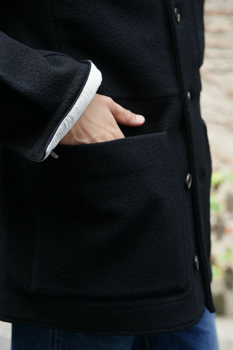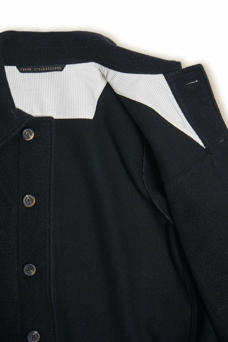 ワークジャケットをベースとしたforme d'expressionの1着。デザイナーの得意とするドレーピングのテクニック、洗練された素材使いによって、クラシックな洋服がベースにありながらも、スタイリッシュかつモダンな印象に仕上げられています。