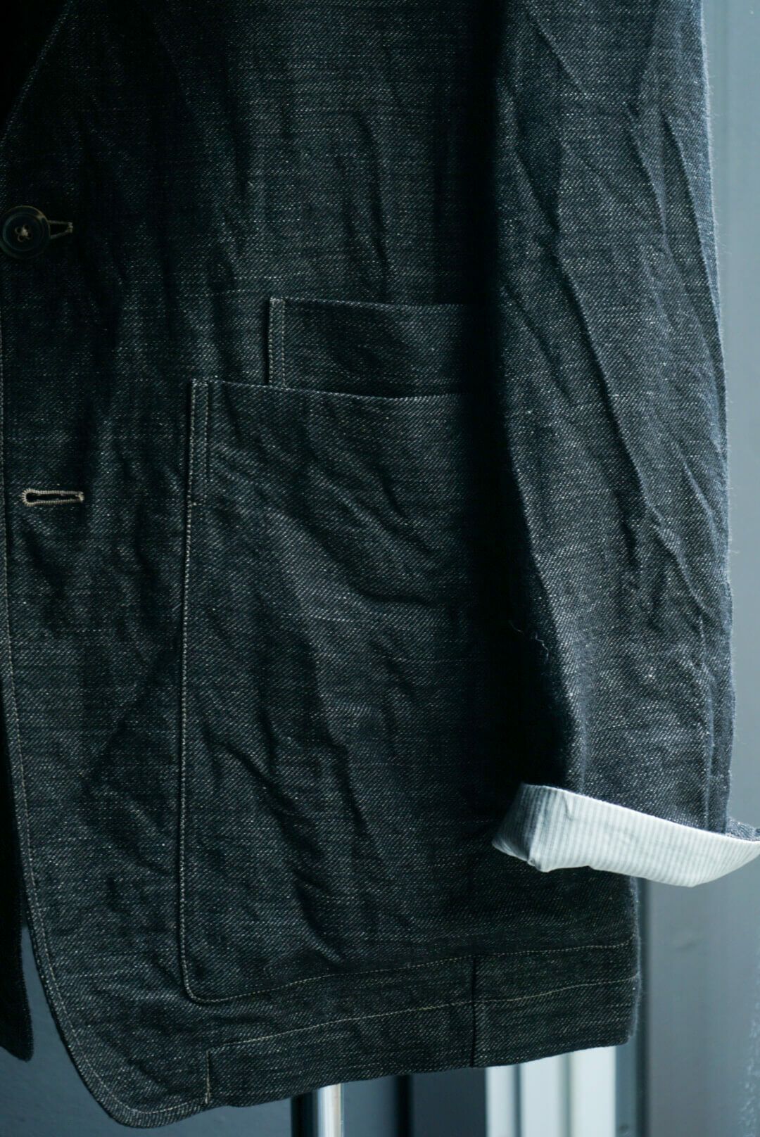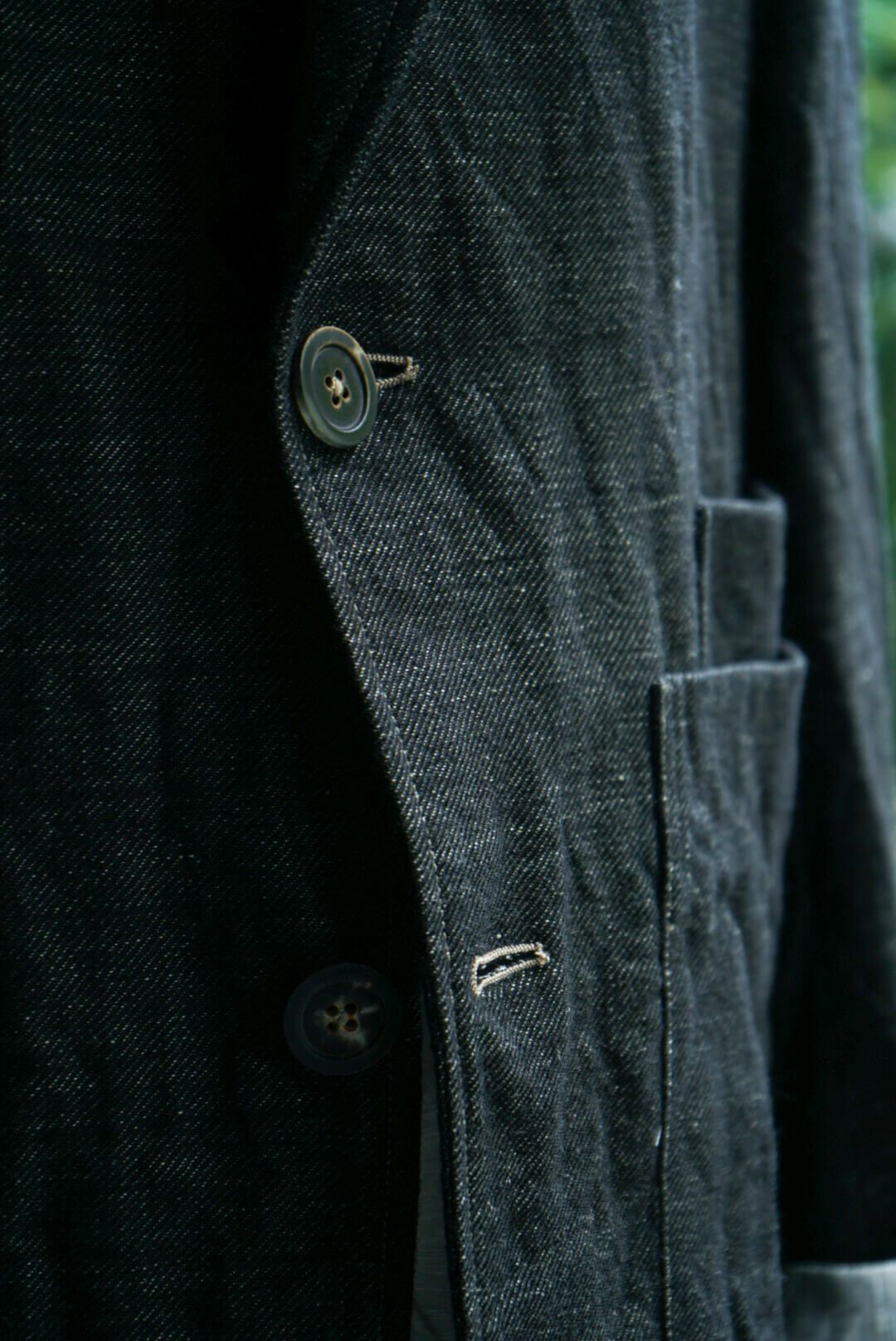 一頭の羊から最初に刈り取ることができるヴァージンウールを贅沢に使用した1着で、生地はなんとブラックデニム。細かく走るステッチワークはヨーロッパのカバーオールを連想させます。