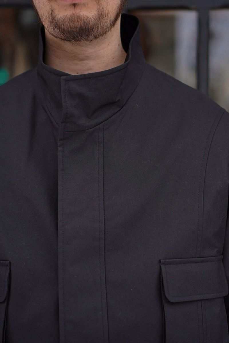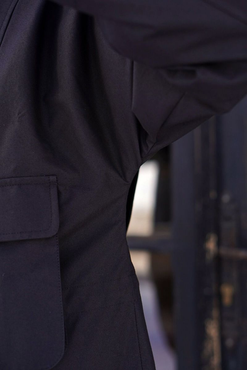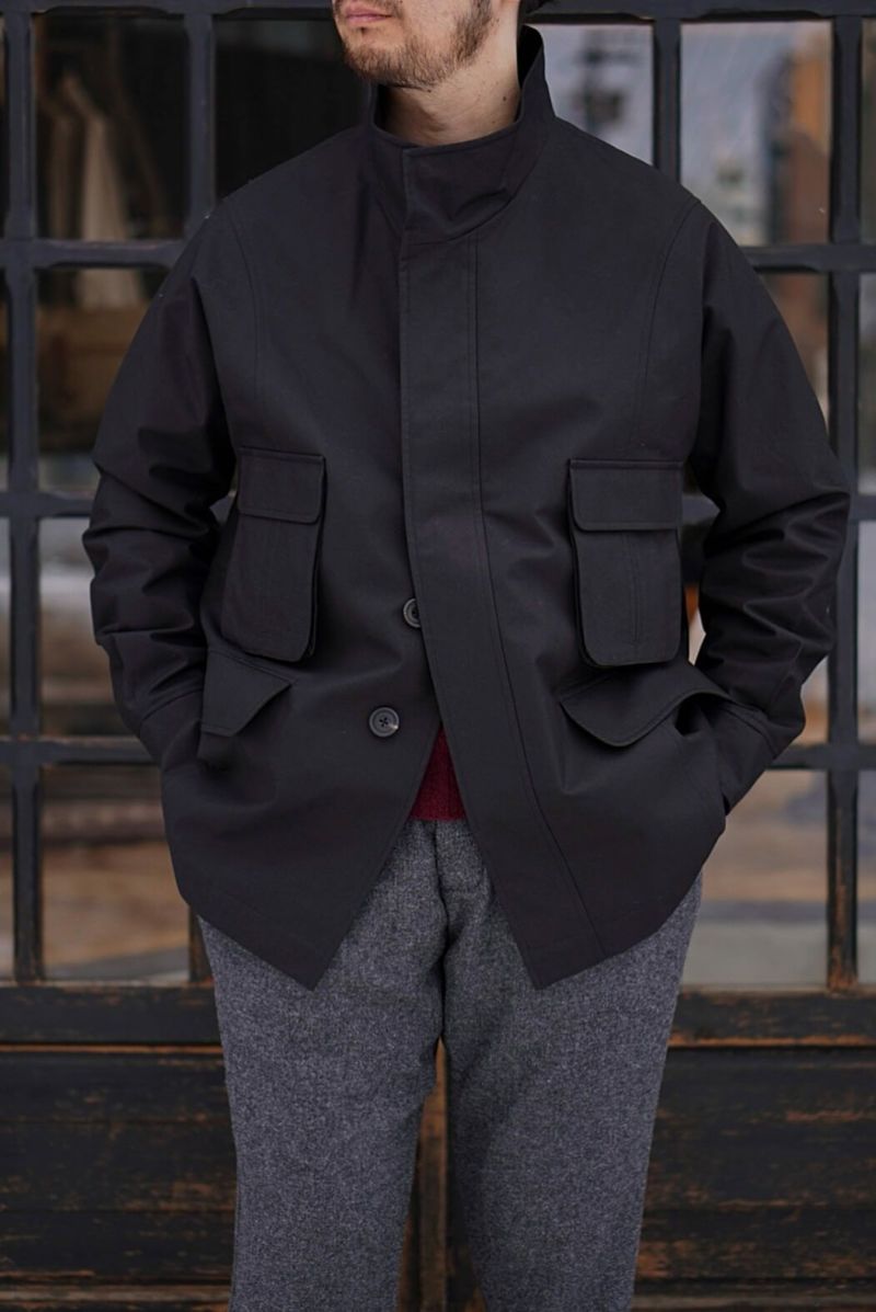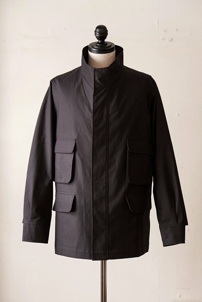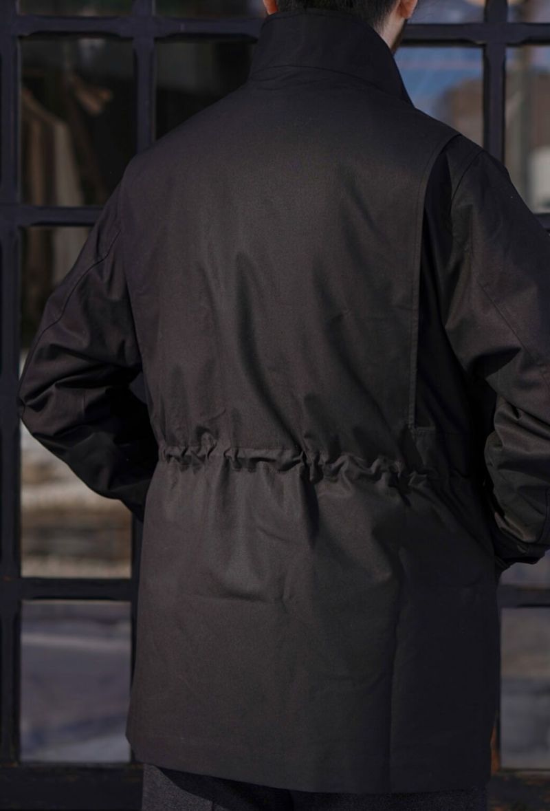 スタンドカラー、5つのポケット、ウエストにはドローストリングを施した4つボタンのフィールドジャケット。 背面には「アクションバック」と呼ばれる、前方への動く範囲を広げることが可能な仕様や、屈んだ時にも邪魔にならないポケットの付け位置など、長時間着用してもストレスを感じないよう、細部までこだわり抜いたディテールの一枚です。 素材にはランカシャー州で製造された、高密度のコットン生地に撥水性のあるドライワックス加工を施した物を使用しています。 雨に強いだけでなく、コットン素材ならではの通気性も持ち合わせるため、真夏以外の長いシーズンに渡って着用できるのが魅力です。 100% COTTON