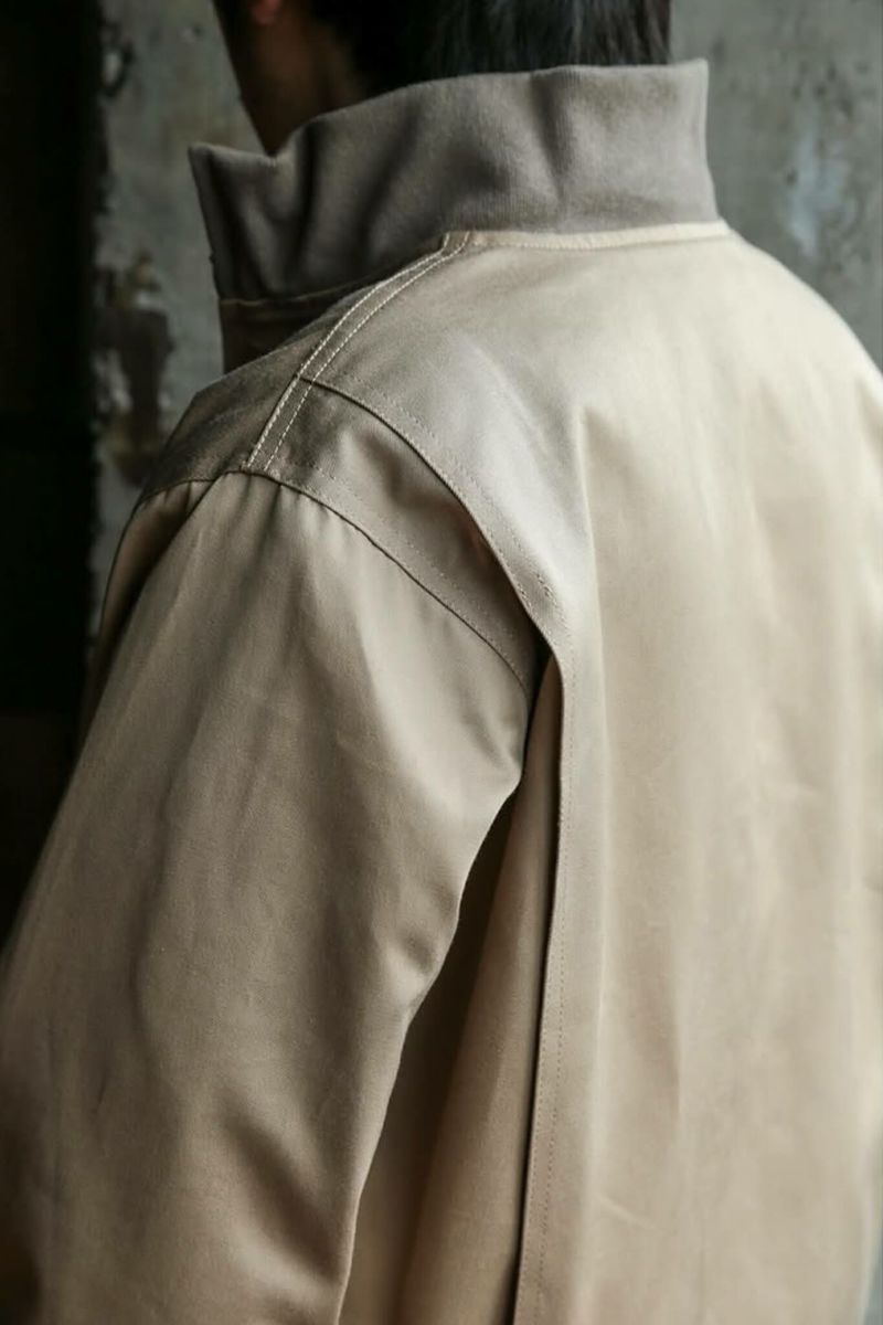 経糸・緯糸のすべてに海島綿を使用したタンカースジャケット。ヴィンテージ感のある凹凸があり、本来相反する上質な質感とタフさをを両立したハイブリッドなチノ生地です。
