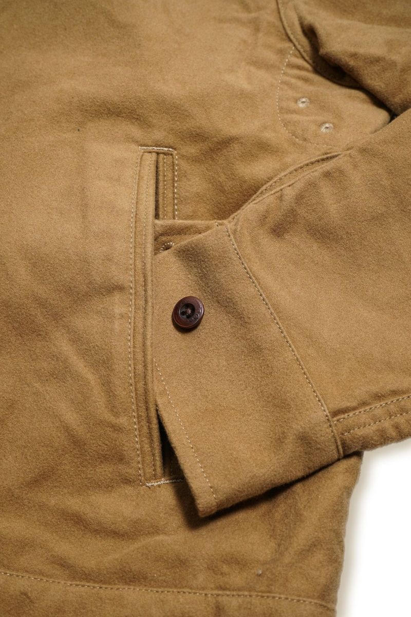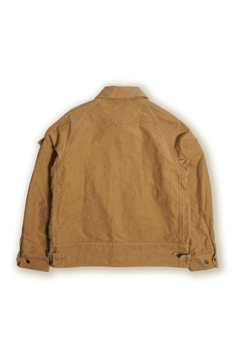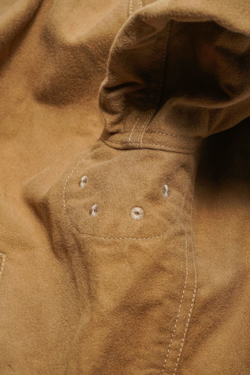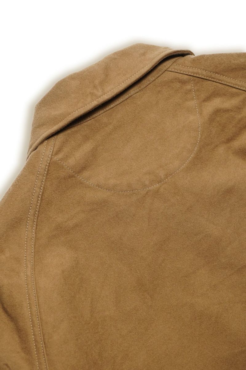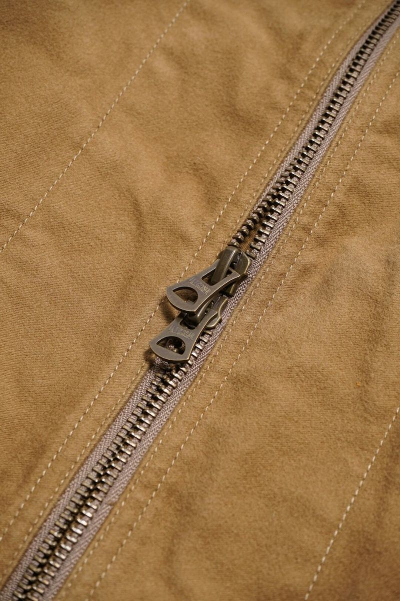 シガレットポケットを叩きつけた。シンプル極まりないフォルムだが、襟下のファスナー口に叩いたタブや腰ポケットの玉淵にたこ糸を入れるなど細かいディティール使いは当ブランドならでは。素材はオーガニックコットンを高密度で織り上げ、起毛加工を施したモールスキン。シルエットはストレートだが腰ベルト尾錠にて裾のアジャスト、フロントのダブルファスナーで調整できる仕様。