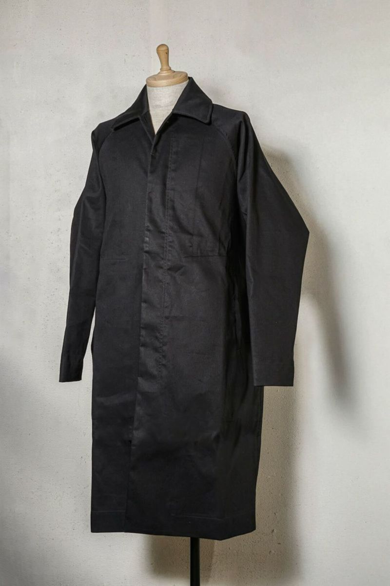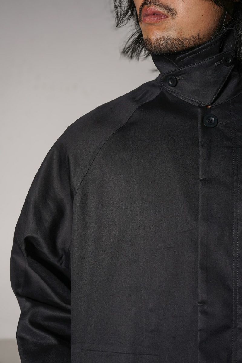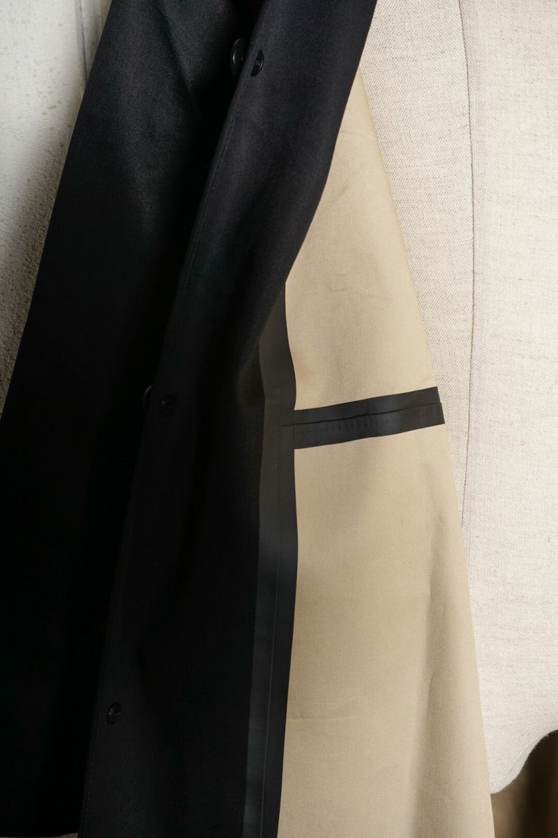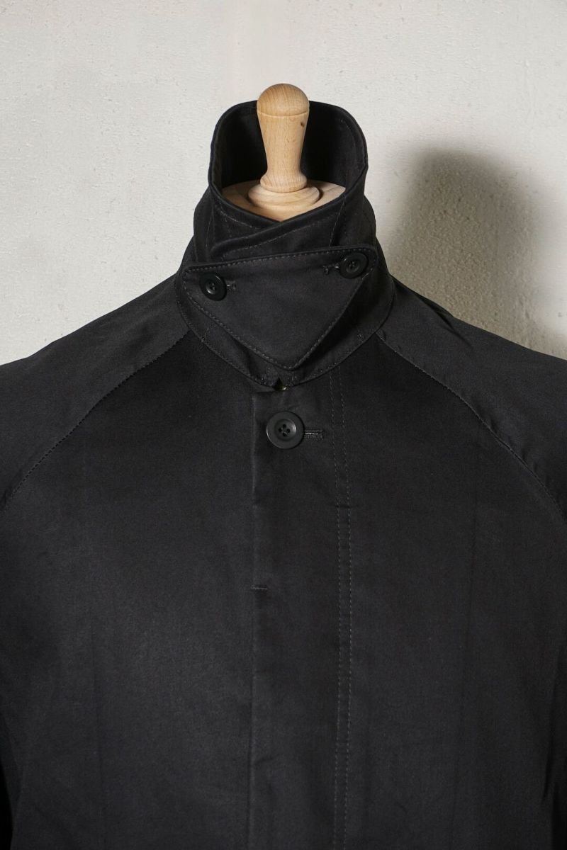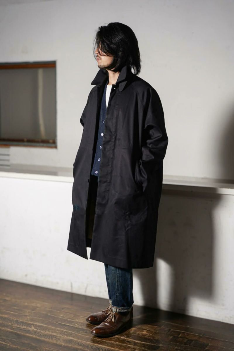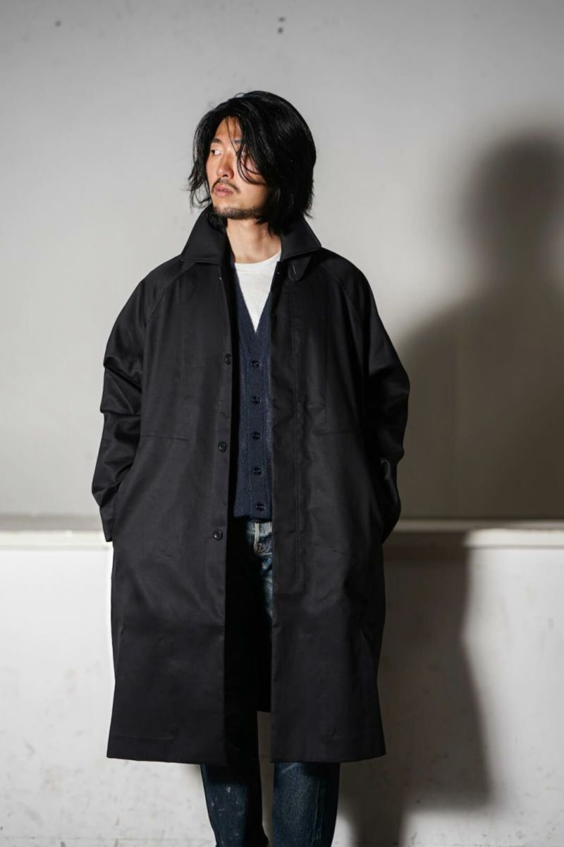 天然の撥水性を備えた高密度コットンキャンバスを使用したマックコート。ラグリンスリーブ、リラックスしたドレープ感、比翼仕立てのフロント仕様のスタイリッシュな1着です。裏地はありませんが、縫い目にはシームテープが配されており、軽量ながら保温性、撥水性に優れています。コットンキャンバスならではのエイジングも楽しみなコートです。