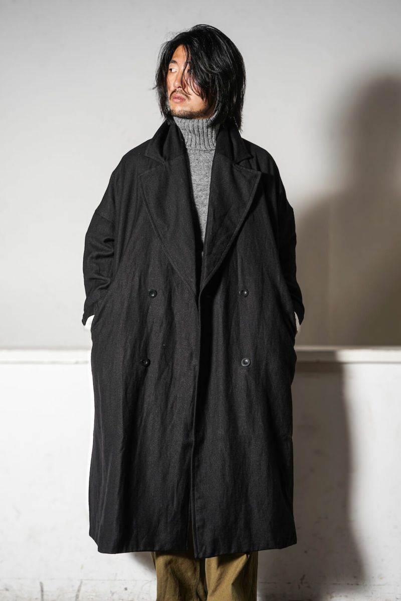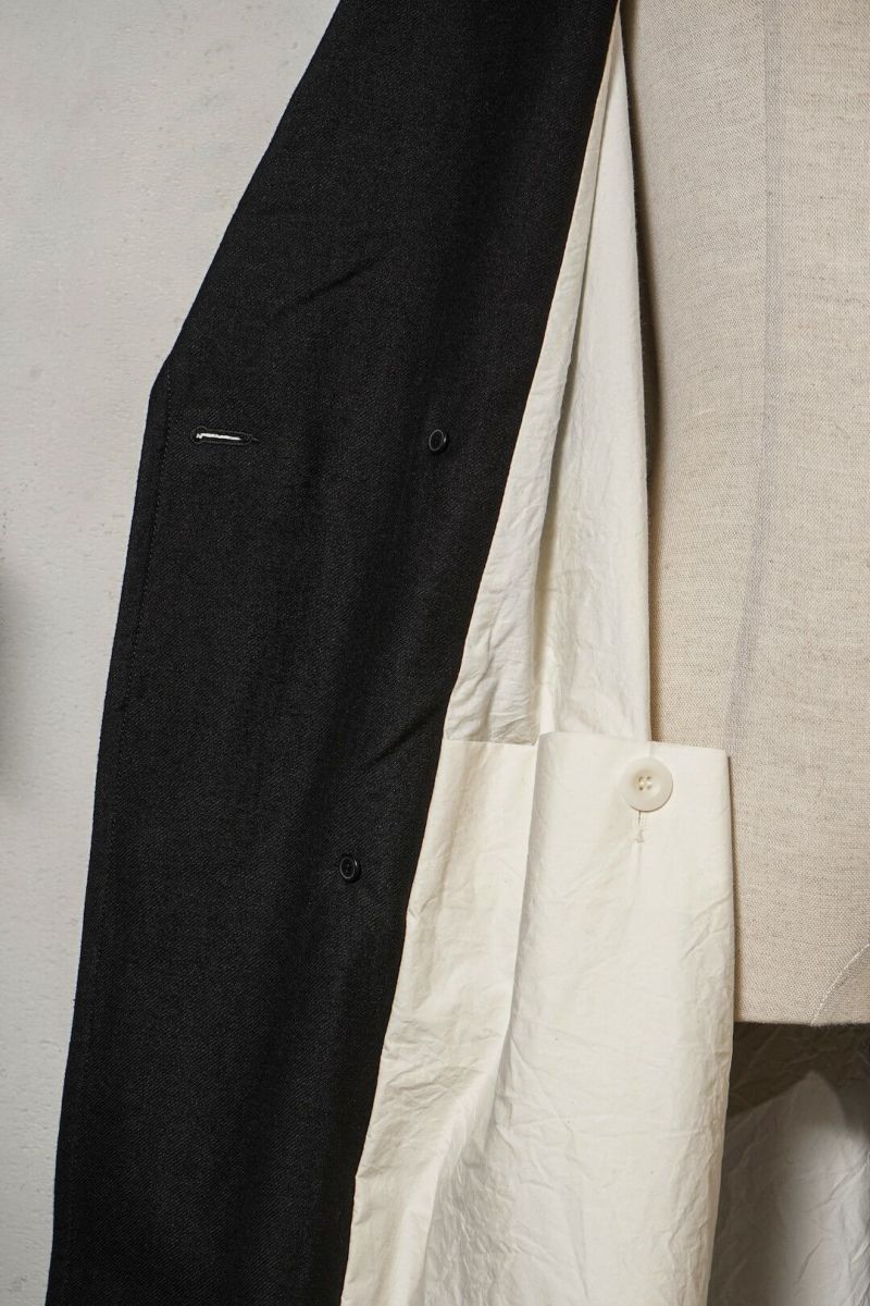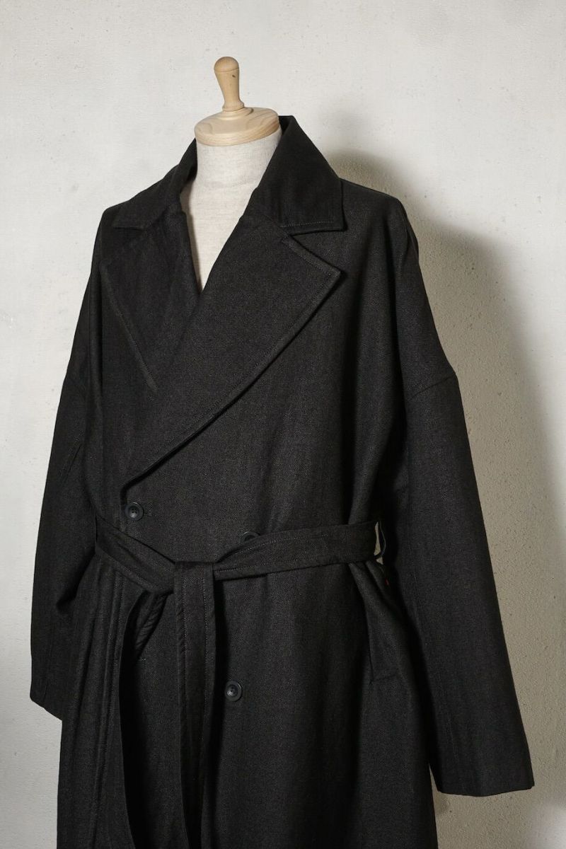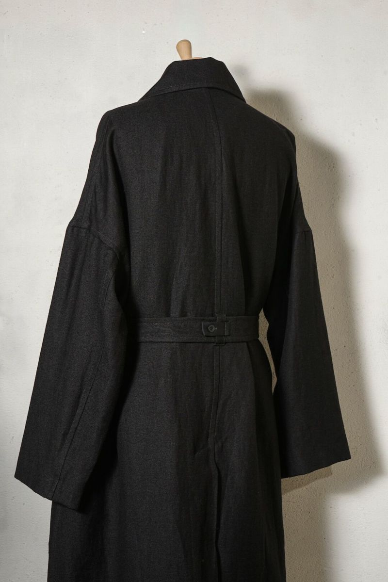 テーラードカラー、シルエットを調整するための取り外し可能なウエストベルトを備えた、迫力のあるダブルブレストコート。素材はリネンの通気性とウールの暖かさを両立した混紡生地を使用しています。自然なドレープ感と深みのある風合い豊かな生地感が魅力的です。