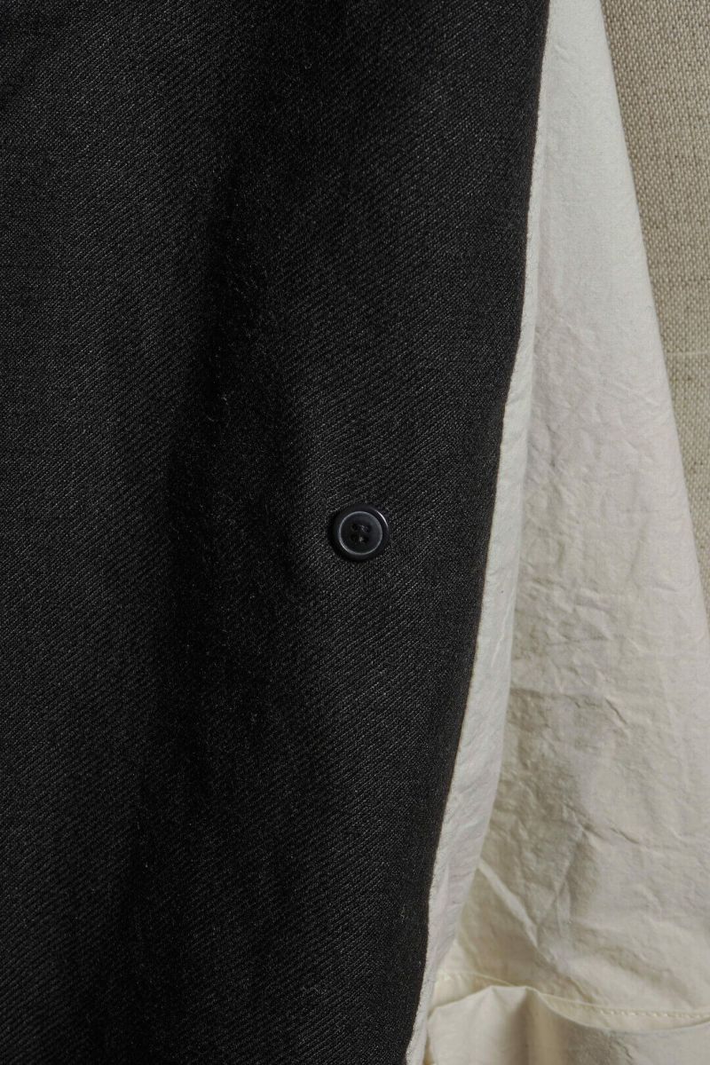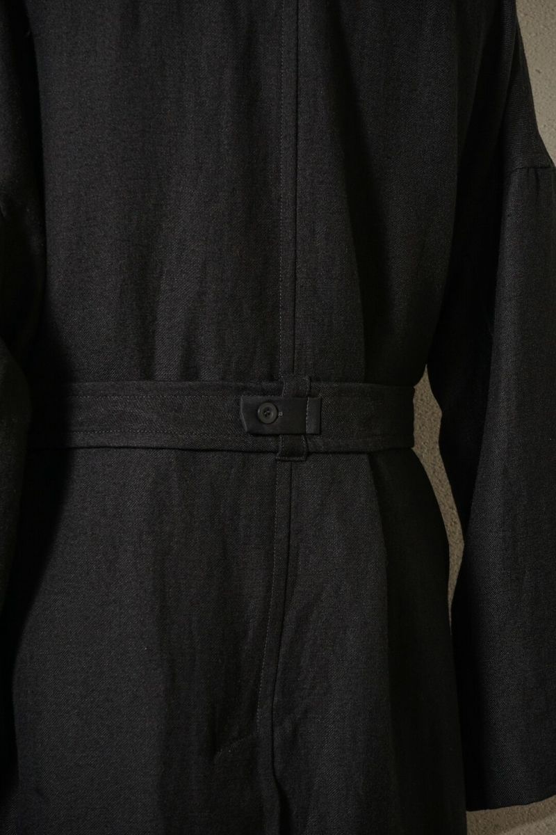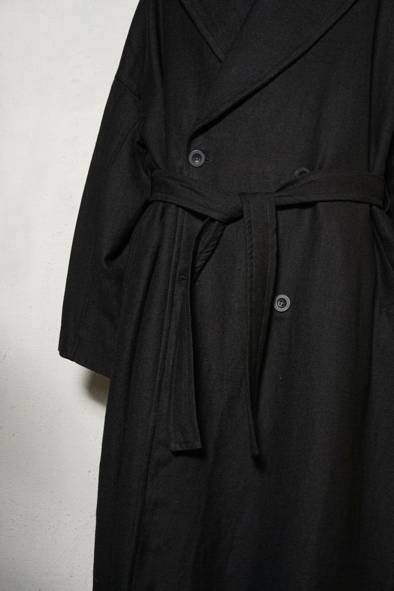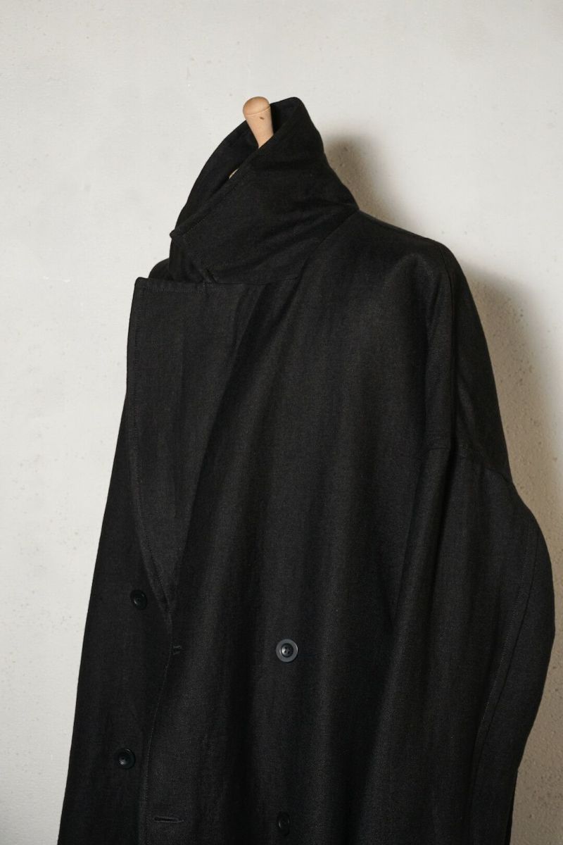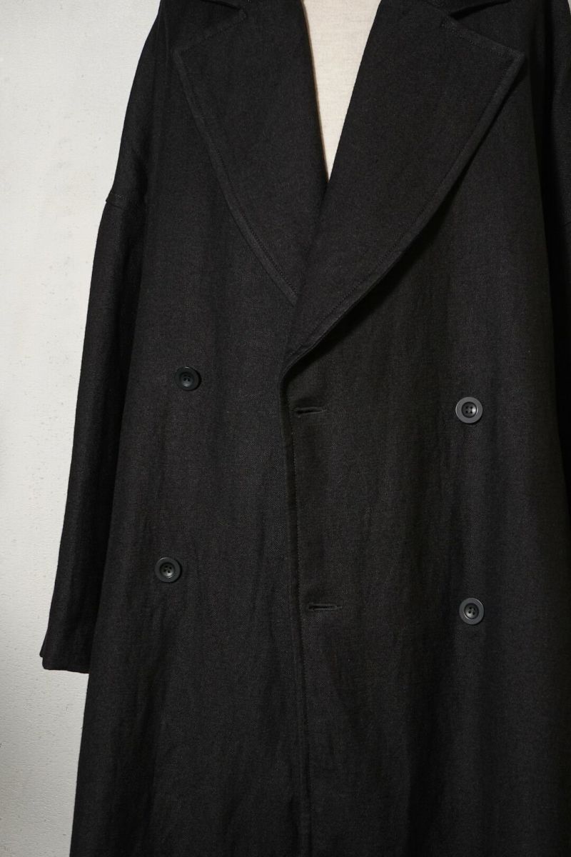 テーラードカラー、シルエットを調整するための取り外し可能なウエストベルトを備えた、迫力のあるダブルブレストコート。素材はリネンの通気性とウールの暖かさを両立した混紡生地を使用しています。自然なドレープ感と深みのある風合い豊かな生地感が魅力的です。