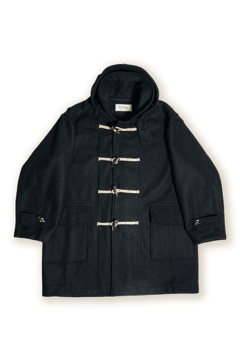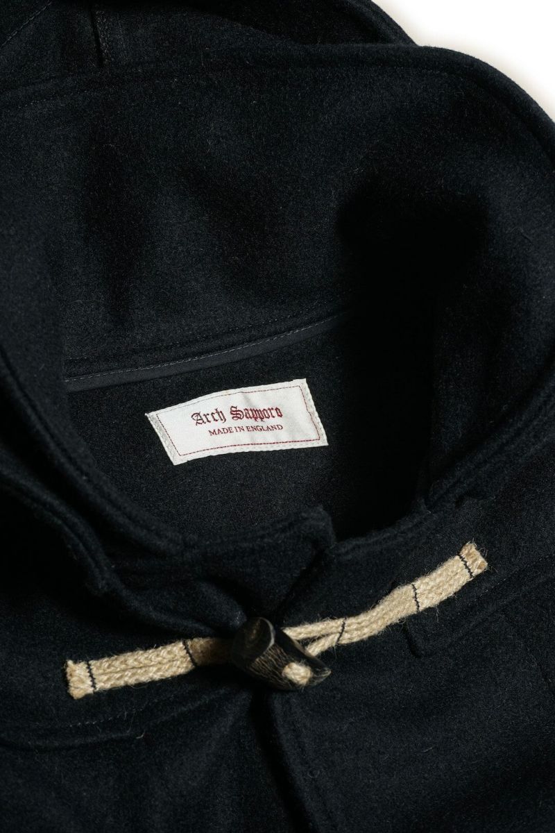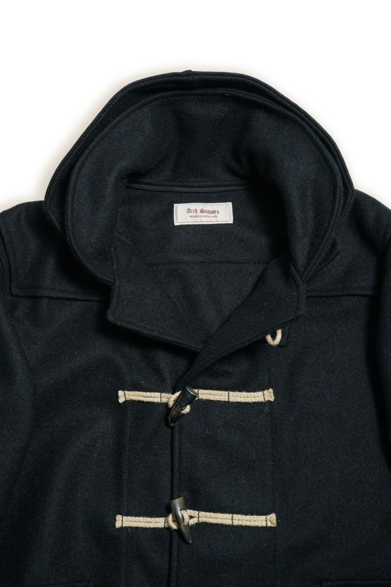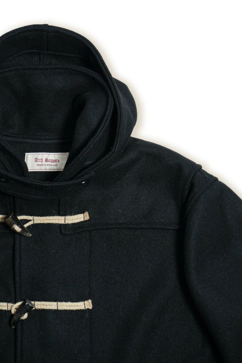弊社オリジナルレーベルArch Sapporo英国製企画の高密度ウールメルトンを使用したダッフルコート。デザインのベースとなっているのは、1960~70年代頃に英・G社が生産していた、ラウンドカラーに取り外し可能なフード、着丈はミドルレングスという、非常にユニークな仕様のダッフルコートです。