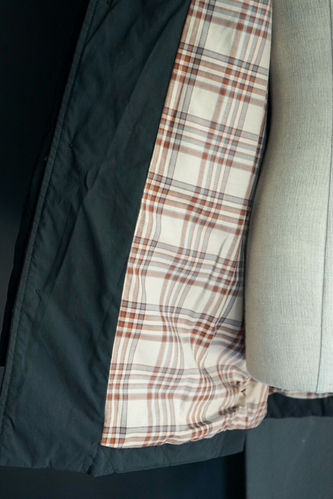 その当時の割繊技術を使ってフランス伝統のスクエアキルト素材に加工し、当時パリを席巻していたH社のキルティングJK風に仕上げました。襟には英国ブリベンモスのコーデュロイ、さらにサイドスリットも施されています。