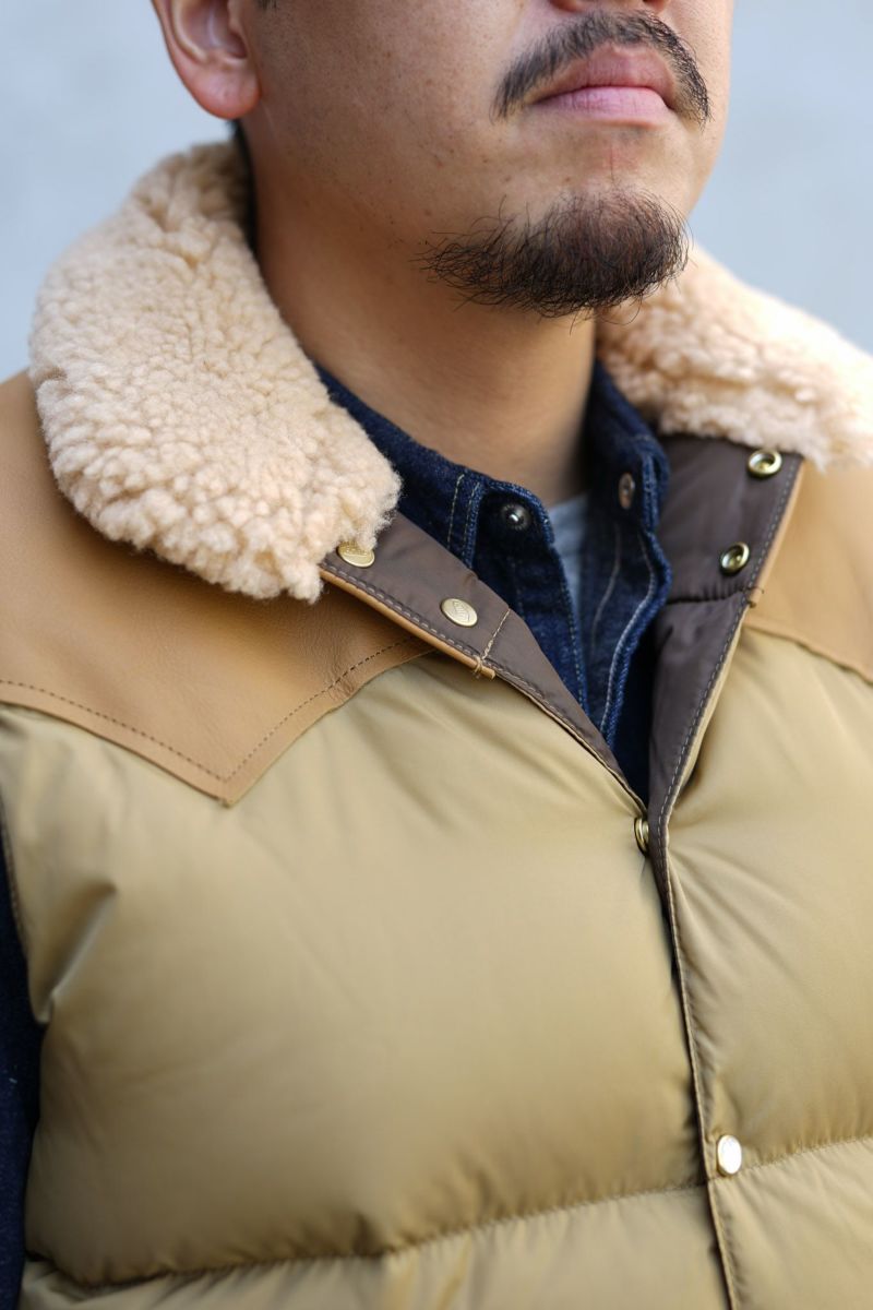 Rocky Mountain Featherbedのオリジナルアイテム、クリスティーベスト。一枚裁ちのヨークレザーと襟の天然ムートンが特徴的なモデルです。