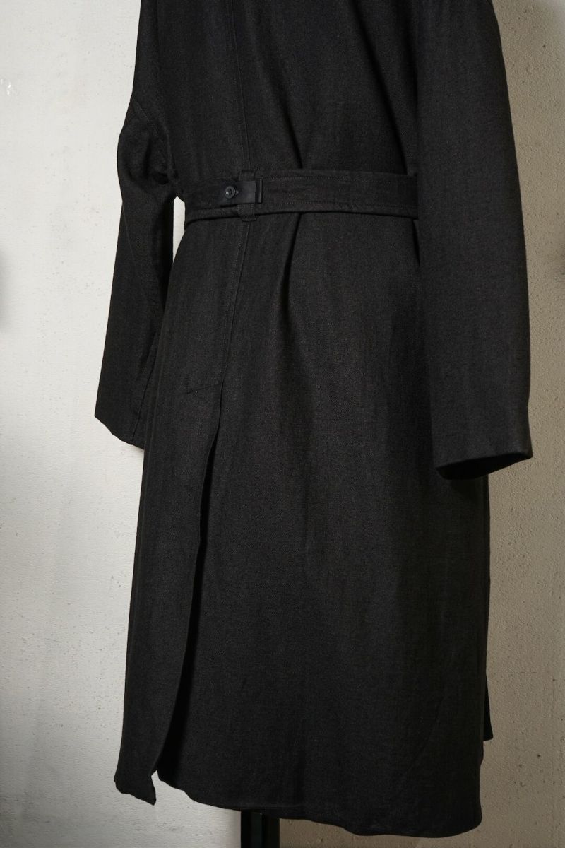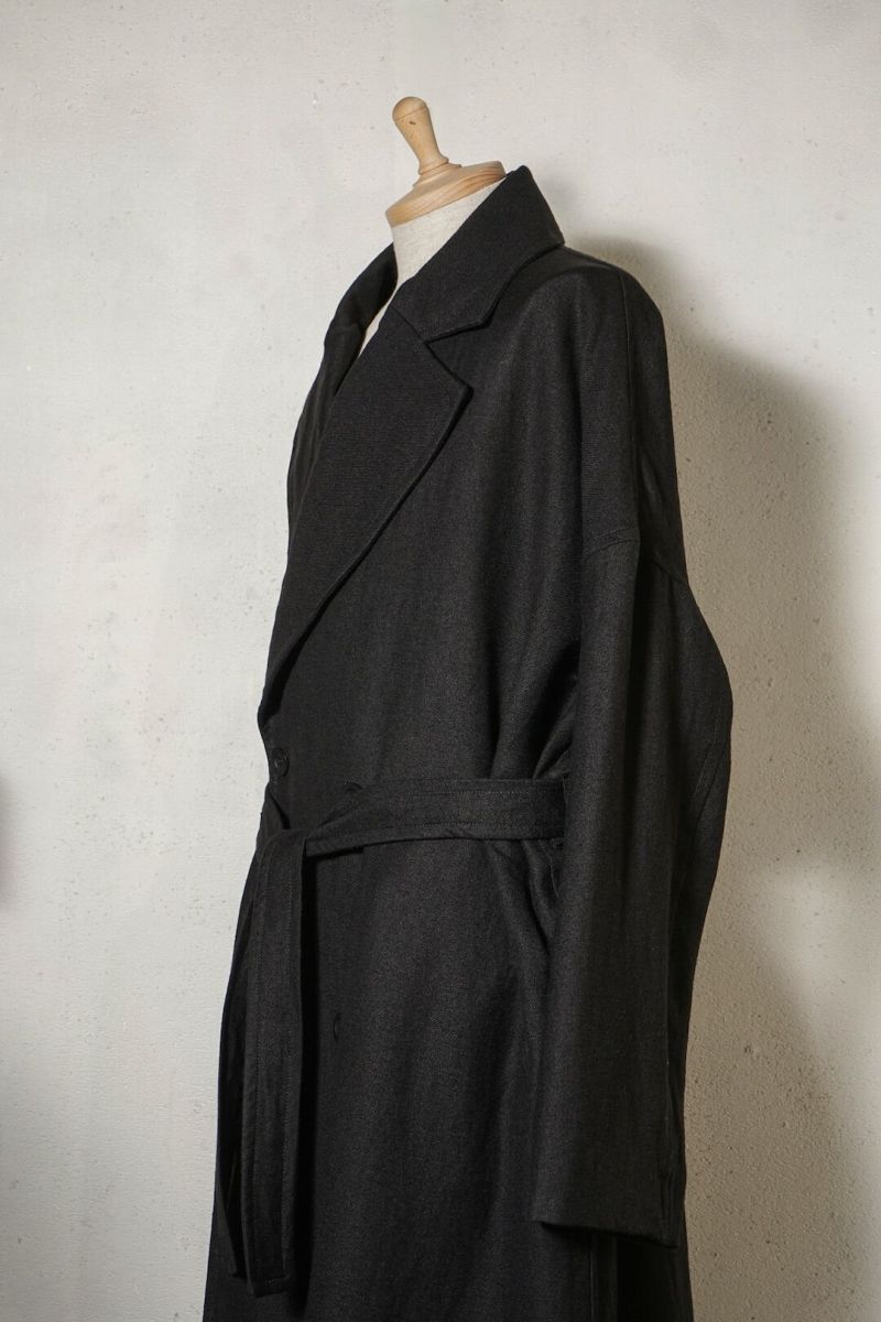 テーラードカラー、シルエットを調整するための取り外し可能なウエストベルトを備えた、迫力のあるダブルブレストコート。素材はリネンの通気性とウールの暖かさを両立した混紡生地を使用しています。自然なドレープ感と深みのある風合い豊かな生地感が魅力的です。