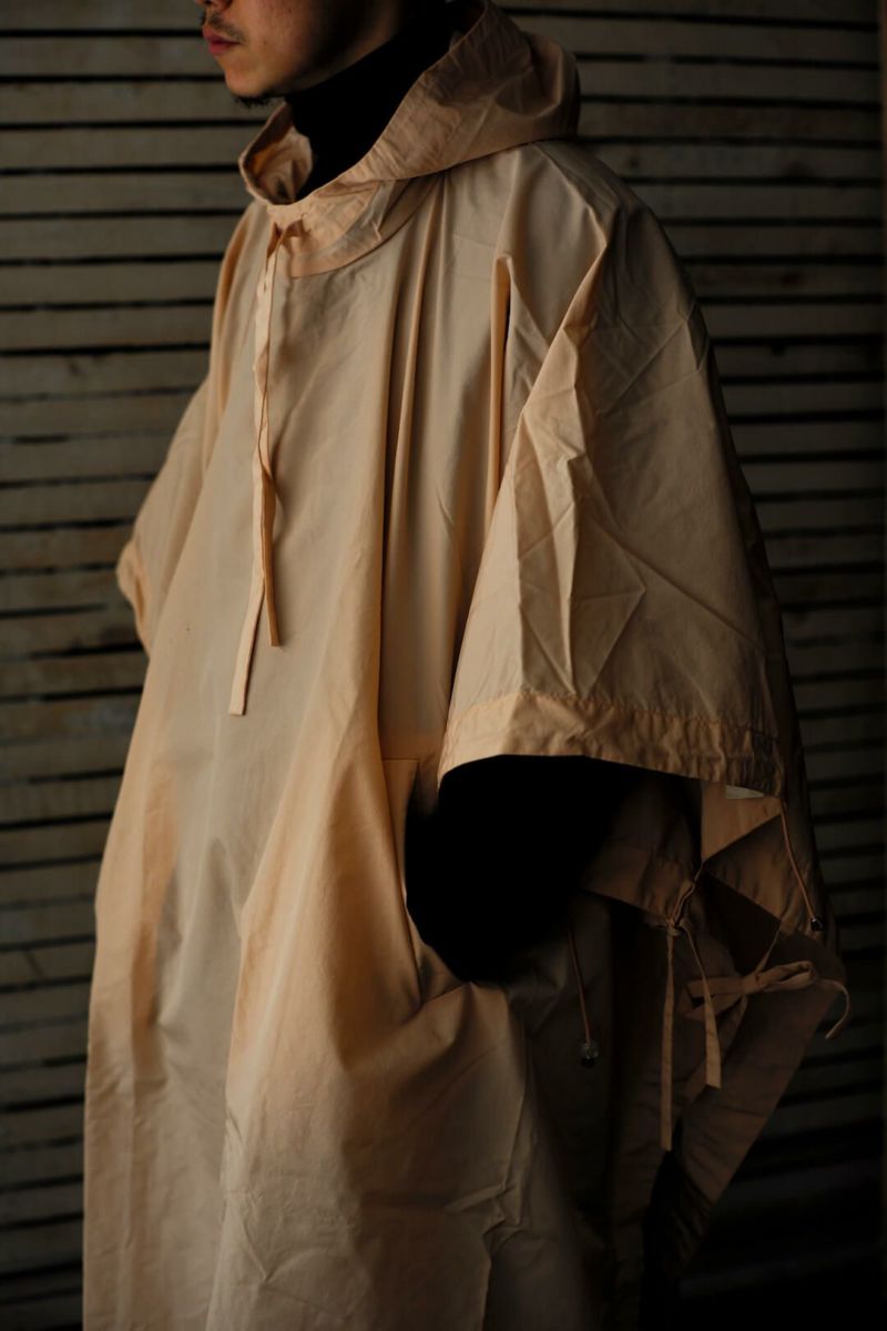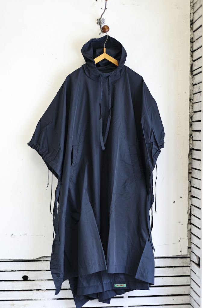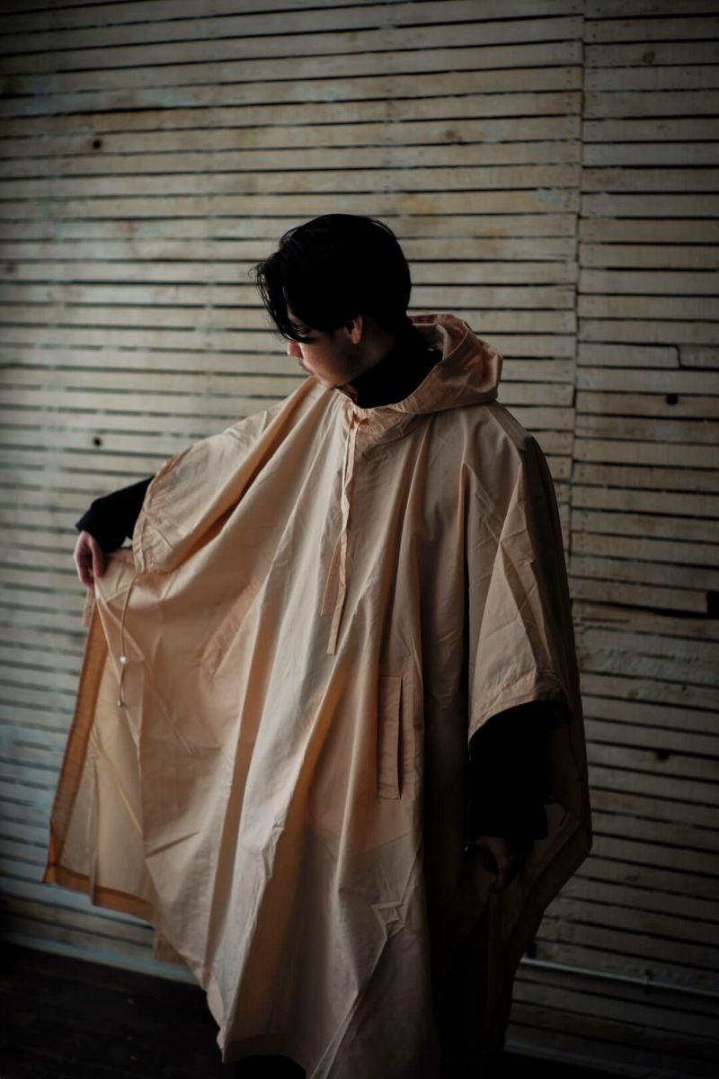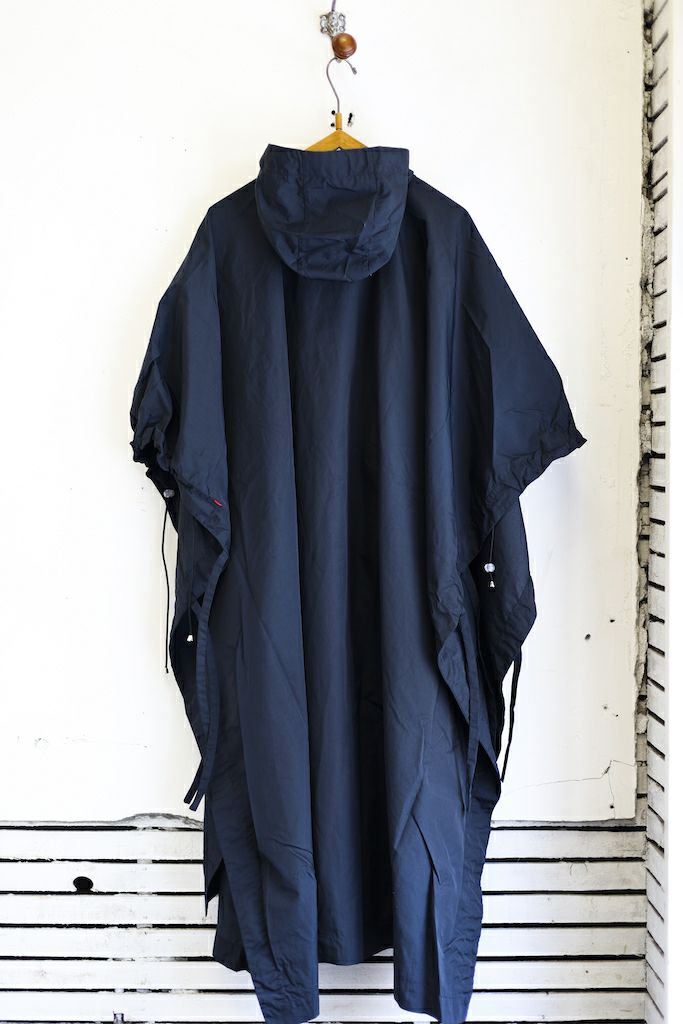 CASEY CASEYらしいドレープ感が特徴的なロングポンチョ。長方形にカットされたパターンですが、着用する事で抜群のシルエットを描きます。素材は撥水性に富んだ生地なので、悪天候やレジャーシーンでも活躍する一枚です。CASEY CASEYは勿論、KENNETH FIELD等のジャケットの上から着ても相性抜群。普段のコーディネートにプラスワンするだけで、また違うスタイルが生まれるはずです。